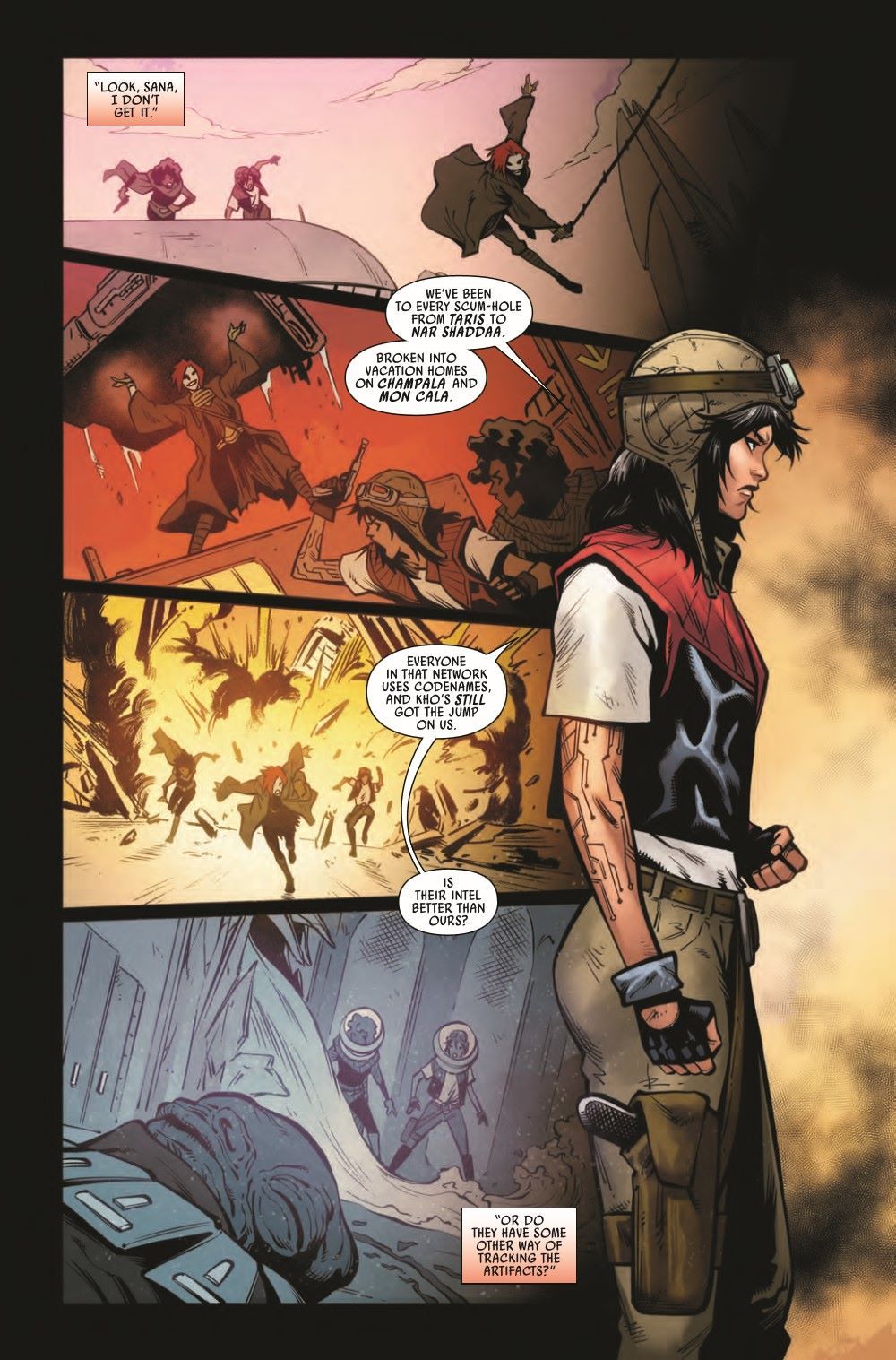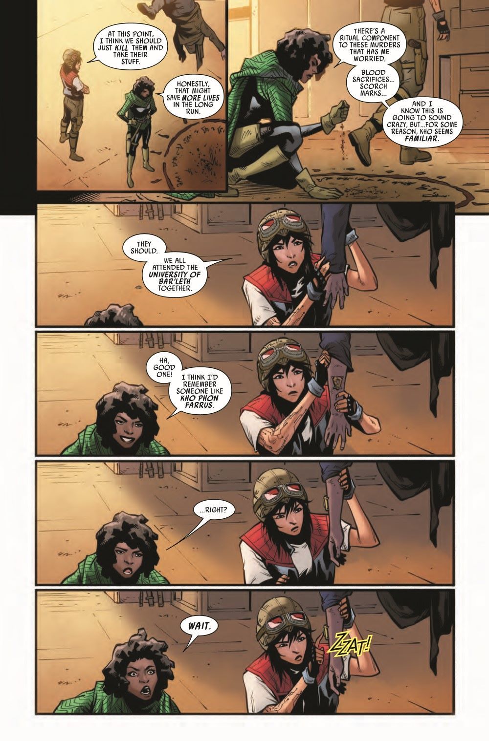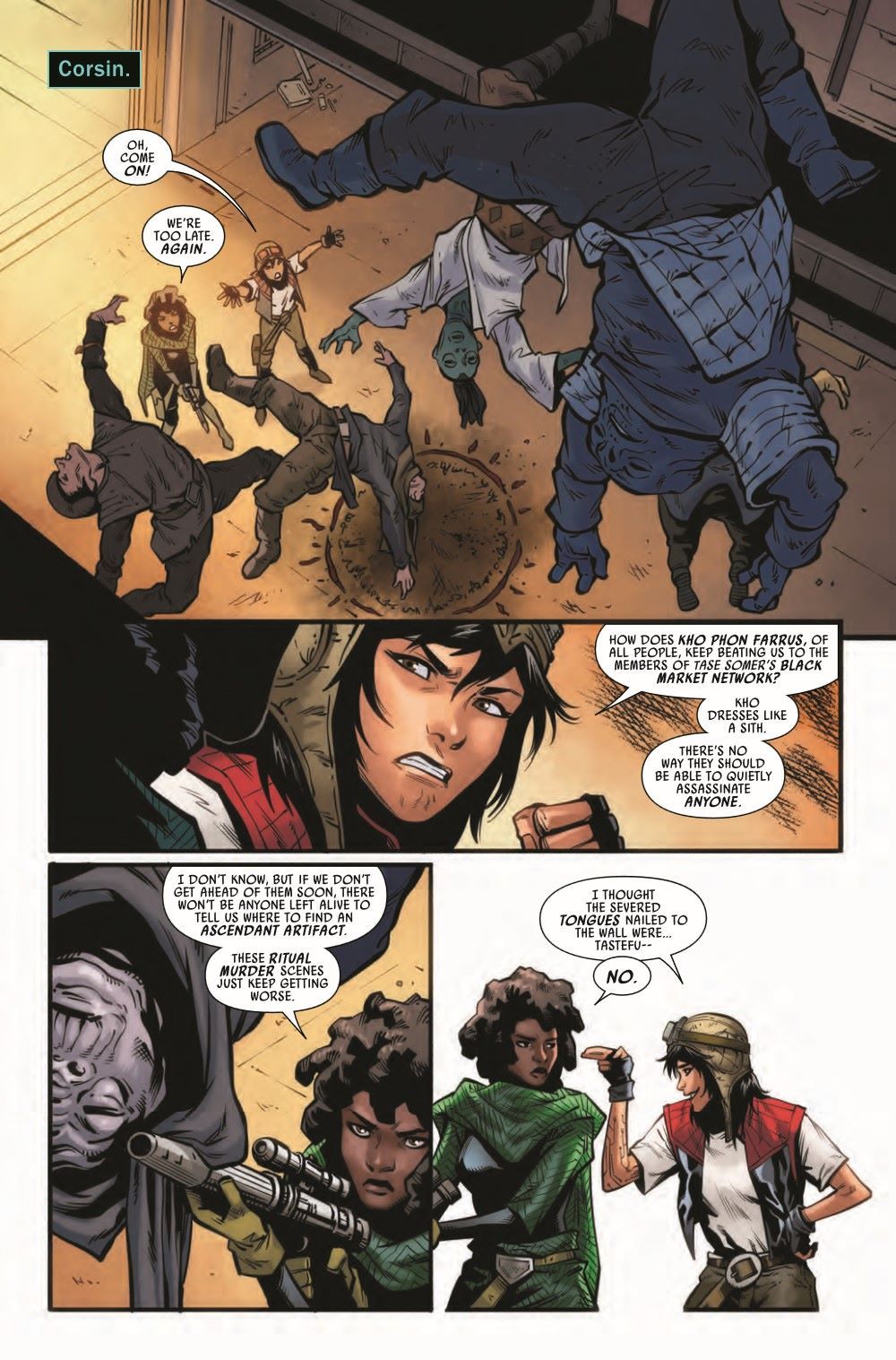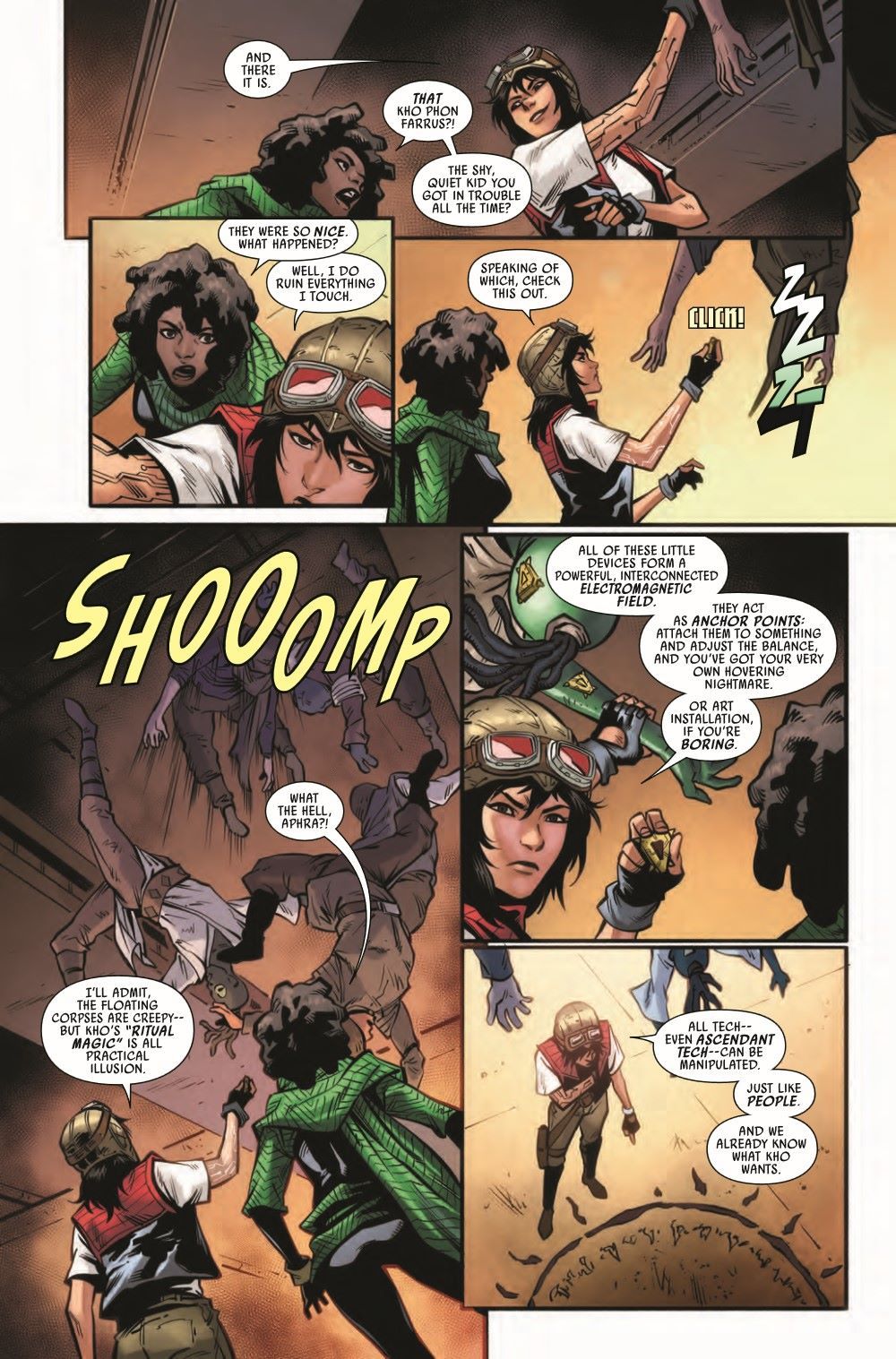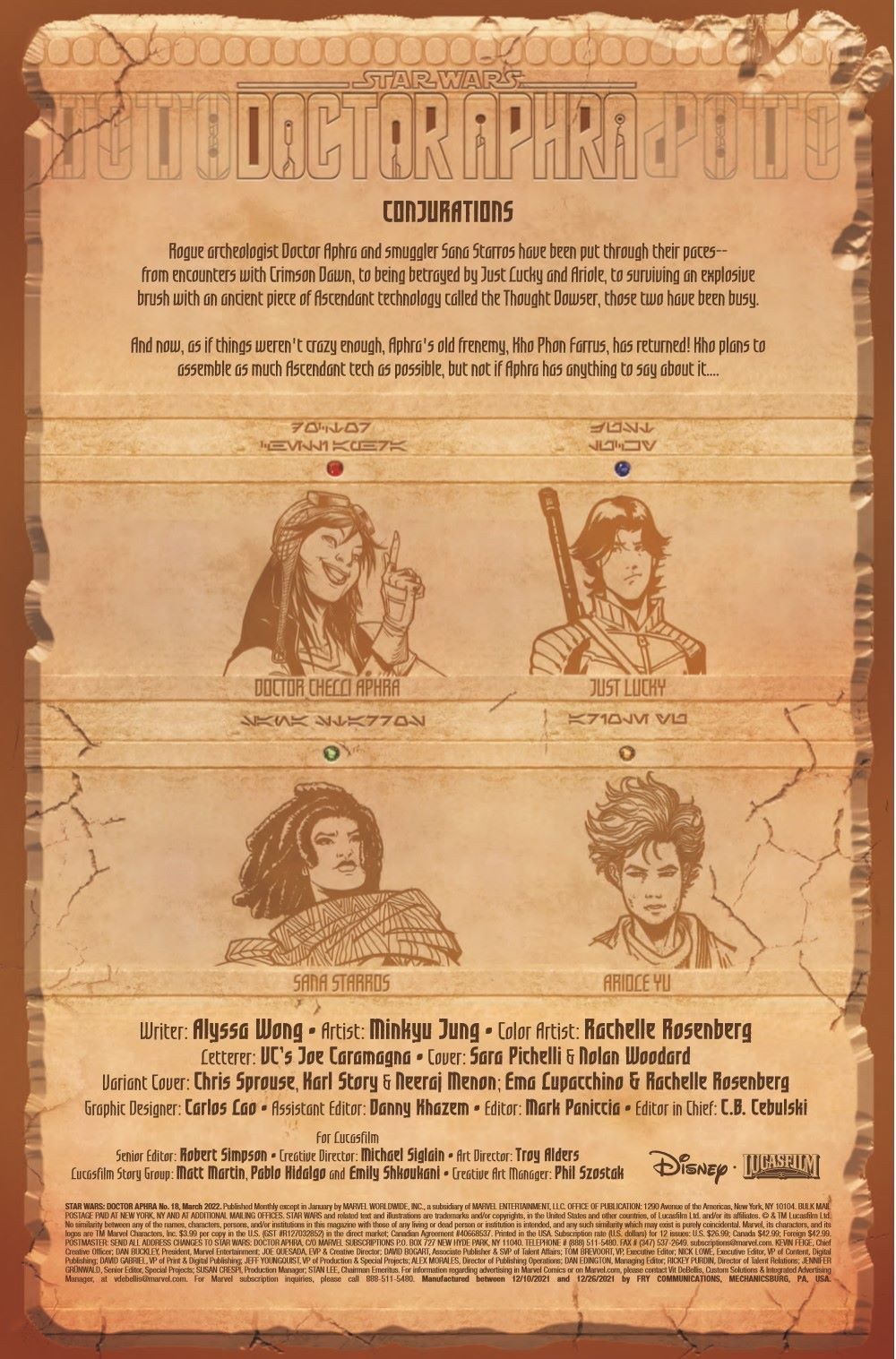 "CONJURATIONS" With STRANGE RITUAL MURDERS on the rise, DOCTOR APHRA and SANA STARROS' hunt for HOWLING ARTIFACTS is growing dire! Their leads keep turning up dead, and they're running out of time! They'll have to delve deep into the secrets of an ANCIENT TECH CULT if they plan to catch the killer!