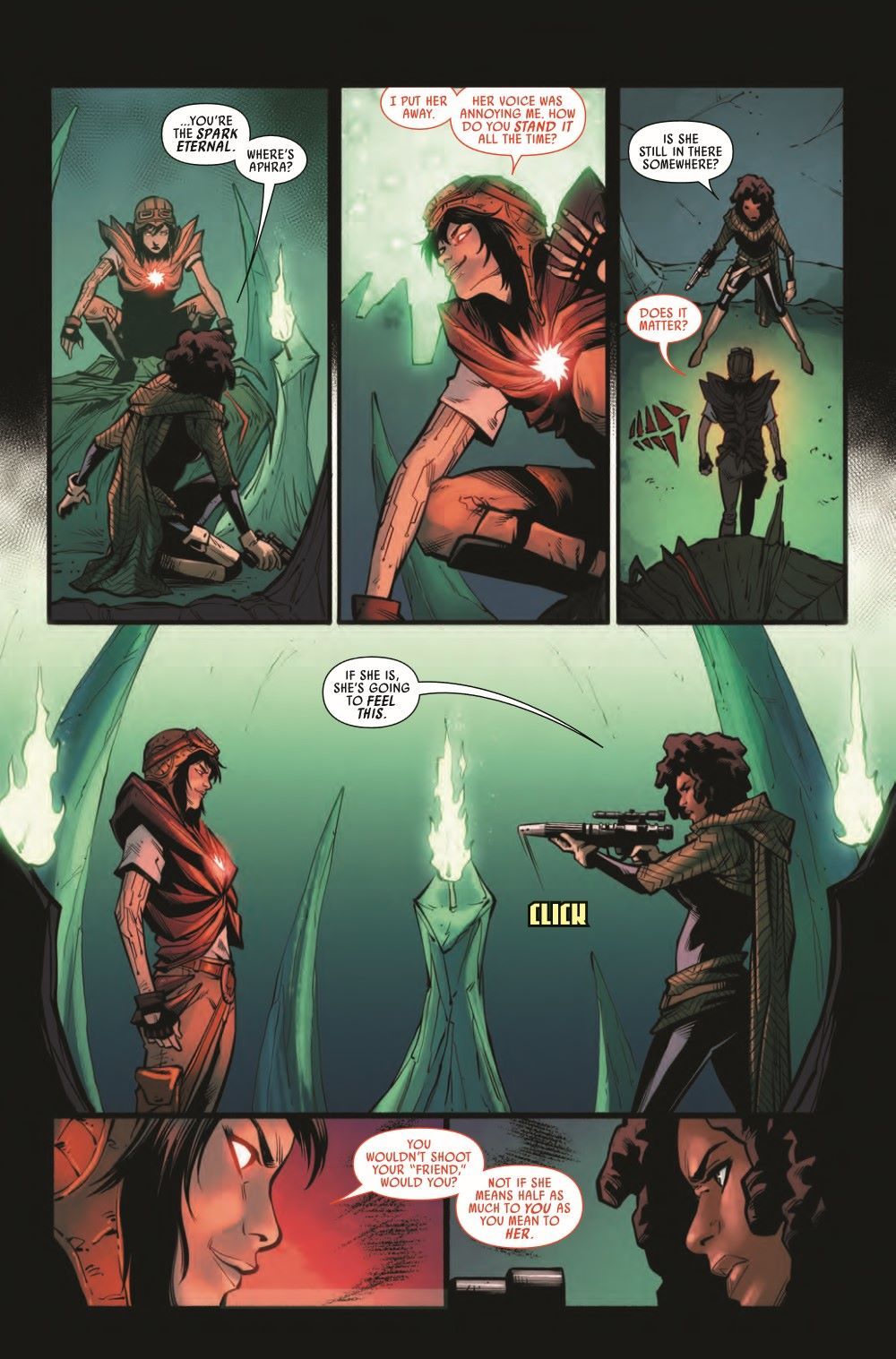 "DESPERATE MEASURES!" The SPARK ETERNAL corrupts everything it touches, and DOCTOR APHRA is no exception! Face-to-face with an ancient, malevolent presence, SANA STARROS will have to make a choice… Can she save Aphra? Can she even save herself?