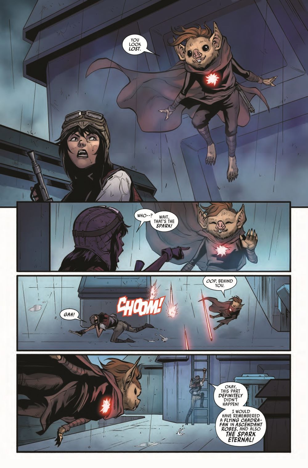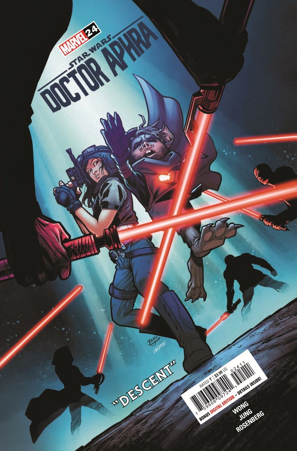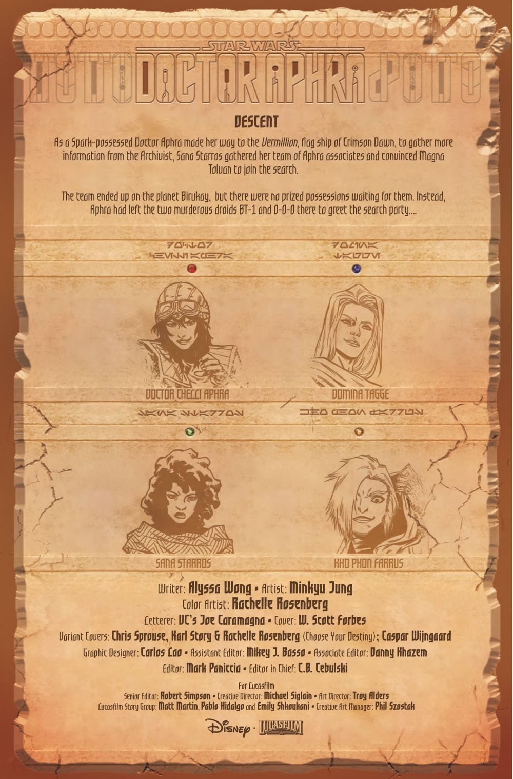 "DESCENT" Desperate to rescue DOCTOR APHRA at any cost, SANA STARROS and her CREW's search leads them to an OLD HAUNT…and two FAMILIAR FACES they might not survive! Meanwhile, Aphra delves deeper into the secrets of THE ASCENDANT...and the true origin of the SPARK ETERNAL!