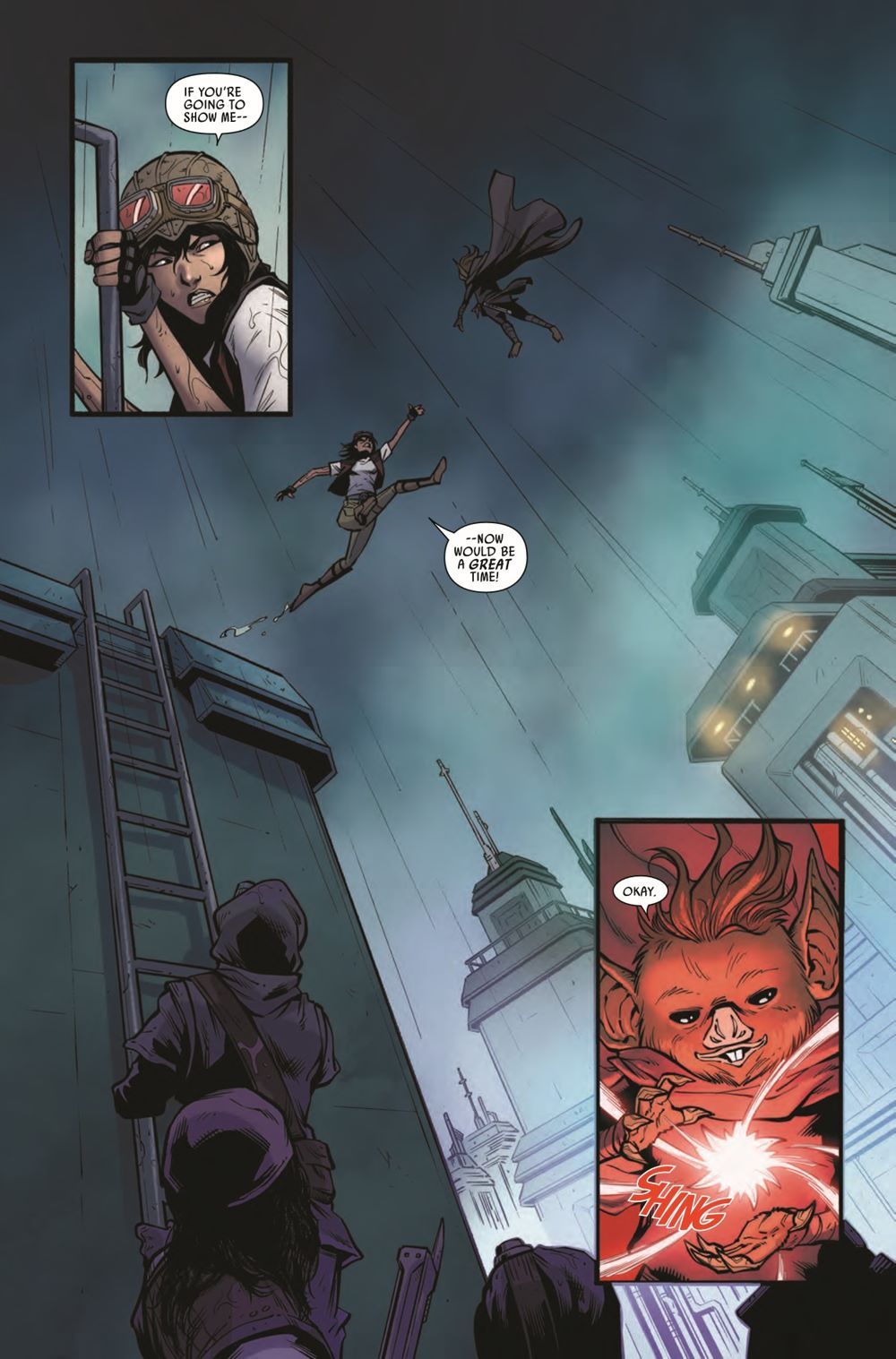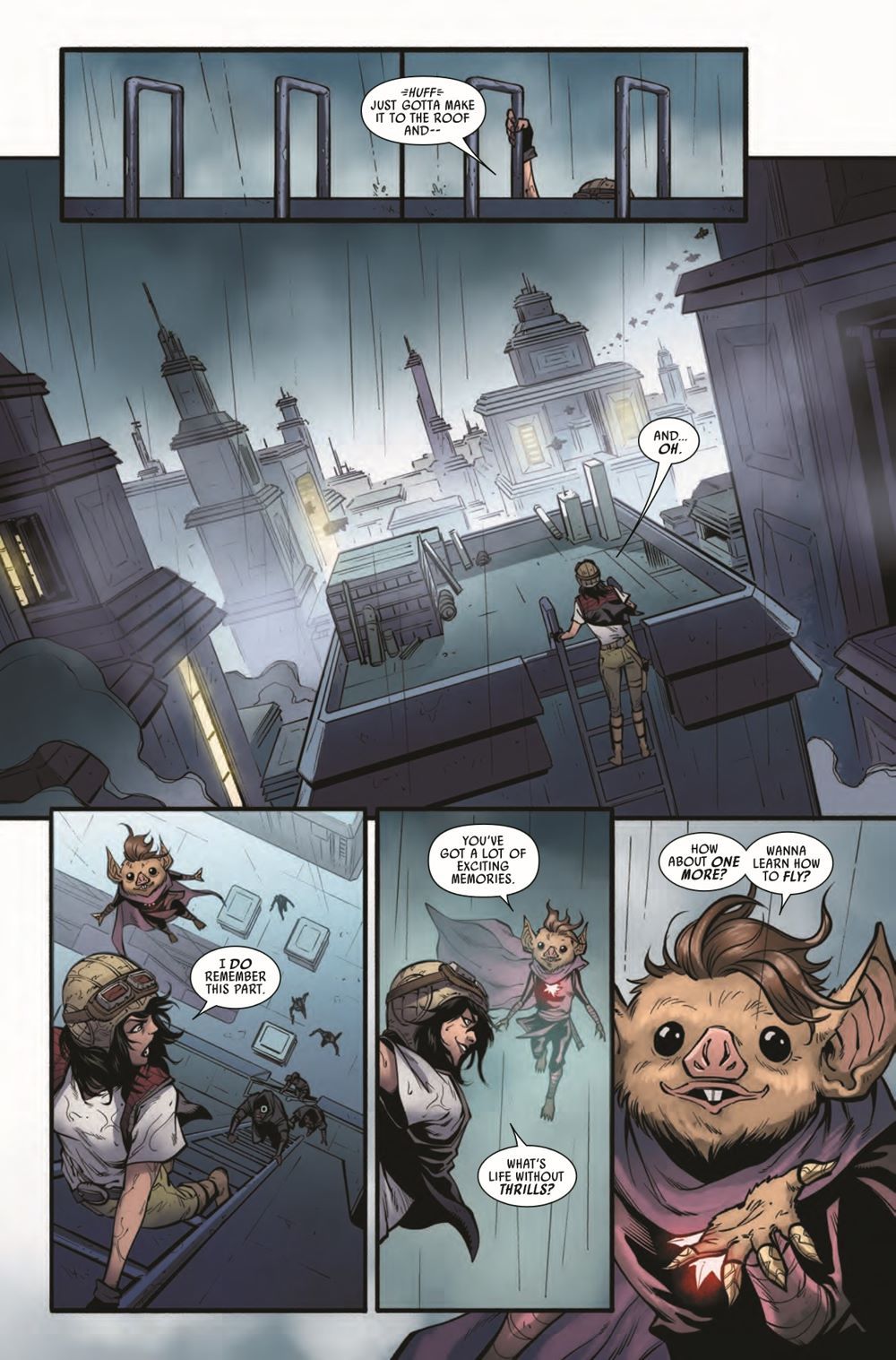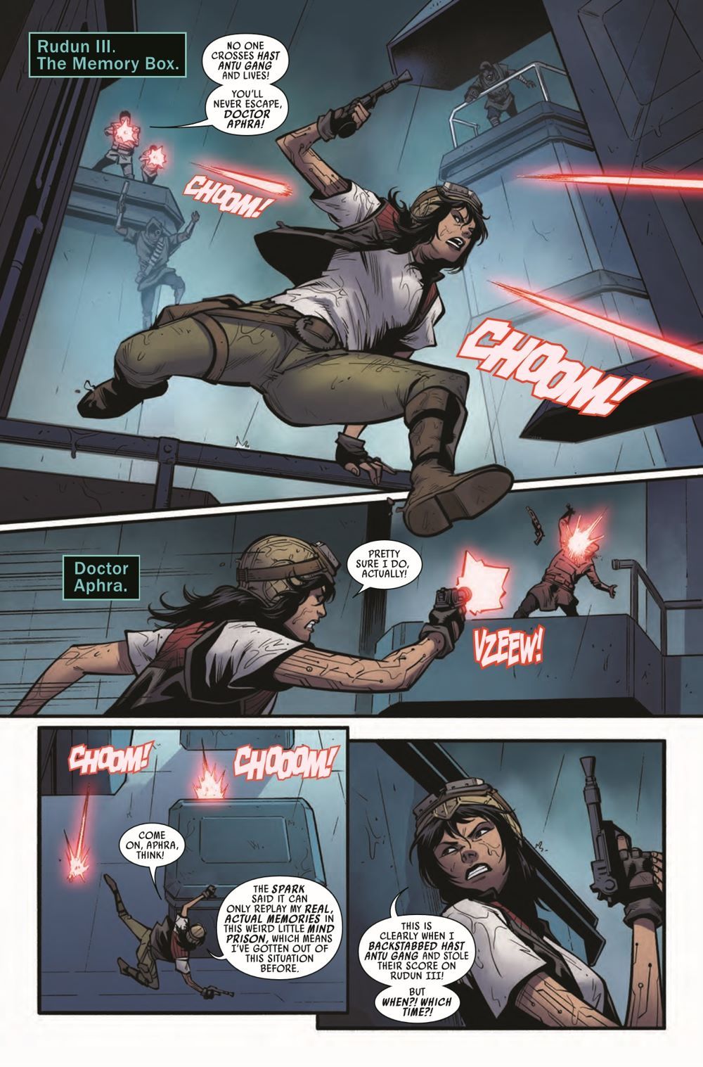 "DESCENT" Desperate to rescue DOCTOR APHRA at any cost, SANA STARROS and her CREW's search leads them to an OLD HAUNT…and two FAMILIAR FACES they might not survive! Meanwhile, Aphra delves deeper into the secrets of THE ASCENDANT...and the true origin of the SPARK ETERNAL!