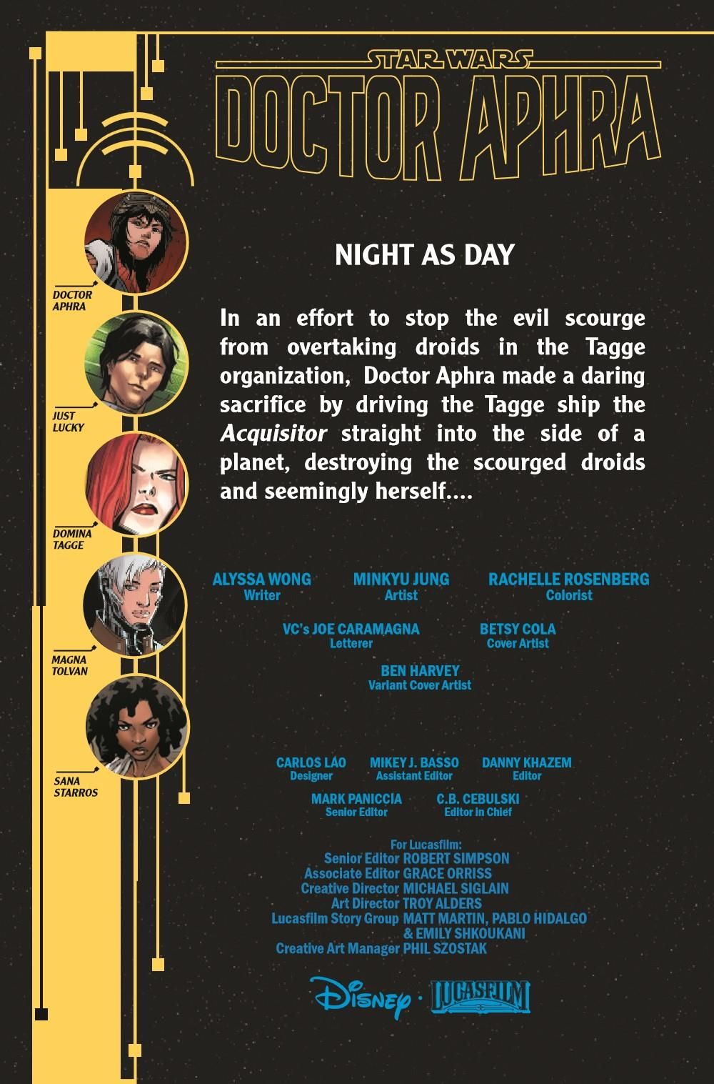 NIGHT AS DAY! The TAGGE FLEET burns. The GALAXY reels. DOCTOR APHRA is alone. But as she explores an ancient ruin on a desolate planet, Aphra may find the answers she's been hunting for her entire life. Is this the end for DOCTOR APHRA?!