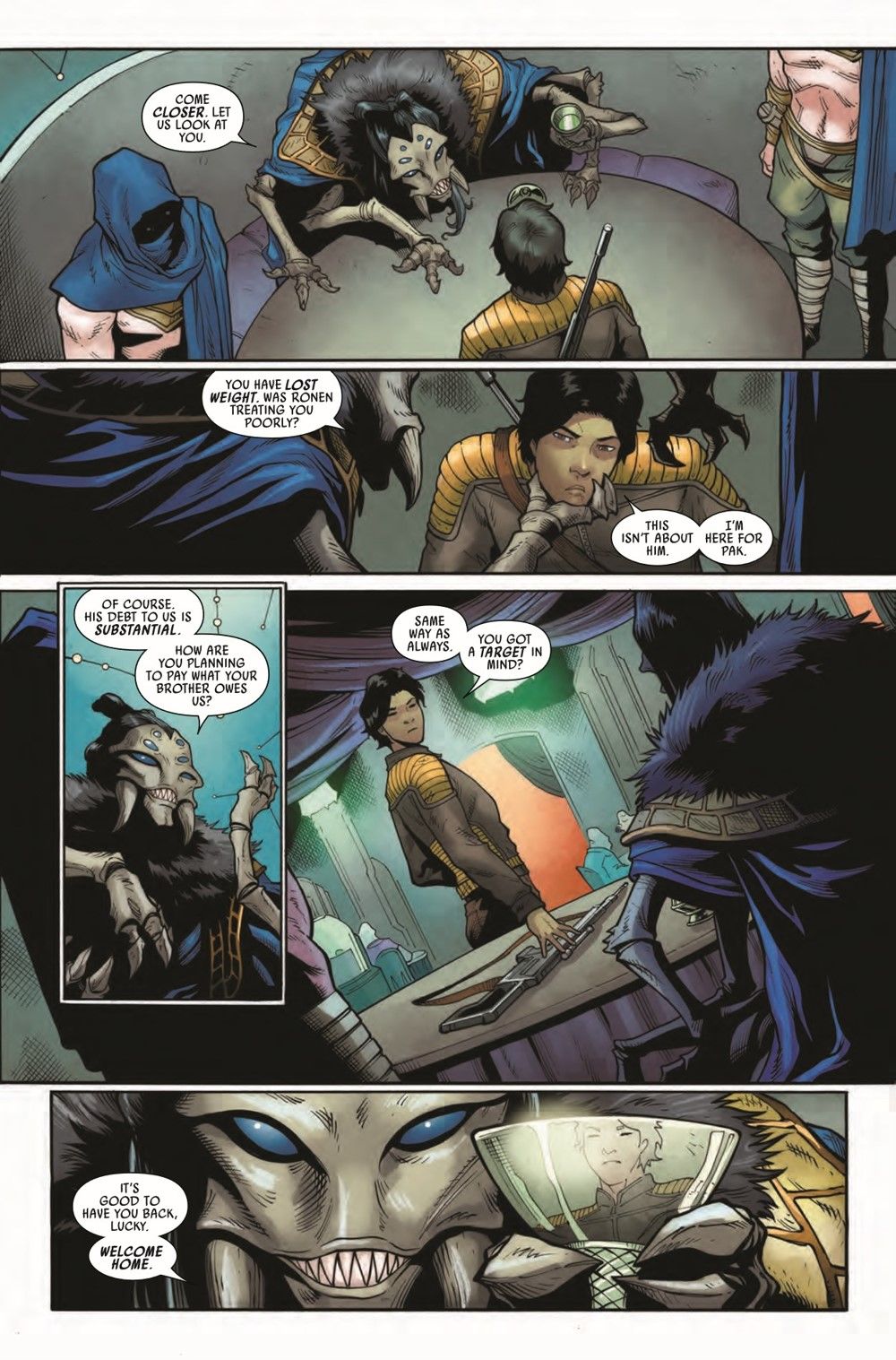 THE OFFER! Hired by DOMINA TAGGE, APHRA sets her sights on a mysterious piece of tech that could shift the balance of the galactic civil war. Her hunt takes her to CORELLIA... and to SANA STARROS' doorstep! But Aphra's not the only one on Corellia with an eye on the tech...!