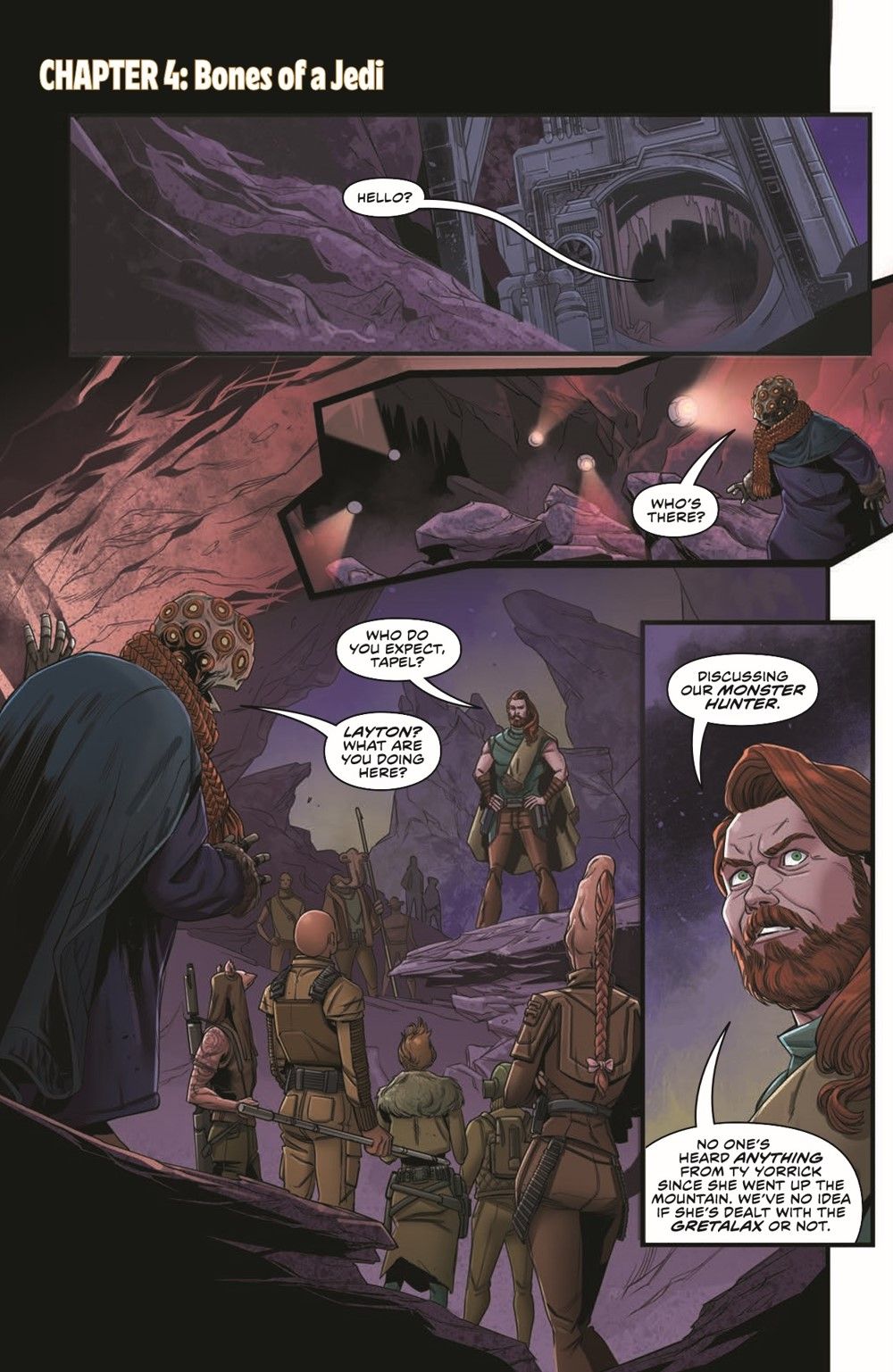 Follow former Jedi turned saber-for-hire monster hunter Ty Yorrick in this adventure-packed High Republic miniseries by Cavan Scott and Rachael Stott! In the final part, Ty uncovers the truth deep in the Gretalax's cave and must make a choice: the way of the Jedi or the way of the monster hunter? She must choose fast in order to protect the villagers and bring harmony to the settlement.