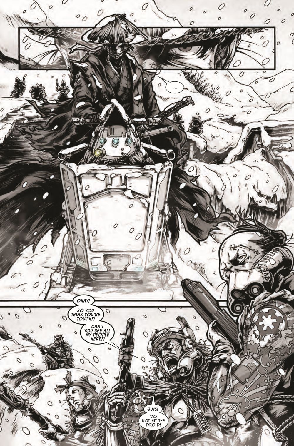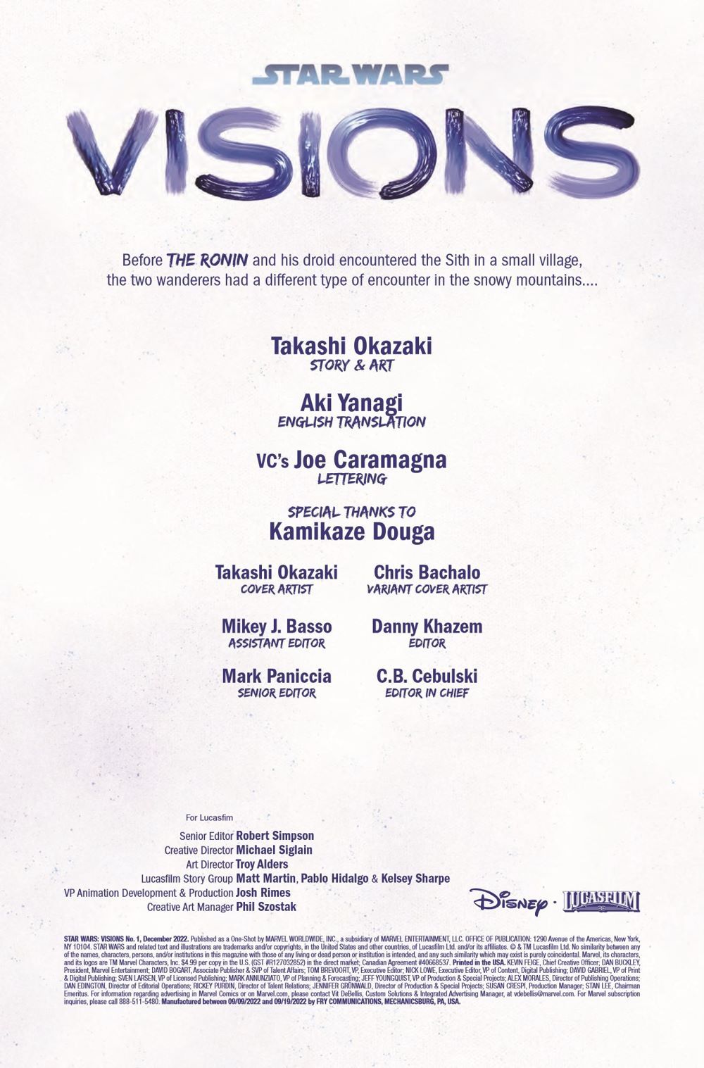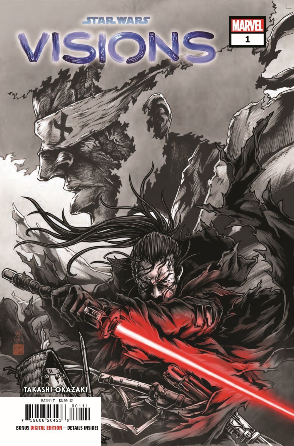FROM ONE OF THE CREATIVE MINDS BEHIND THE STAR WARS: VISIONS EPISODE "THE DUEL" COMES AN ALL-NEW STORY! TAKASHI OKAZAKI (Afro Samurai) is continuing his storytelling from the acclaimed STAR WARS: VISIONS episode "THE DUEL," featuring the Ronin! With an art style depicted directly from "THE DUEL" – grey tones with exciting color for lightsabers and blasts - the mythology of STAR WARS infused with elements of Feudal Japan makes this issue a MUST READ for STAR WARS and MANGA fans alike!