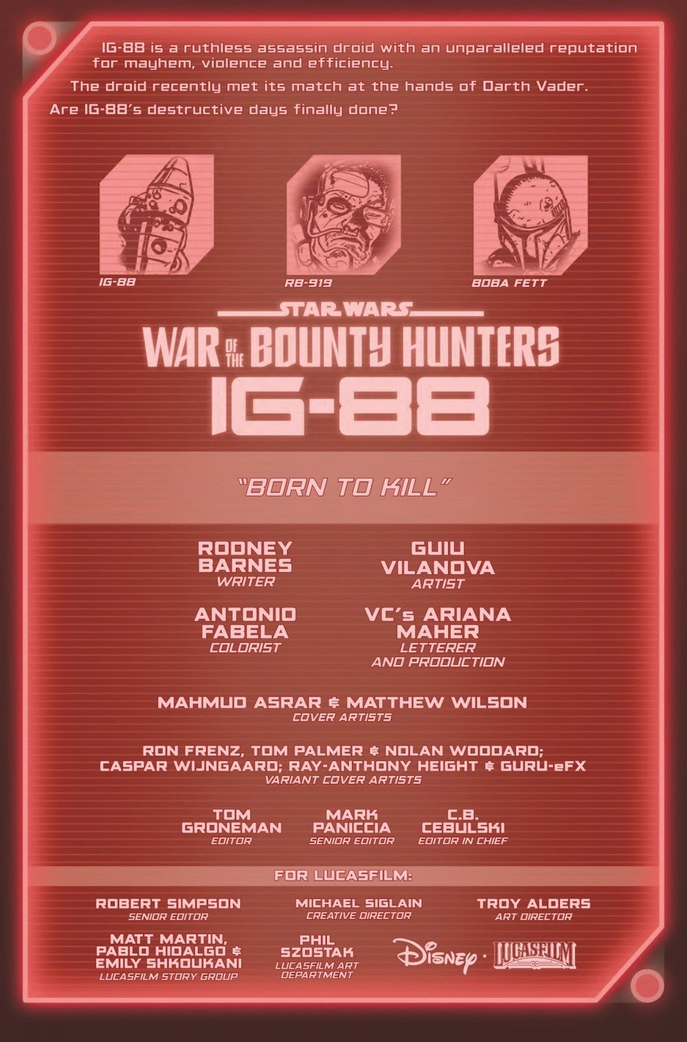 NO ONE CAN DEFEAT IG-88! WAR OF THE BOUNTY HUNTERS TIE-IN! IG-88 is an advanced assassin droid designed for death, destruction, and mayhem. Its weapons systems are unparalleled, its design flawless. Yet the galaxy's most sinister droid bounty hunter can still fail. What motivates IG-88's resurrection time and time again? Is it programming or something... more? And can IG-88 find a strategy to overcome its old foe, Boba Fett?! Rodney Barnes' and Guiu Vilanova's one-shot is the fourth of four action-packed "War of the Bounty Hunters" tie-ins about the criminal underworld's most notorious hunters and scoundrels, all told by the best STAR WARS writers and illustrators in the galaxy.