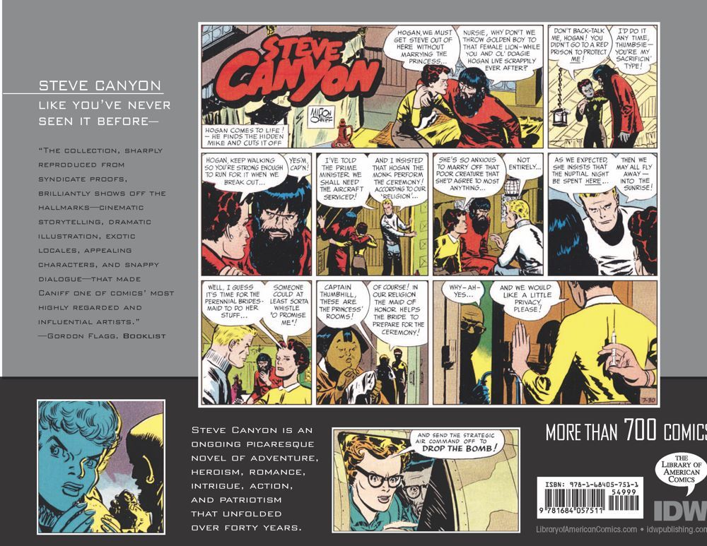 "Who am I?" "Where am I?" Steve is left with some thorny questions after posing as the leader of a Nazi resurgence organization and teaming with Minerva Kaol in an attempt to flush out this hate-mongering group. If that wasn't a headache enough, guess who's back from his stay in a Mongolian prison? Doagie Hogan, that's who! Stateside, Poteet finds a new friend in young aviatrix Bitsy Beekman. Together they tackle drug smuggling, explore the upcoming Olympic games, and deal with the scourge of society—hippies! Milton Caniff offers his unique perspective of the war-torn world of 1967 and '68 in Steve Canyon, Volume 11!