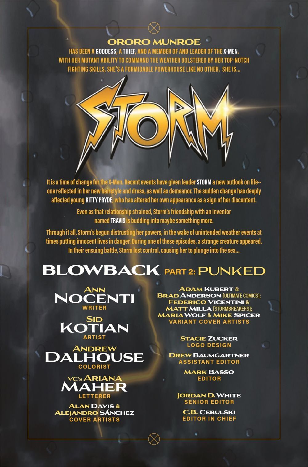 OUT-OF-CONTROL POWERS VS. AN OUT-OF-THIS-WORLD ADVERSARY! As ORORO MUNROE tries to balance her responsibilities as leader of the X-MEN, her difficult relationship with KITTY PRYDE and even a NEW LOVE INTEREST, her powers are creating deadly weather that threatens to tear it all asunder! In the eye of the storm is the powerful NEW VILLAIN BLOWBACK - but as Storm summons her strength for their first historic confrontation, will even her best be enough? Continuing the all-new tale set during Storm's fan-favorite punk-attired days, by legendary Marvel writer/editor Ann Nocenti.