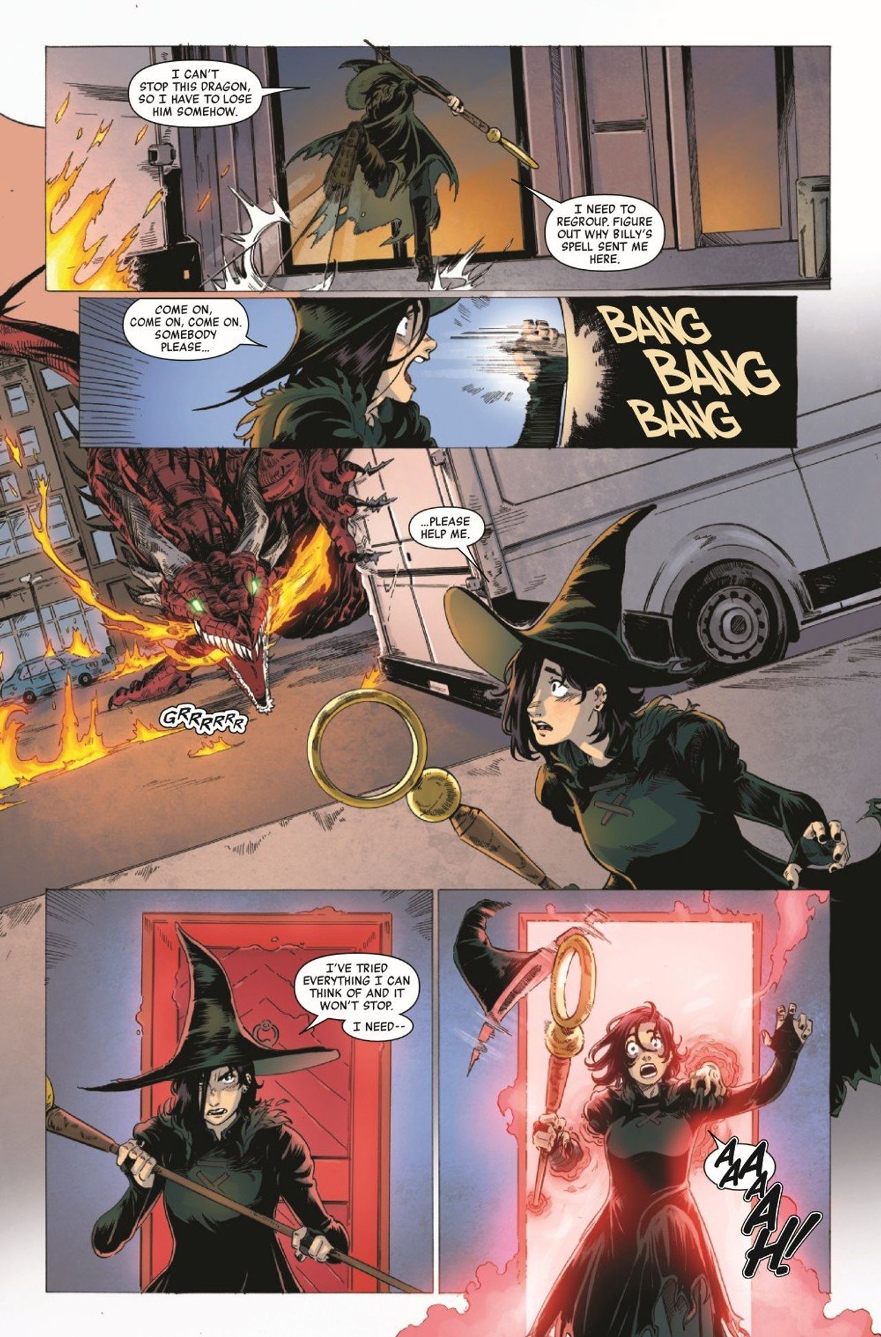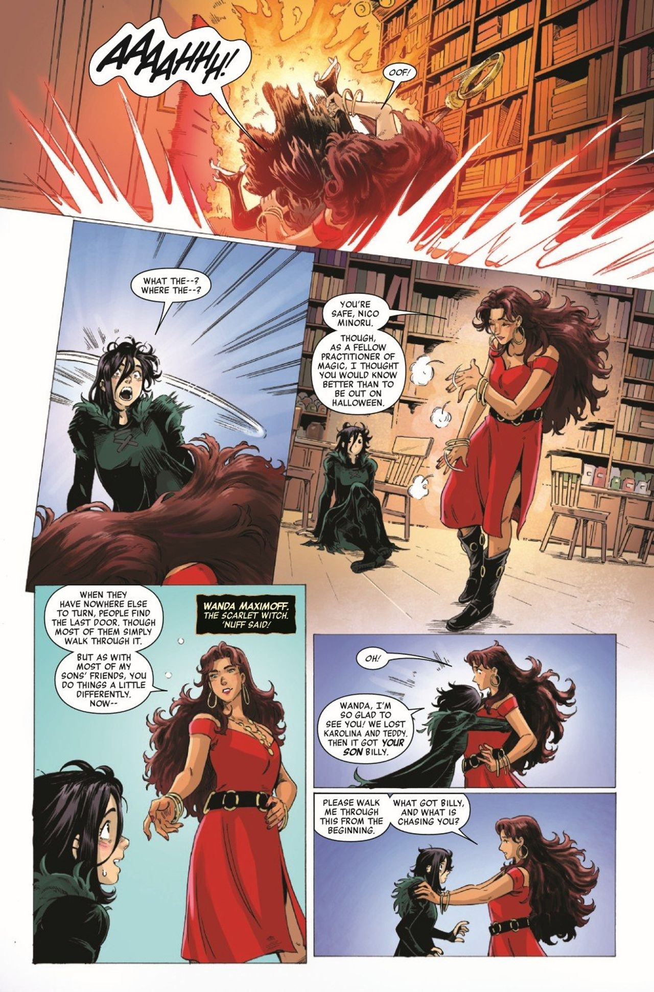 ROLL THE DICE…IF YOU DARE! It's Halloween, and Nico Minoru joins her girlfriend Karolina Dean, and friends Teddy Altman and Billy Kaplan for a rousing round of RPG Hoosegows and Hydras. But when a dice roll leads to goblins materializing in real life and her friends all disappearing, Nico Minoru is soon left running through NYC's streets with a very real dragon hot on her tail. Desperate for help, she finds herself at the Scarlet Witch's Last Door. Will these two witches find the missing heroes and piece together how this board game came to life, or will their adventure end in a critical loss?
