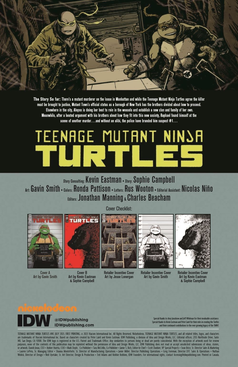 The continuation of Sophie Campbell's epic run! With the Armageddon Game over, new groups compete to fill NYC's power vacuum from new ninja clans to the police, and even old threats like Dr. Barlow. After the Armageddon Game, the Hamato brothers are so divided, they can't even agree on what the biggest threat is. With the city vulnerable, it may have to look elsewhere for help as the TMNT might not even be able to help themselves, let alone New York.