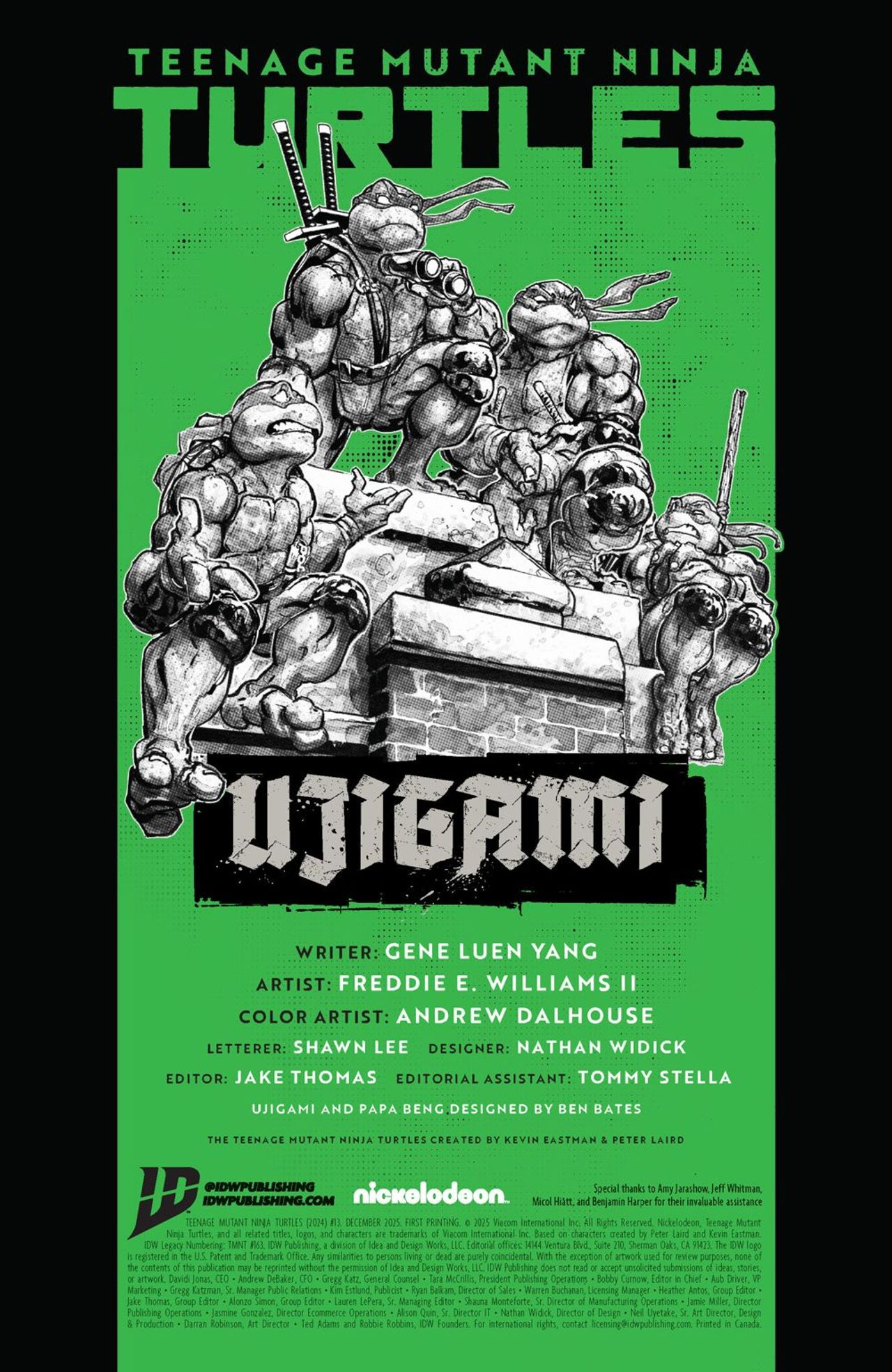 A new era of TMNT begins! Acclaimed Eisner-winning writer Gene Luen Yang (American Born Chinese, Avatar: The Last Airbender, Superman Smashes the Klan) takes on writing duties for TMNT! Following the stunning events of TMNT #12, the Turtles face a different New York…one where they are viewed as heroes! The celebration will be short-lived as new threats vie for control. The mutant yak Papa Beng is determined to widen the power base for his gang. Yet little does he know that he and other TMNT villains are being stalked by a powerful new assassin…Ujigami!