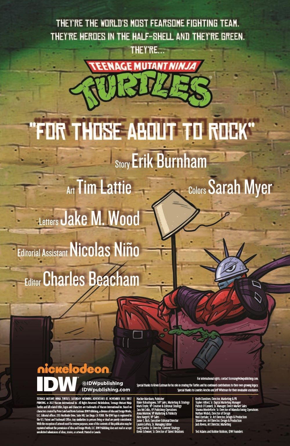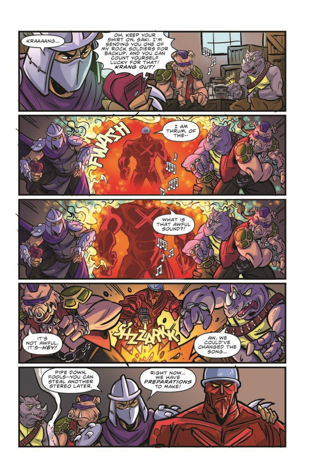 While intercepting a contingent of Krang's stone soldiers, the Teenage Mutant Ninja Turtles witness one of their enemies get struck down by the very tech he was sent to steal! With a single blast of mysterious energy, the hard-bodied baddie drops his tough facade and gains an affinity for hair metal and power ballads! Will this transformation last? Can rock 'n' roll really change hearts and minds? Find out in the second exciting episode of TMNT: Saturday Morning Adventures, "For Those About to Rock"!