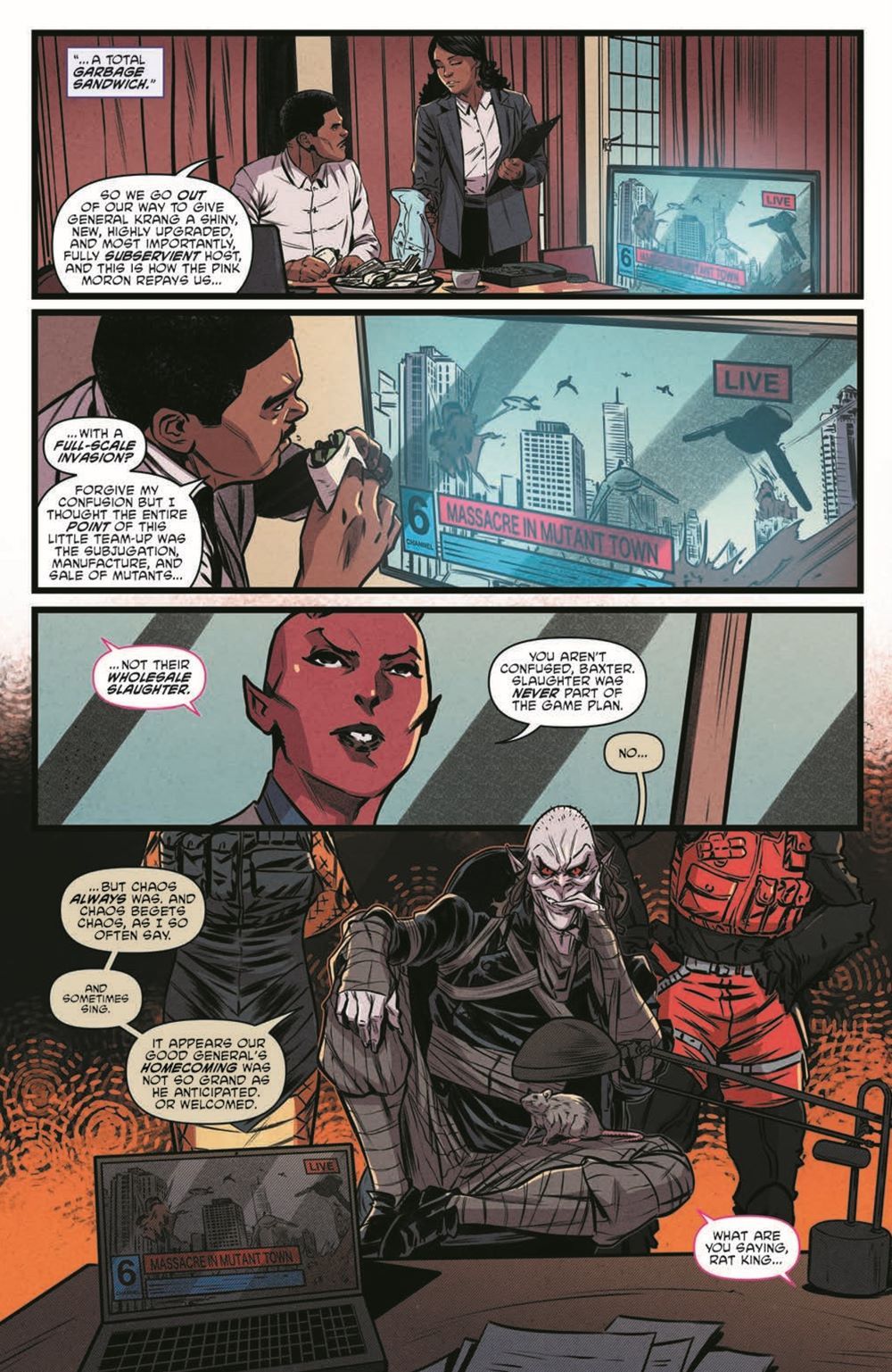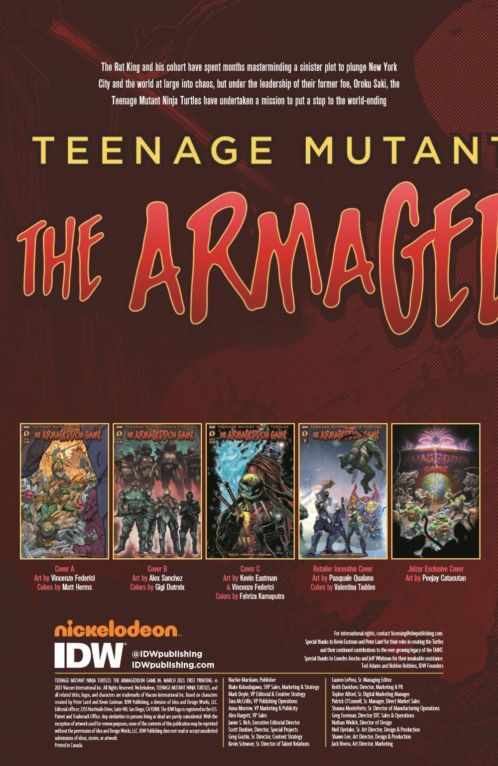 THE END-STAGE BEGINS! As the Armageddon Game reaches its iniquitous climax, the Rat King must take special care to keep his masterfully woven tapestry of anarchy from unraveling too quickly—a feat proving more and more difficult in the wake of mistakes made by his petulant and impatient puppets. No matter—chaos IS the name of the game. Meanwhile, the Teenage Mutant Ninja Turtles have regrouped in the city and are ready to go on the offensive…and this time they have reinforcements. Will the added strength of allies new and old be enough to stop the Rat King from bringing on the apocalypse, or will they meet their doom in the perilous game?