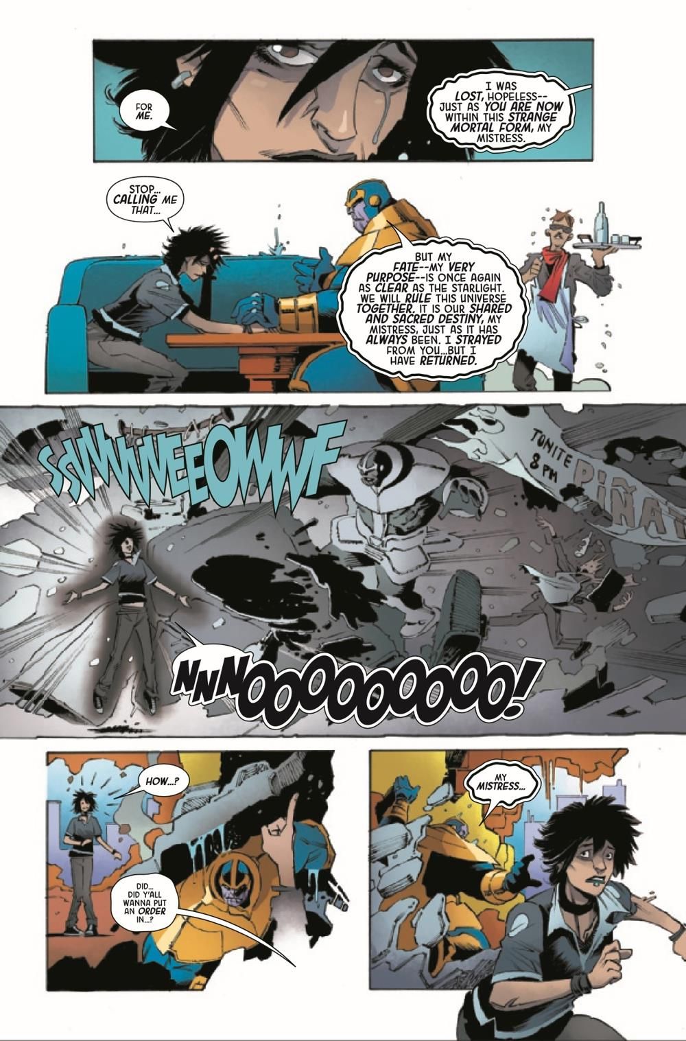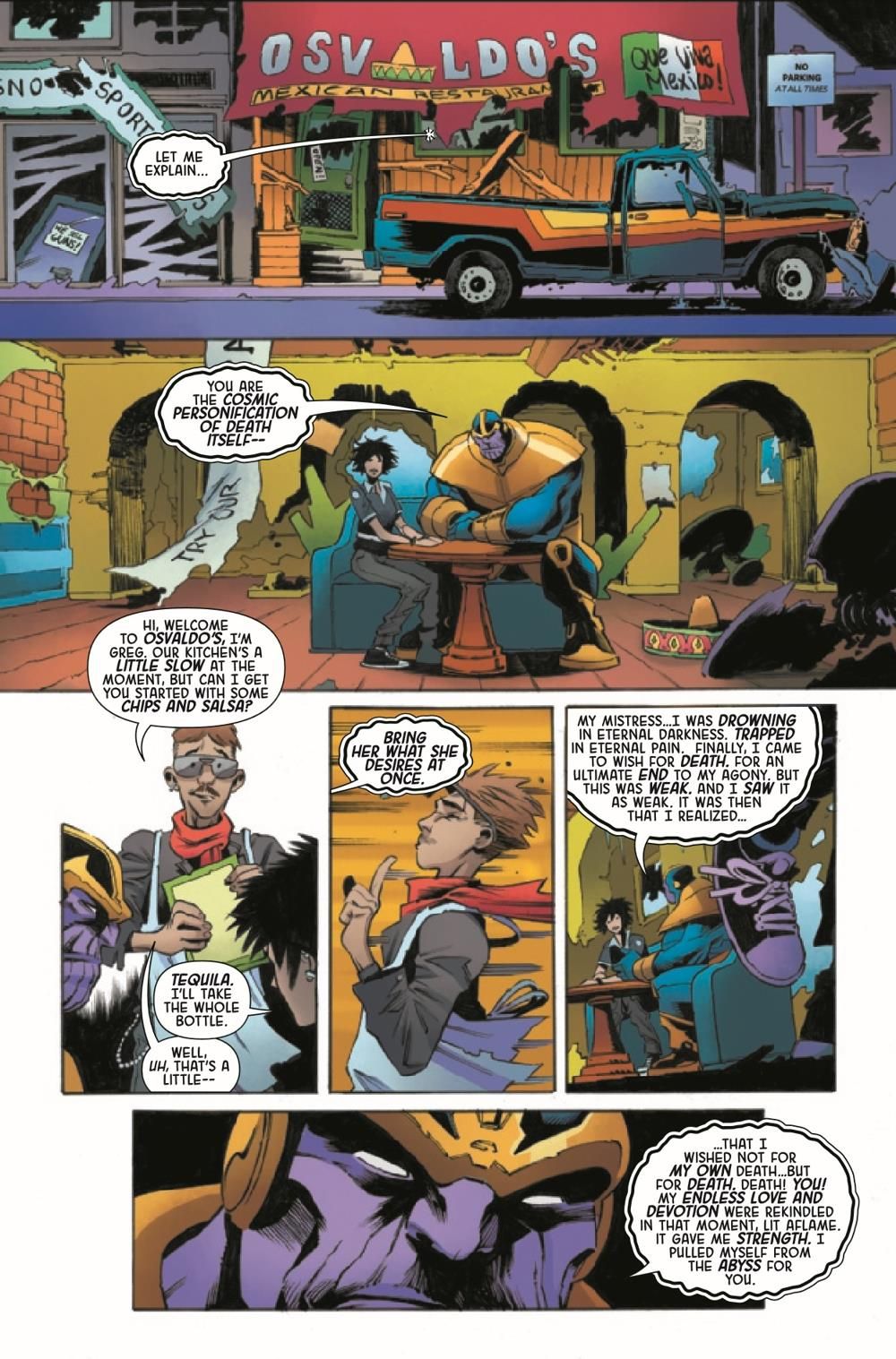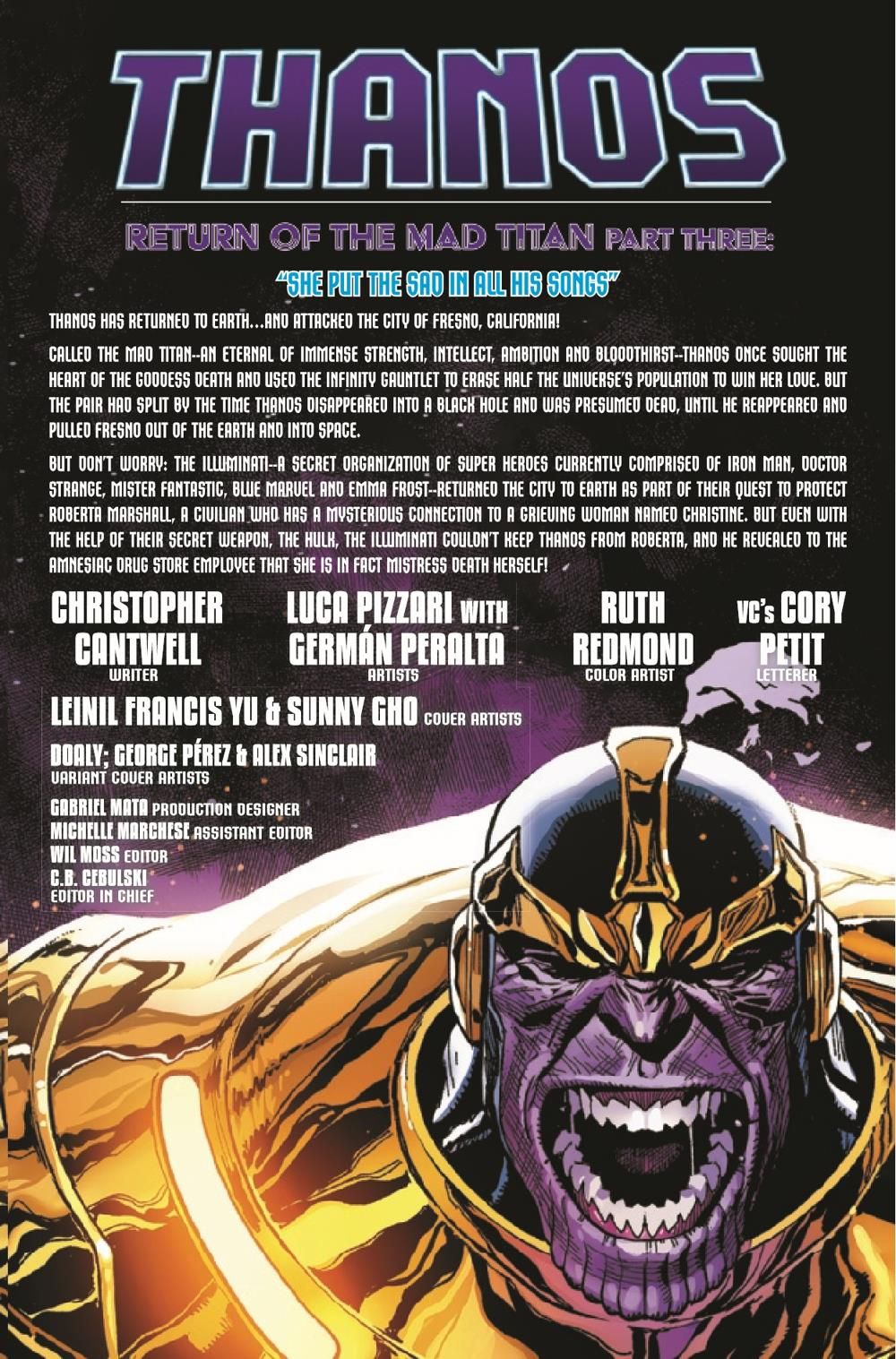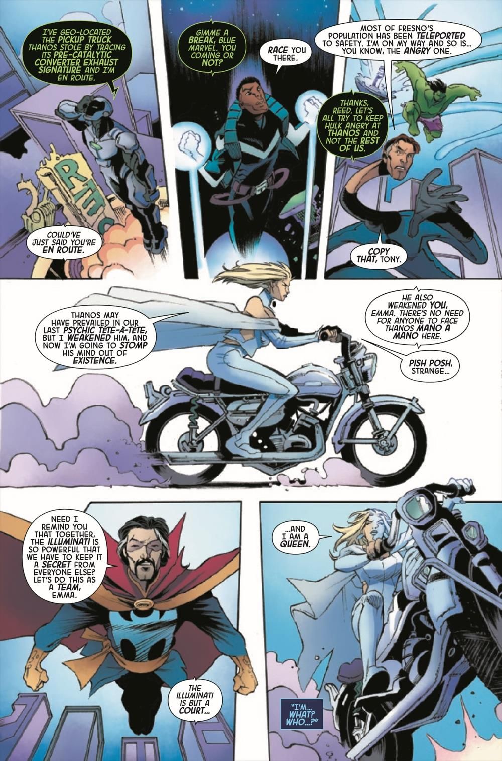 Thanos unlocks Roberta's true memories as the goddess Death - and she is not happy about it! Nor are the Illuminati, who are the ones who had given her this new human identity - but first, they must deal with getting the entire city of Fresno safely back to Earth!