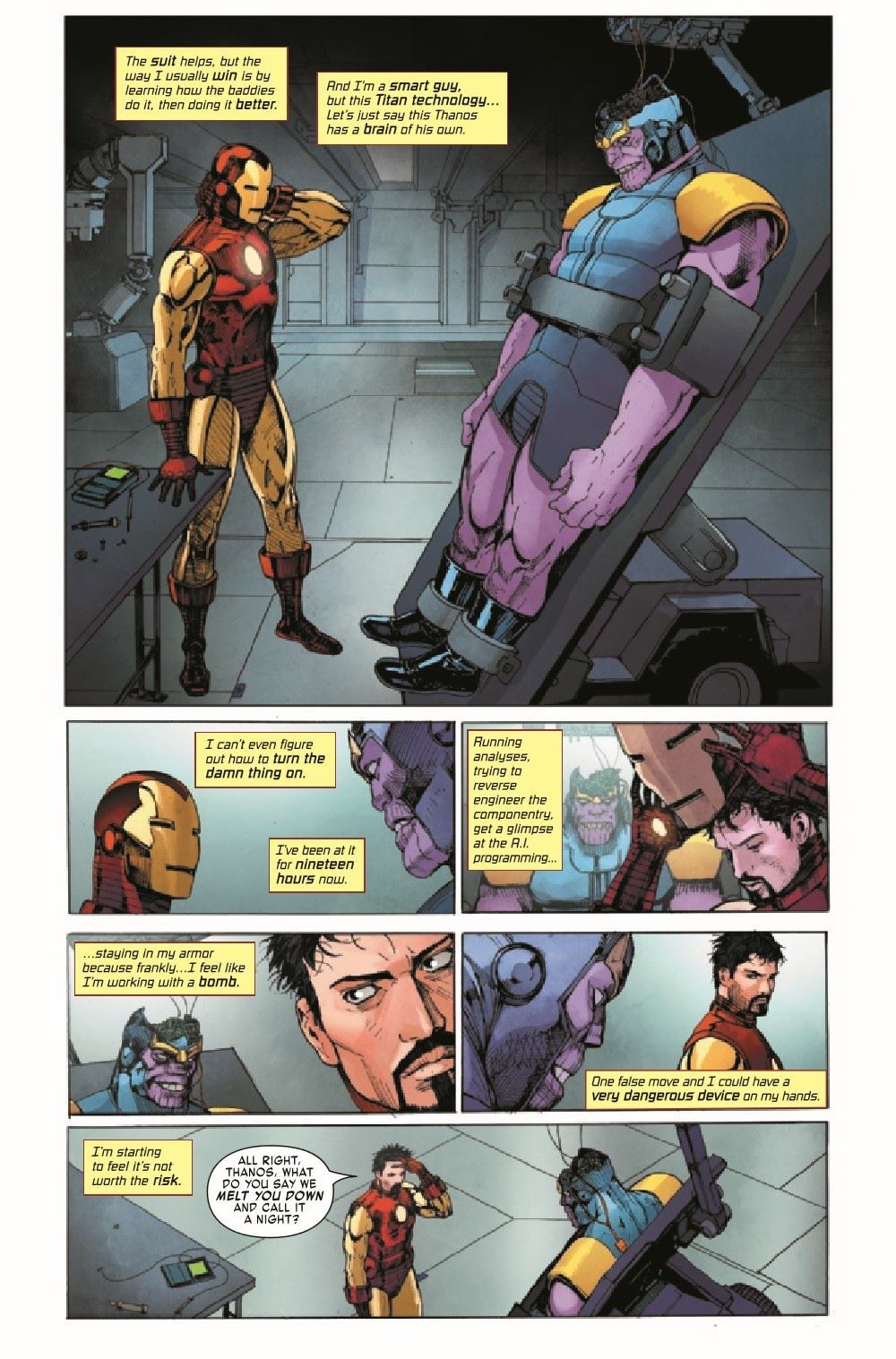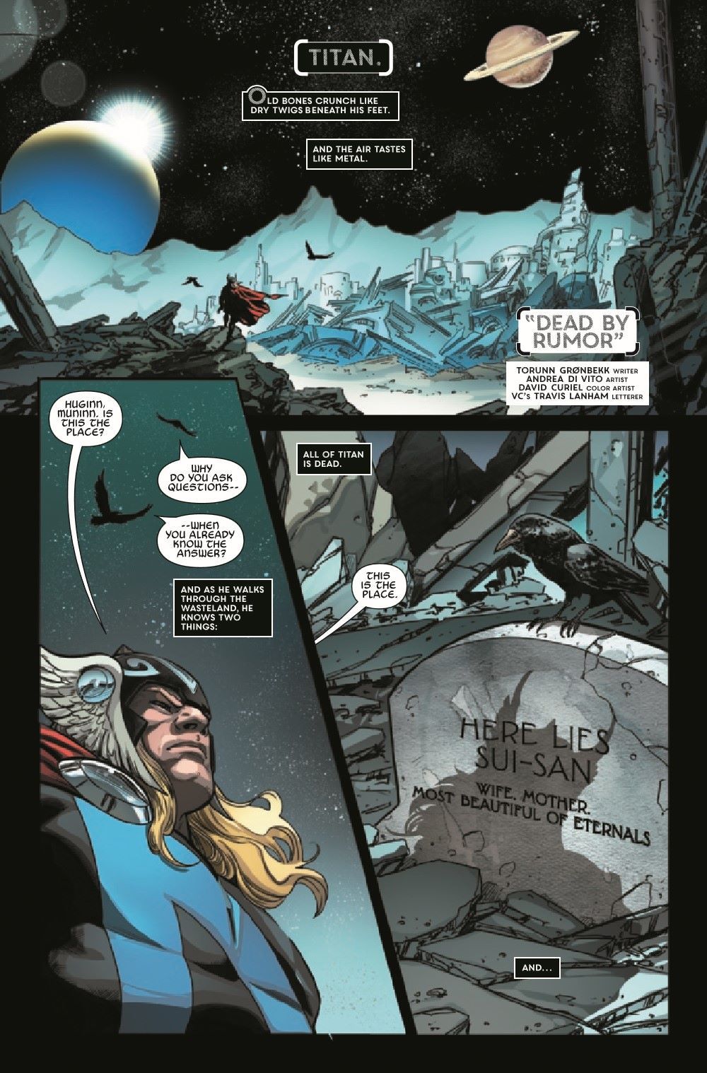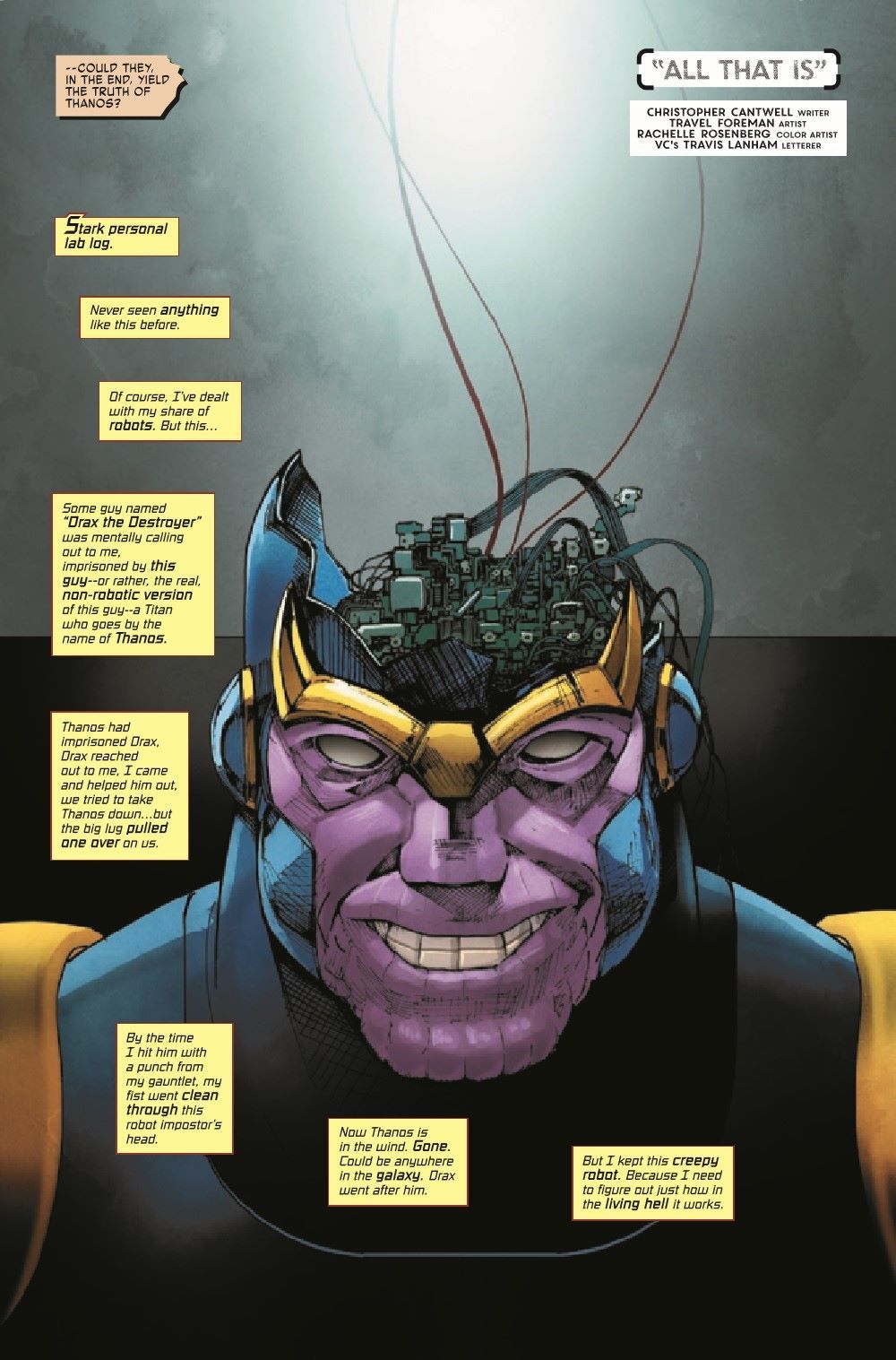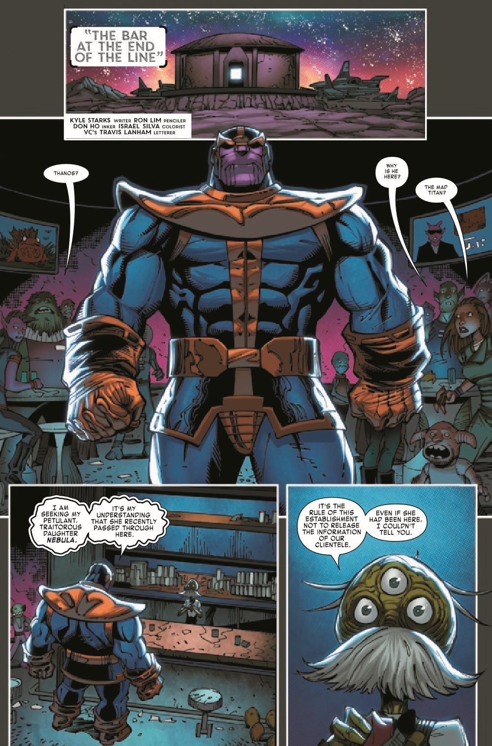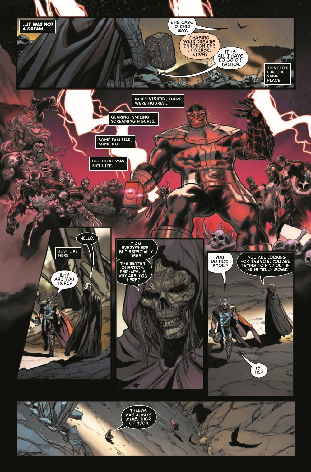 Spinning out of Donny Cates & Nic Klein's THOR comes an all-new Thanos one-shot featuring art by Andrea Di Vito and Travel Foreman, as well as Ron Lim's return to the Mad Titan! Thanos is missing, presumed dead. But Thor has seen a vision of his return. And it is enough to make even a God fear. To prepare himself, to prepare the universe, Thor desperately searches for answers in Thanos' past…and finds a glimpse of the Marvel Universe's dark future.