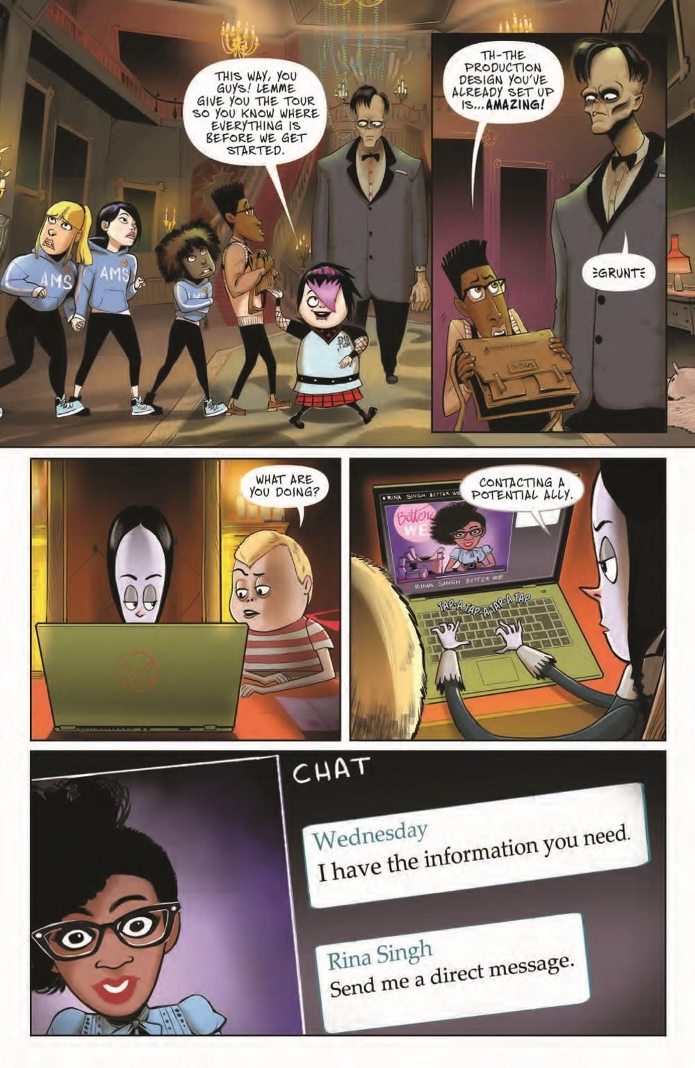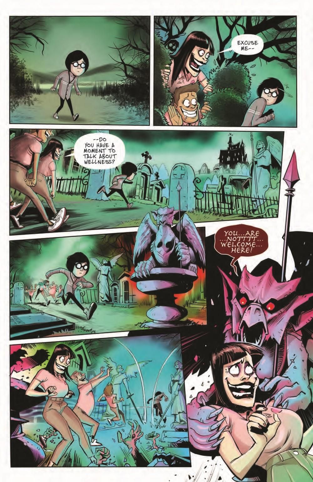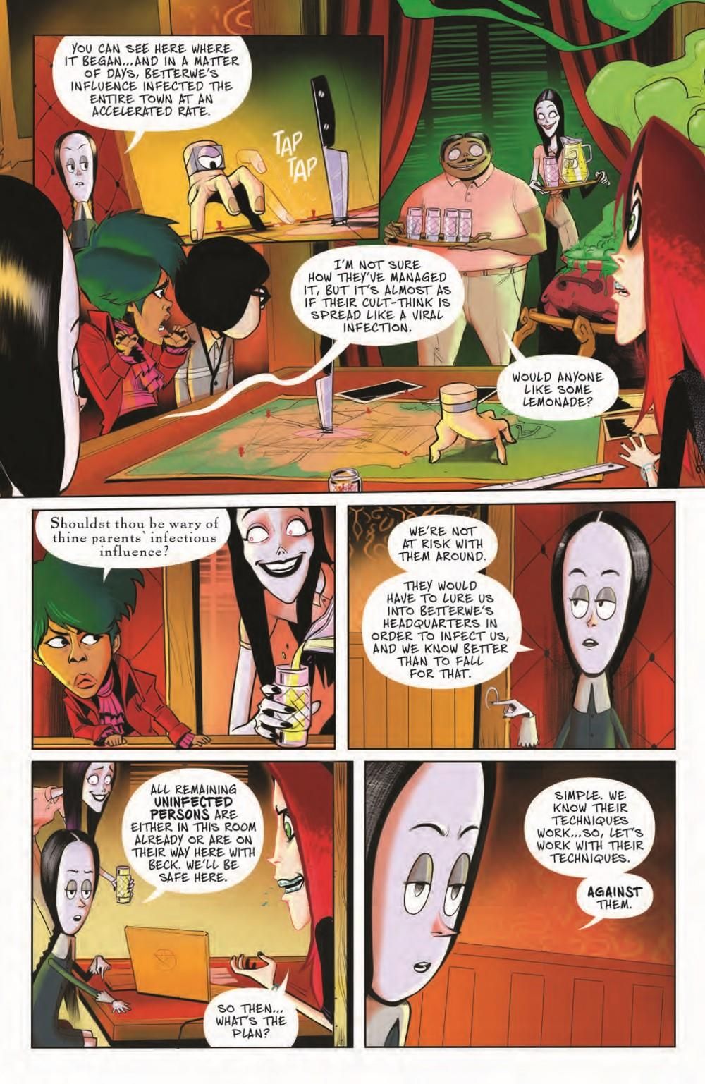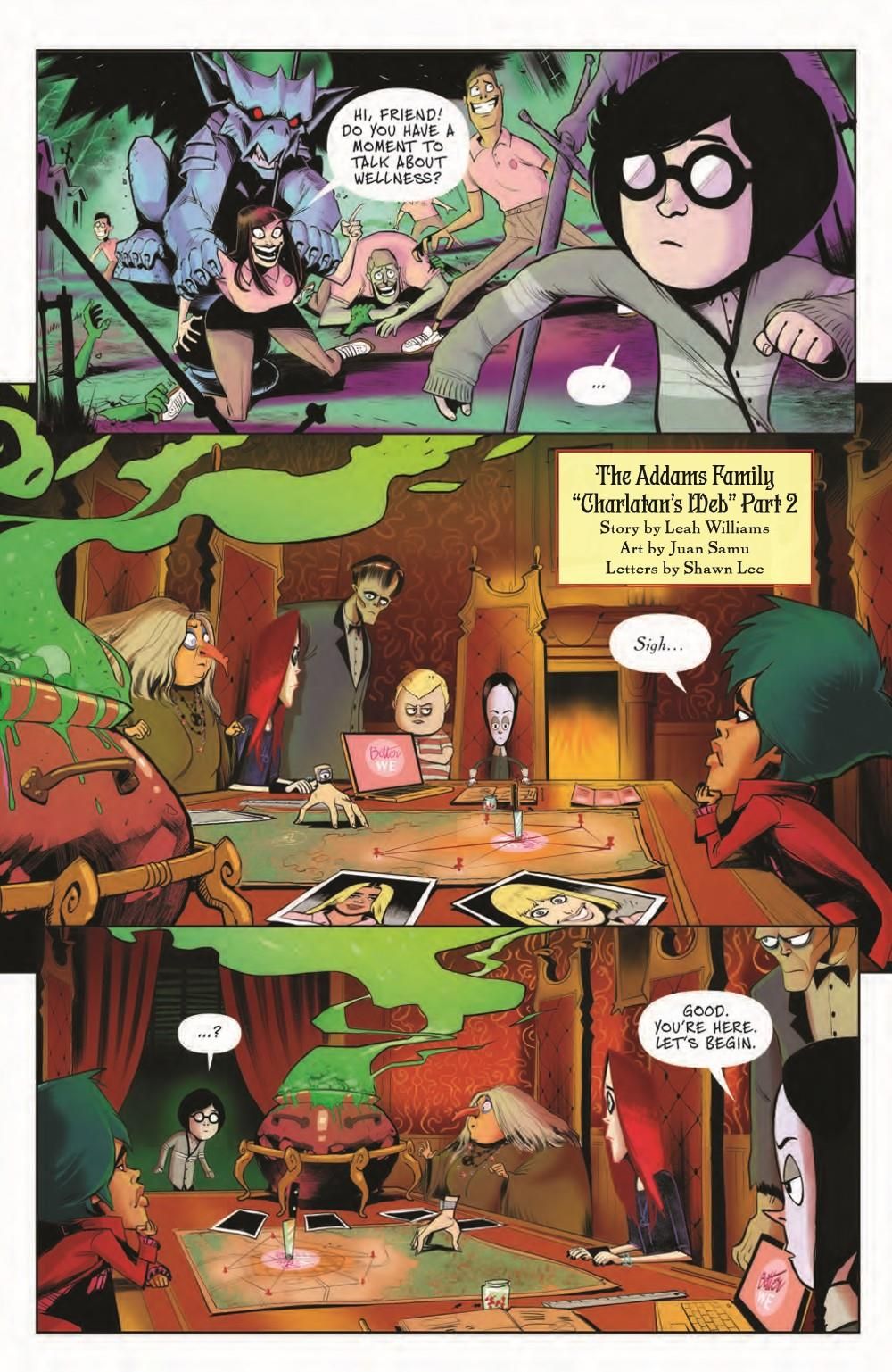 Our two stories come to a fitting conclusion, and you're going to laugh until it hurts. I mean, what other reason is there to laugh anyway? In our lead story by Leah Williams (Action Comics, Amazing Mary Jane) teams with artist Juan Samu (Star Wars: Tales from the Ranco Pitt) to tell a tale that raises your hair even as it relaxes it. The whole town has succumbed to a new health trend: milquetoast conformity. And when we say the whole town, that includes the Addams family. All but Wednesday have fallen under the spell to get well! Can she pull everyone out before they fall into this vanilla way of living completely?And in our second story, Chynna Clugston Flores (Blue Monday) and Francine Delgado give us the lowdown on what happens to the thief who dared break into the Addams family home.