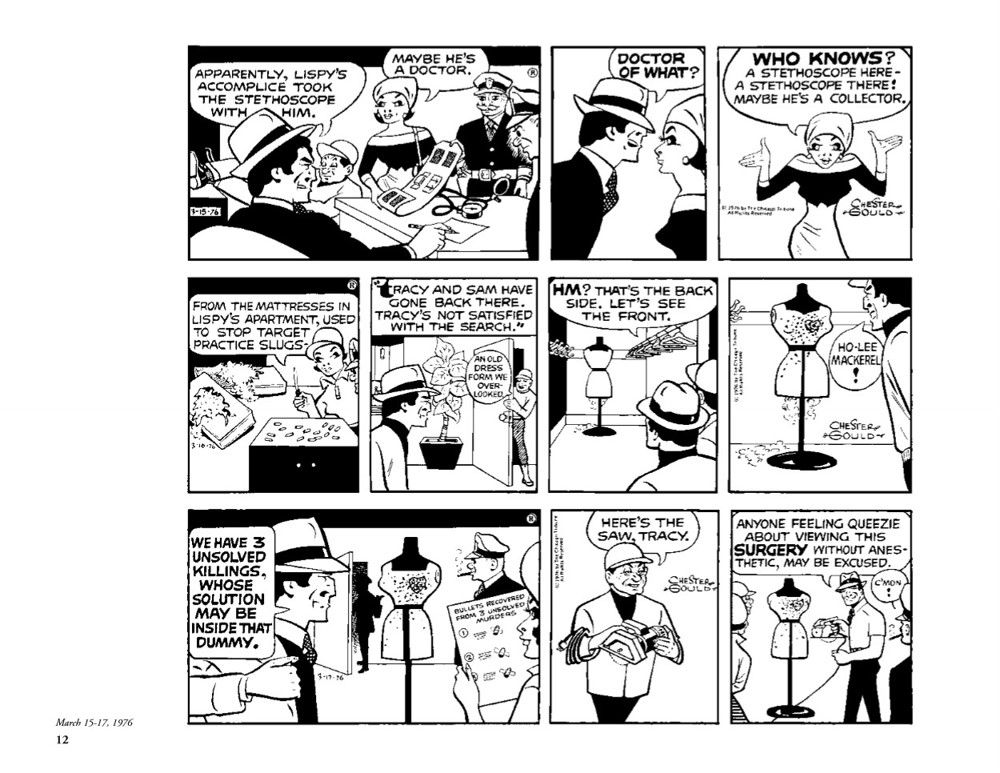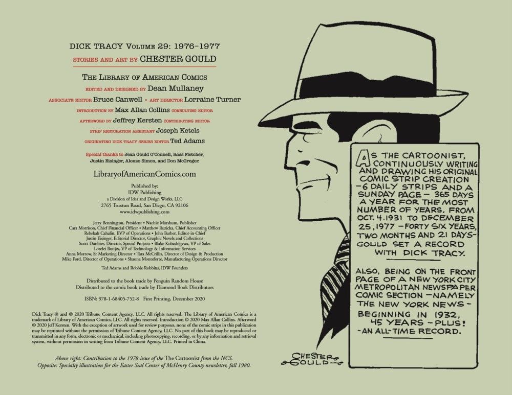 After 46 years, 2 months, and 21 days writing and drawing Dick Tracy Chester Gould retired at the age of 77. In these historic final strips, Gould pits his dynamic detective against the latest in a long line of grotesque villains. Tracy, meanwhile, takes his law and order campaign to television, while his past catches up to him when a criminal he helped convict twenty years ago puts the detective on his “to kill” list. To round out this volume, the squad room is kept busy with two members of B.O. Plenty’s extended family who are anything but law-abiding—Perfume Plenty and her larcenous cousin Dade. All this and more in the ultimate volume of Chester Gould’s Dick Tracy, collecting strips from March 15, 1976 to December 25, 1977.