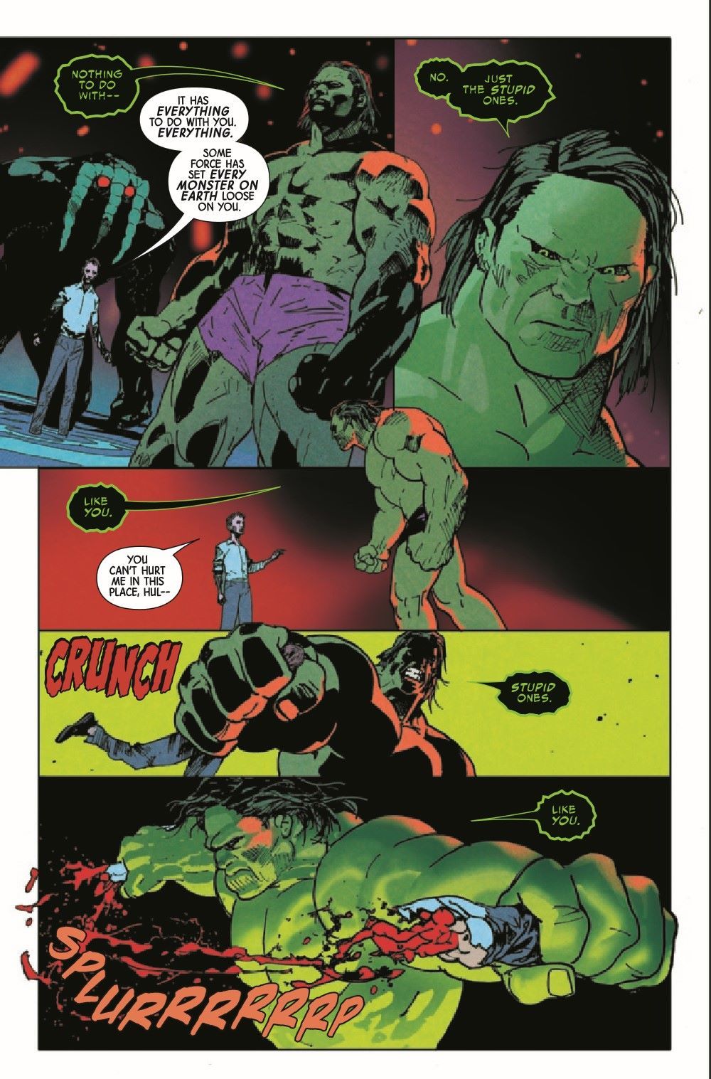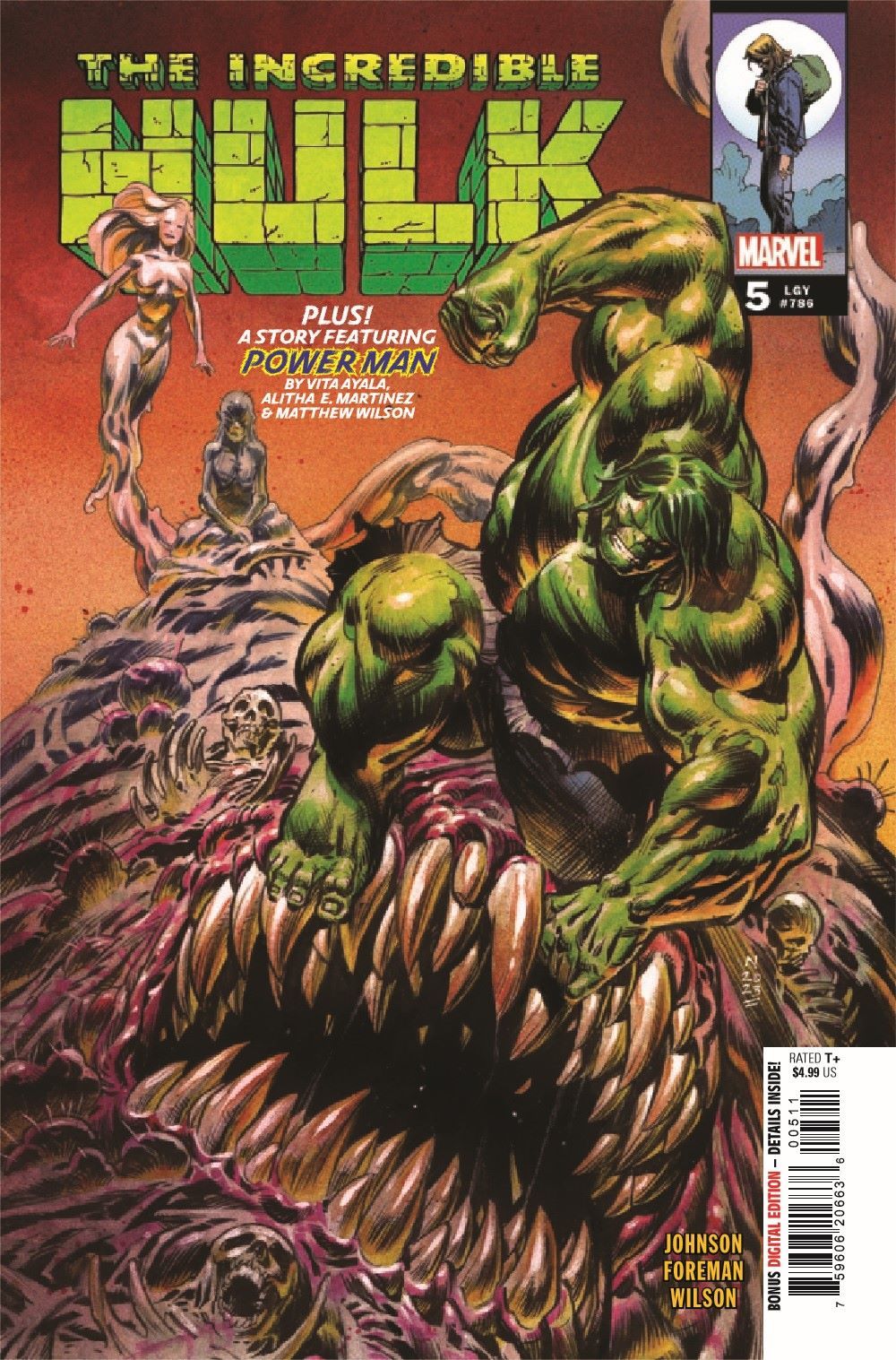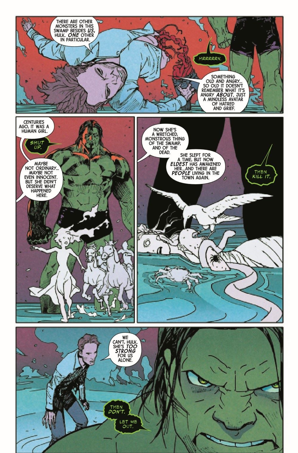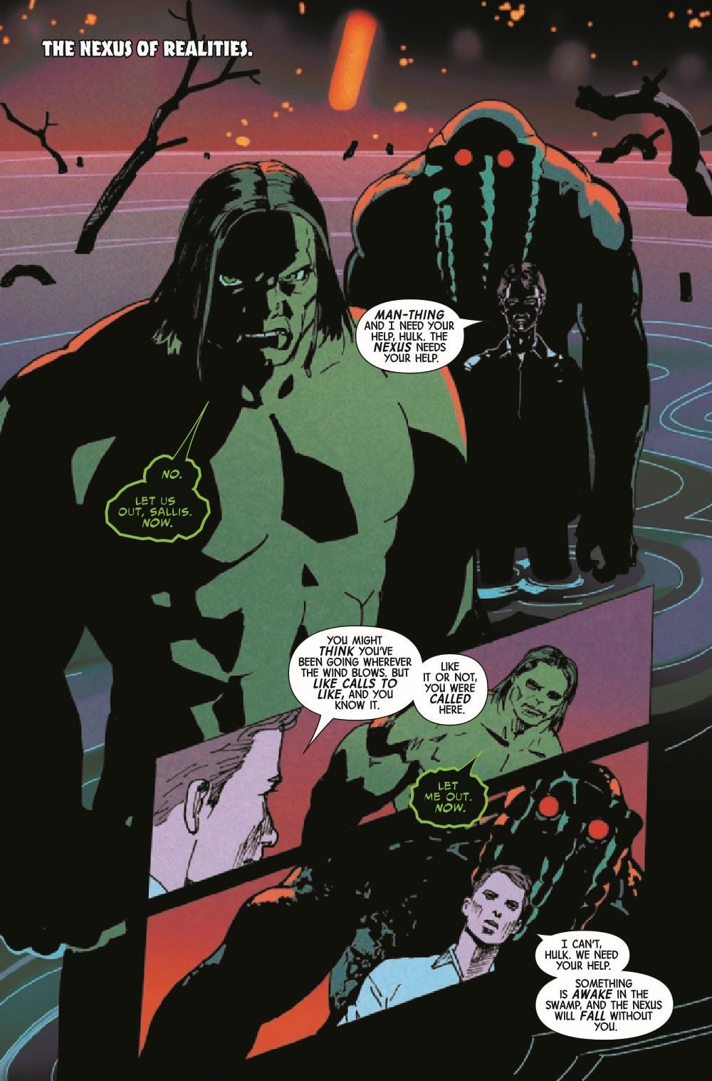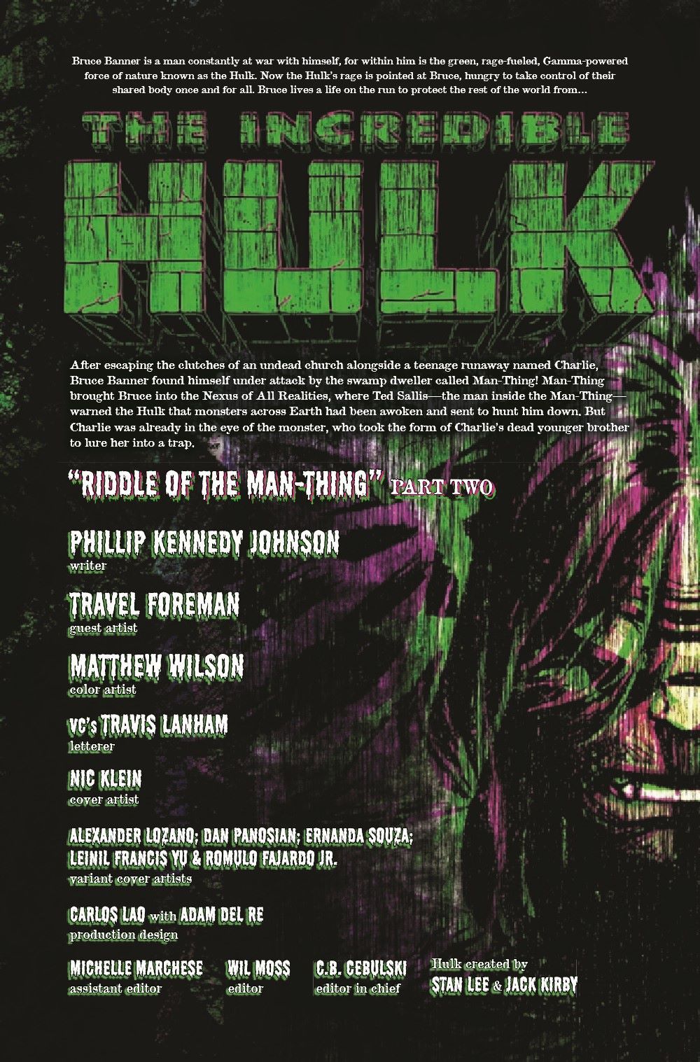 THE SWAMP SIREN REVEALED! Hulk tracks down the beauty that has been luring man and monster alike to their dooms! An epic brawl breaks out between the Jade Giant, Man-Thing and the true face of the Swamp Siren… …but even the Jade Giant is not immune to her song! Plus… A backup story featuring a surprise guest character to honor Latin and Latinx characters and creators!