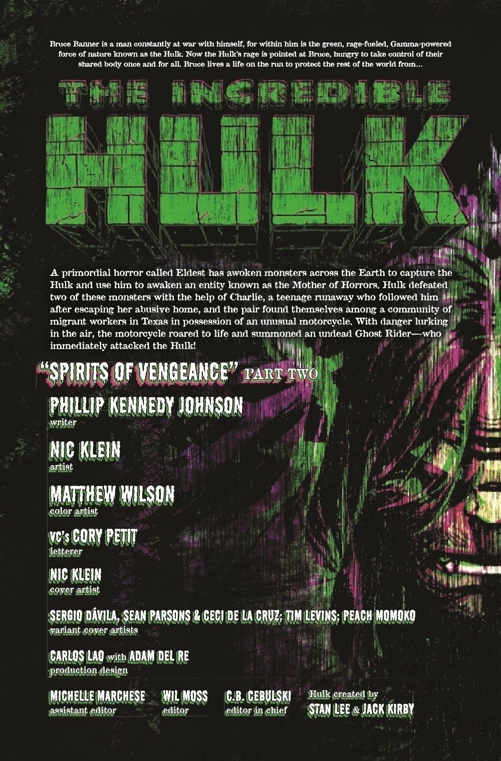 HULK VERSUS THE WAR DEVILS! The Hulk and the undead Ghost Rider make amends, but Ghost Rider smells an evil in the air - and it's been terrorizing a small community. With Bruce's teenage sidekick, Charlie, determined to prove herself as a hero, Hulk must face them down before she gets herself into more trouble than she bargained for!