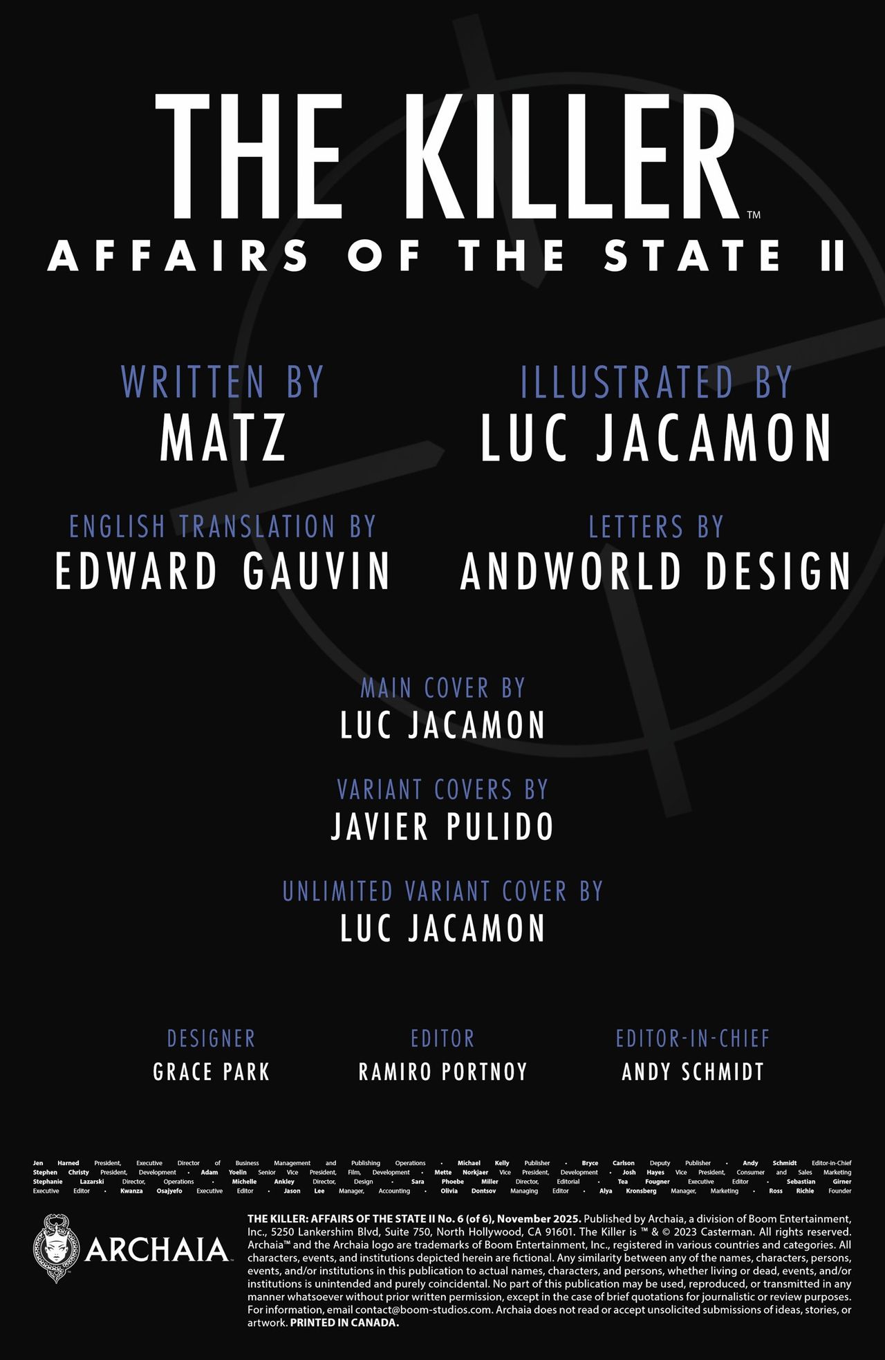 The Killer has followed the truth to its end…and now must face the consequences of what his relentless pursuit has uncovered. With Barbara's true intentions coming to light, can the Killer escape the deadly trap that's been set, or will he be caught in a web of betrayal? Writer Matz and artist Luc Jacamon deliver a tightly wound conclusion of suspense and cold-blooded action in this stunning final issue!