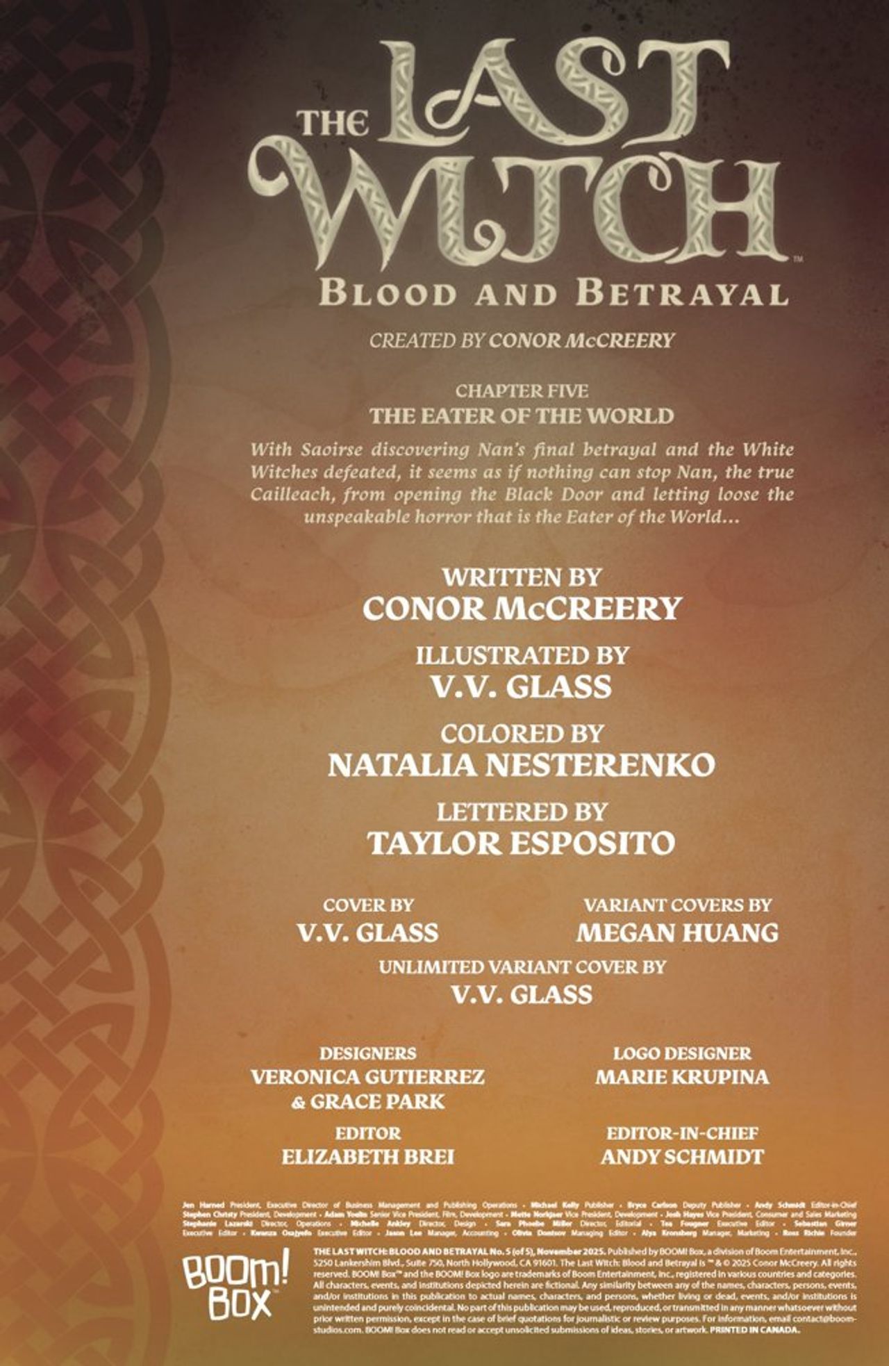 In this final issue, the thrilling saga reaches its epic and unforgettable conclusion! With the White Witches defeated and Nan’s final betrayal revealed, nothing seems to stand in the way of the true Cailleach opening the Black Door.As the Eater of the World threatens total devastation, Saoirse is left reeling—but heartbreak will have to wait. Can she stop the unspeakable horror before it’s too late, or will the world fall into chaos?