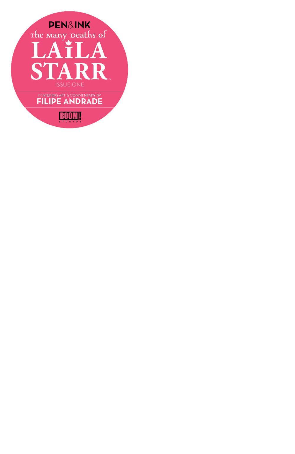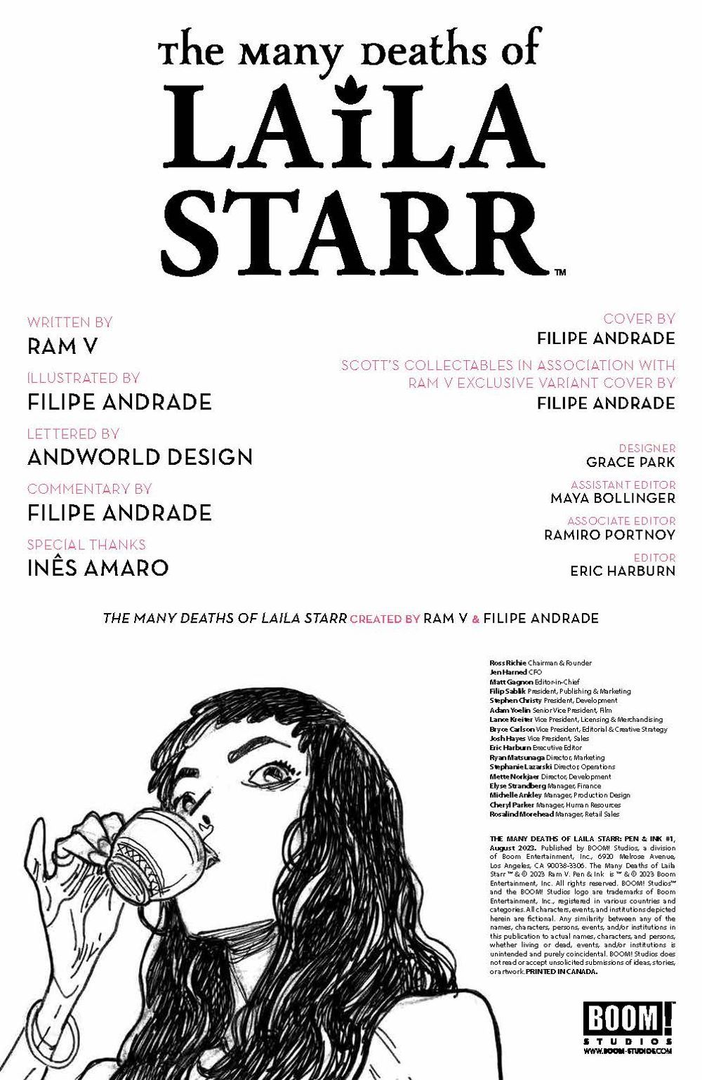 SPECIAL ISSUE. Winner of the 2022 Ignatz Award for Outstanding Series. BOOM! Studios is proud to present the next installment of PEN & INK: a deluxe art-focused format featuring stunning black and white interior artwork with artist commentary. Experience the first issue of the Eisner, Harvey, and Ringo Award-nominated The Many Deaths of Laila Starr in a whole new light, with exclusive notes and annotations from artist Filipe Andrade. This Pen & Ink edition will be available with a premium cardstock cover and luxurious thick wood free interior paper, alongside a gorgeous Spot UV variant cover and a blank sketch cover.