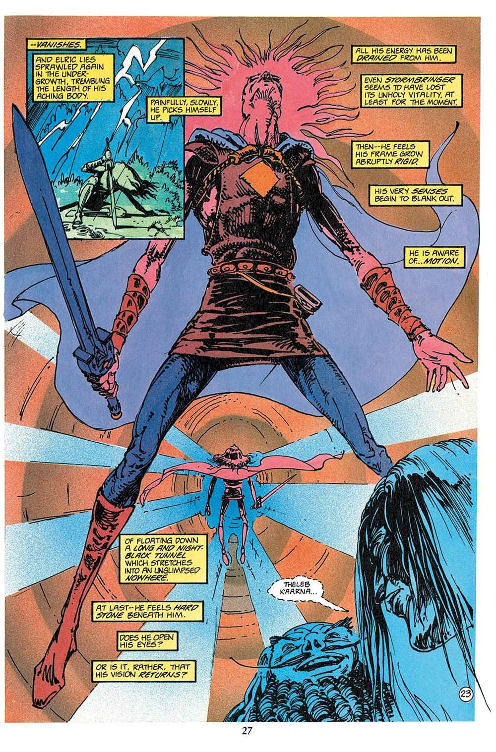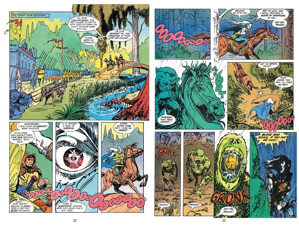 The Bane of the Black Sword is the fifth volume in the saga of Elric, the albino sorcerer who wields the terrible, soul-eating magical sword, STORMBRINGER. This book is a comic adaptation of the collected, interconnected, five novellas of the original novel. The first four stories 'Old Wounds', 'Three Kings in Darkness', 'The King Beneath the Hill' and the 'Flame Bringers' tell of the continuing, eternal struggle of Elric against the elder gods of chaos as Elric finally brings Stormbringer home and finds peace at last in the arms of his true love Zarozinia. Meanwhile in the last story, 'To Rescue Tanelorn', Elric's friend Rackhir the Red must travel through the five gates to seek aid from the Grey Lords in an effort to save the besieged city of Tanelorn from a horde of unimaginable evil.