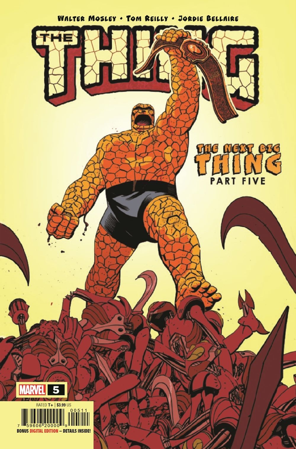 "THE NEXT BIG THING" CONTINUES! What began as just a simple altercation in Manhattan has now spiraled into a cosmic showdown on the moon, as the Thing faces off with a trio of familiar villainous faces from the past! And should he win out, the greatest and most implacable enemy of all is waiting for him in the wings! There's drama, action, romance, revelations, surprises and excitement as Walter Mosley and Tom Reilly's epic adventure reaches its penultimate issue!