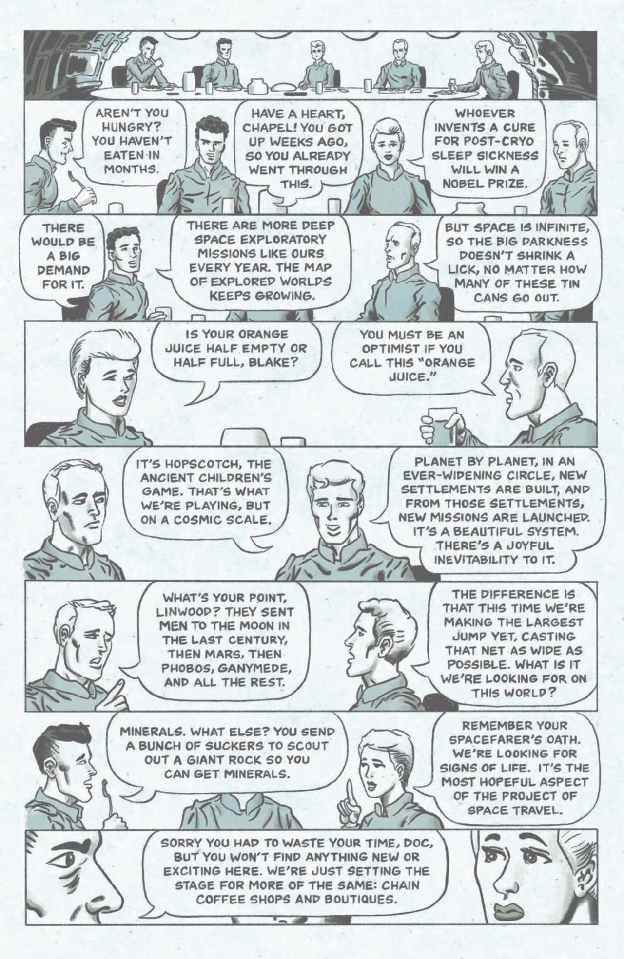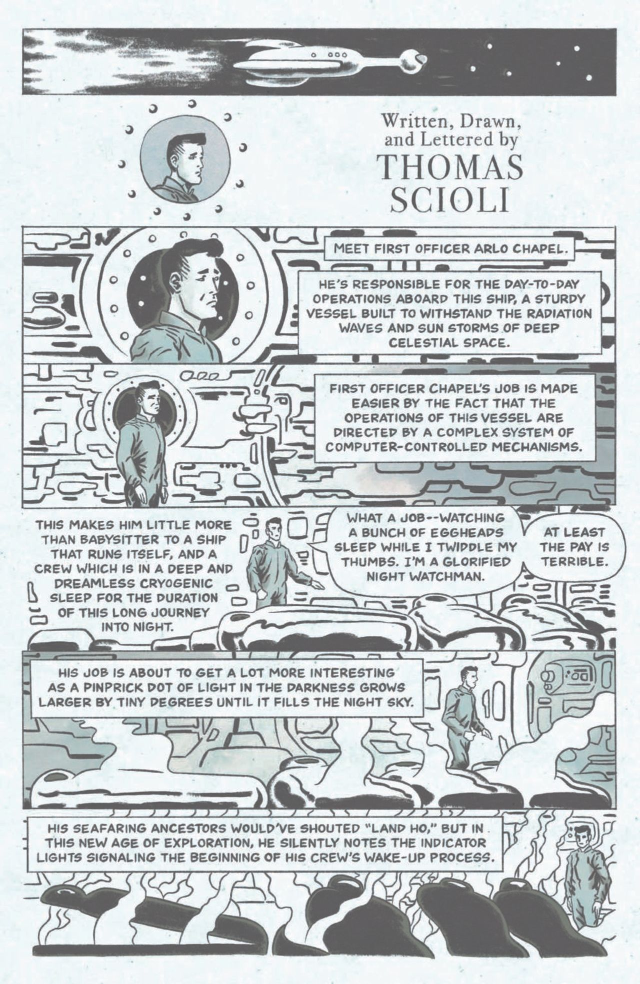 This all-new Twilight Zone anthology series continues with standalone stories by some of the best creators in comics today! Each issue is a fresh tale in the vein of the iconic original television series that's captivated audiences for over 60 years. And like the show, these stories will be revealed in terrifying black and white! THIS ISSUE: At the farthest reaches of the galaxy, beyond the horizon of humanity and the hopes for salvation, a spaceship of slumbering astronauts journeys in search of intelligent alien life. They've left behind their families, their planet, their pasts, and all the trauma and comforts those things contained. But our crew of adventurers will find their pasts are never that far behind them and intelligent alien life has its own plans for their future…in the Twilight Zone! From the surreal mind of Tom Scioli, the cartoonist who brought you Jack Kirby, Fantastic Four: Grand Design (Marvel), the Transformers vs G.I. Joe crossover, and Godzilla Monsterpiece Theatre (IDW).