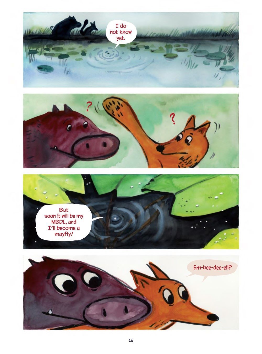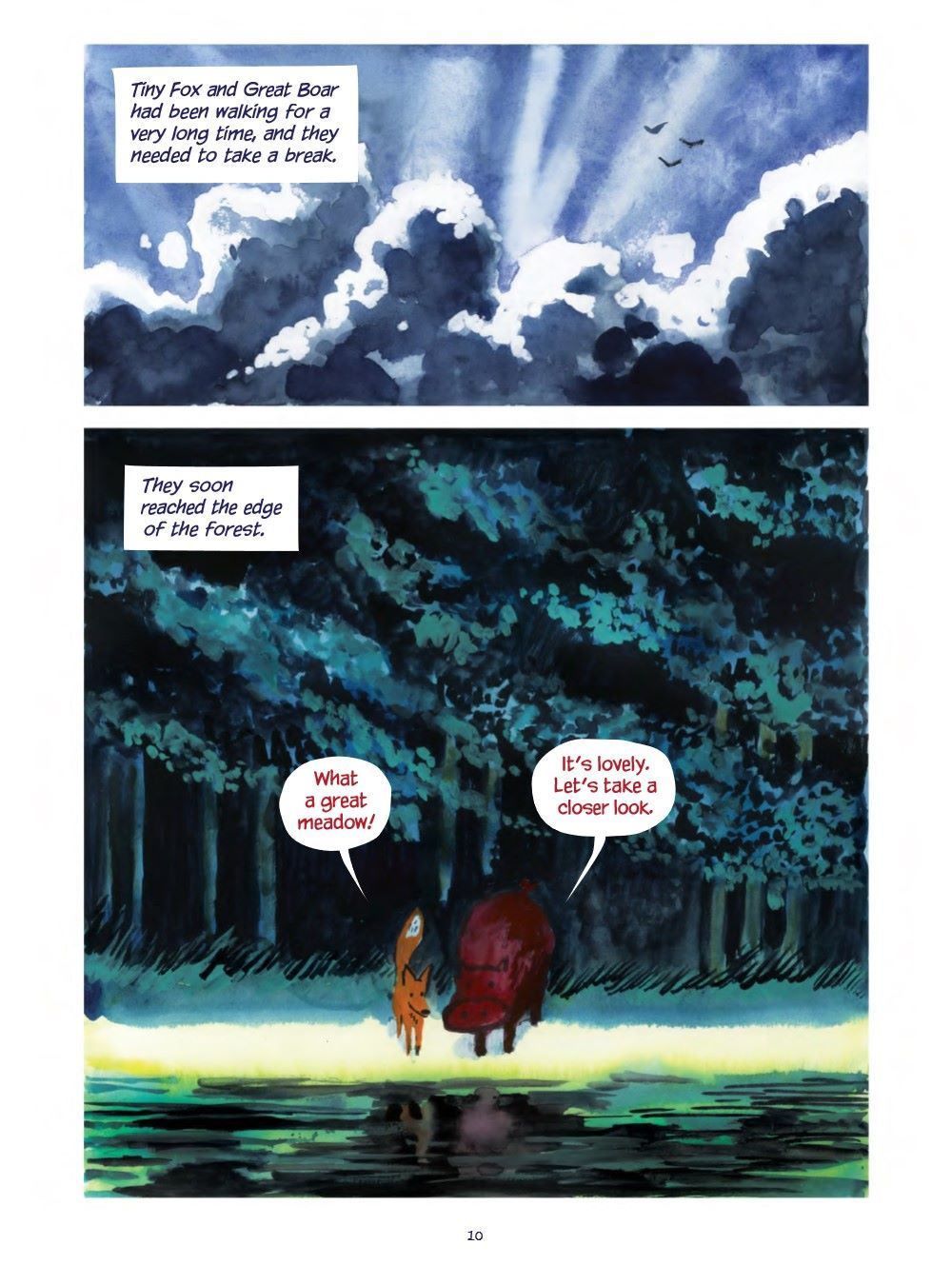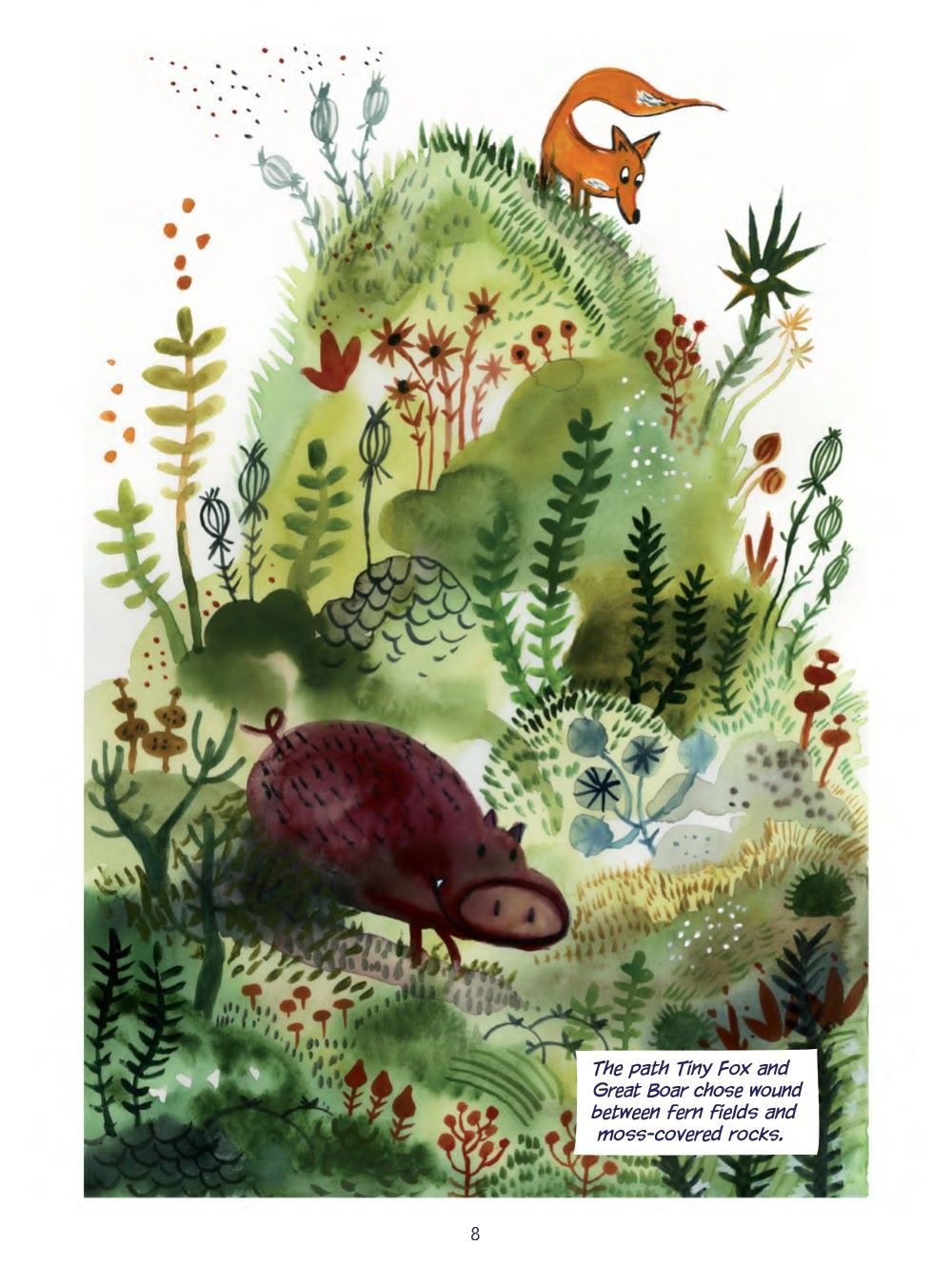 Tiny Fox and Great Boar have spent much of their time together playing, exploring, and adventuring. From beautiful forests all the way to the enchanting seaside, they have had such joyous times! When they set their sights on the marshy wetlands, they meet a young mayfly and become quick friends. But when their time with the mayfly is unexpectedly cut short, Fox and Boar experience true sadness. This sadness feels too much for Fox to bear, but luckily he has Boar by his side to teach him how to be brave and remain hopeful for the adventures that lie ahead.