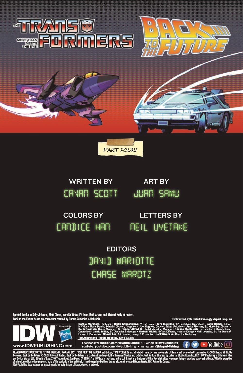 Outmatched by the Decepticons, running on empty, and on the ropes, Marty McFly and the Autobot Gigawatt show why nobody calls them chicken! Will the final confrontation be in Marty's future, or will he and his companions make it back to fix the timestream before the Decepticons win? Find out in the heaviest issue of the whole series!