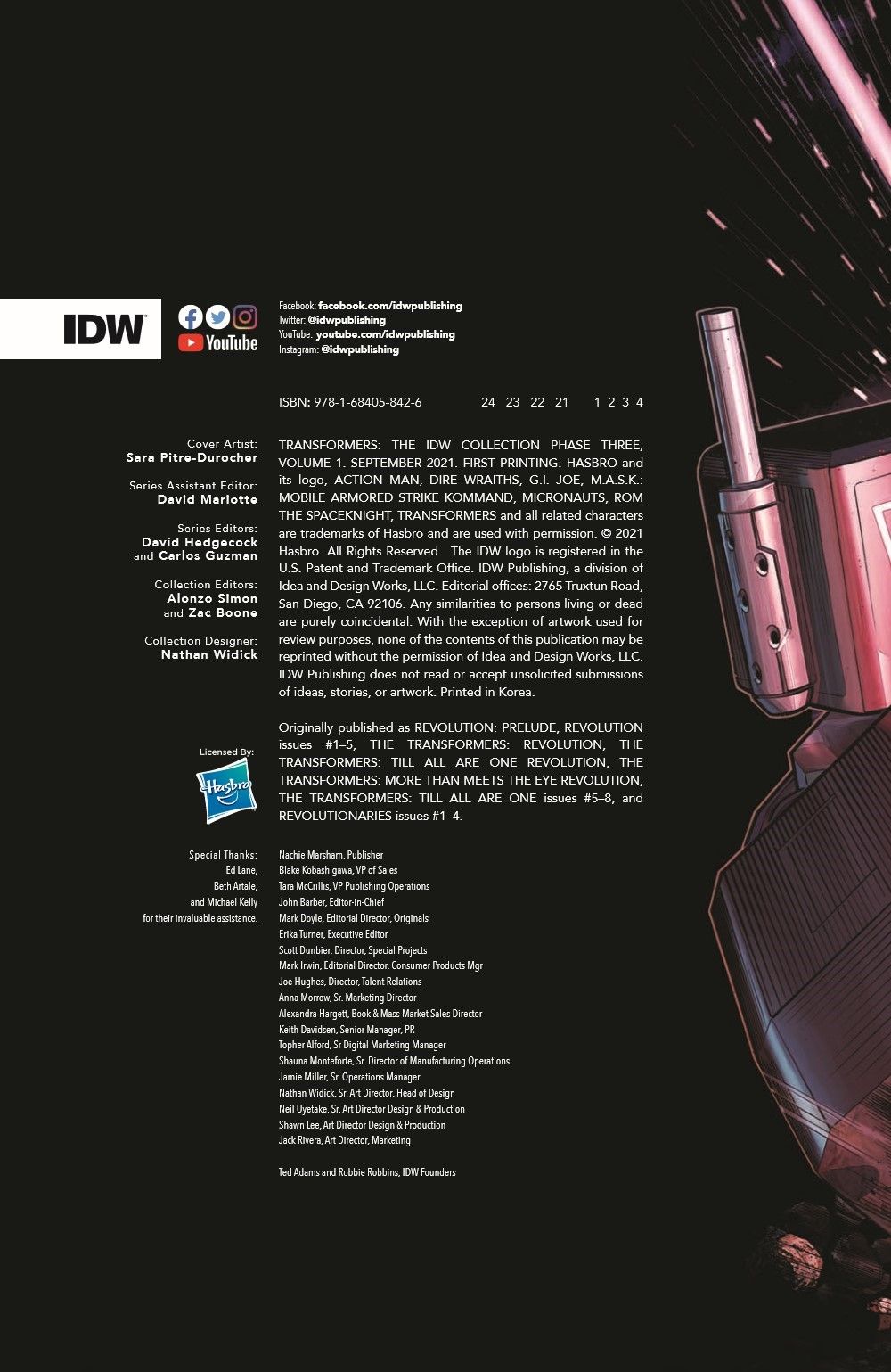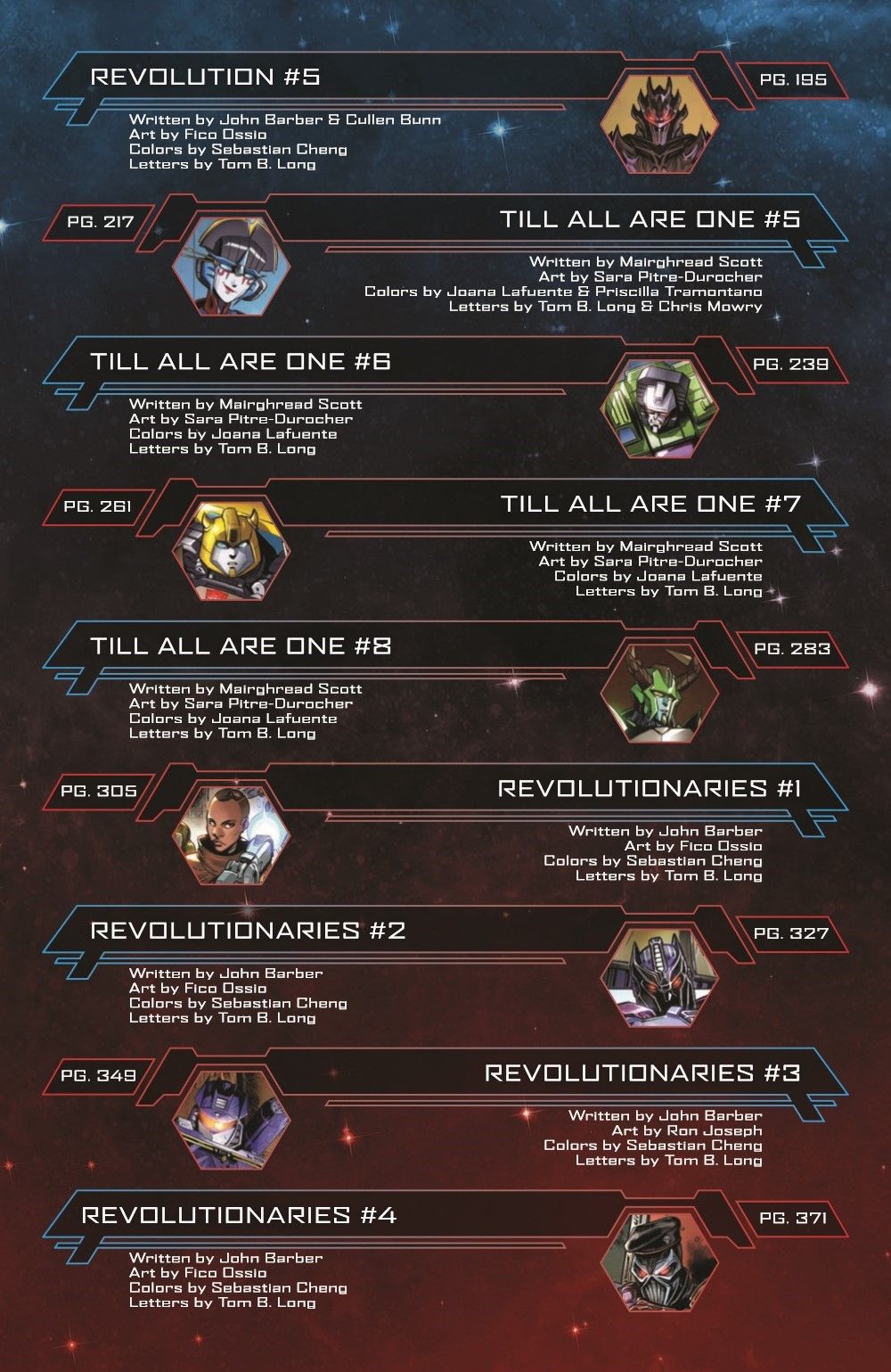 Collects Revolution issues #0-5; the Transformers: Till All Are One, Transformers, Action Man, and Transformers: More Than Meets The Eye Revolution one-shots; Transformers: Till All Are One issues #5-8; and Revolutionaries issues #1-4.