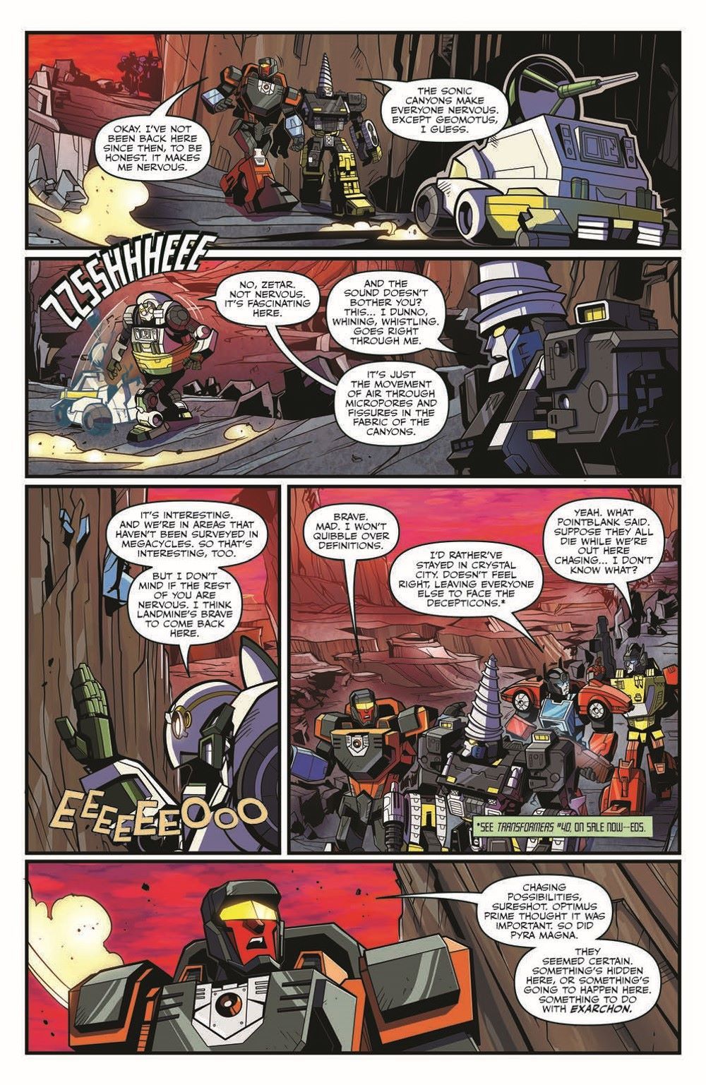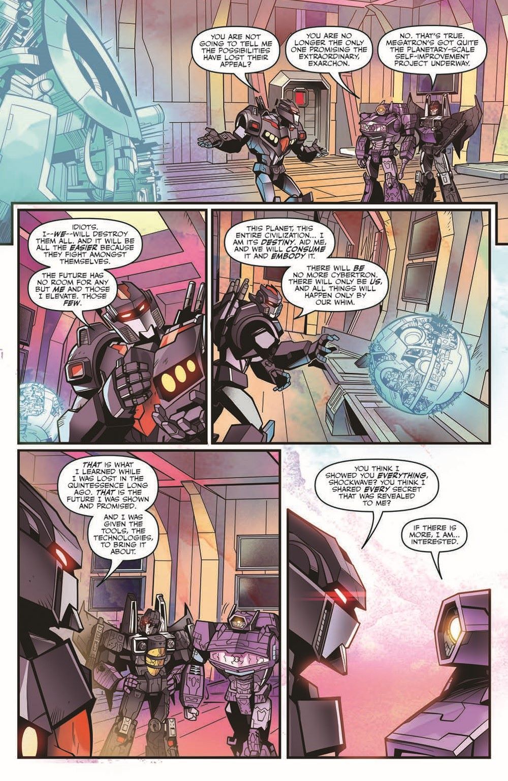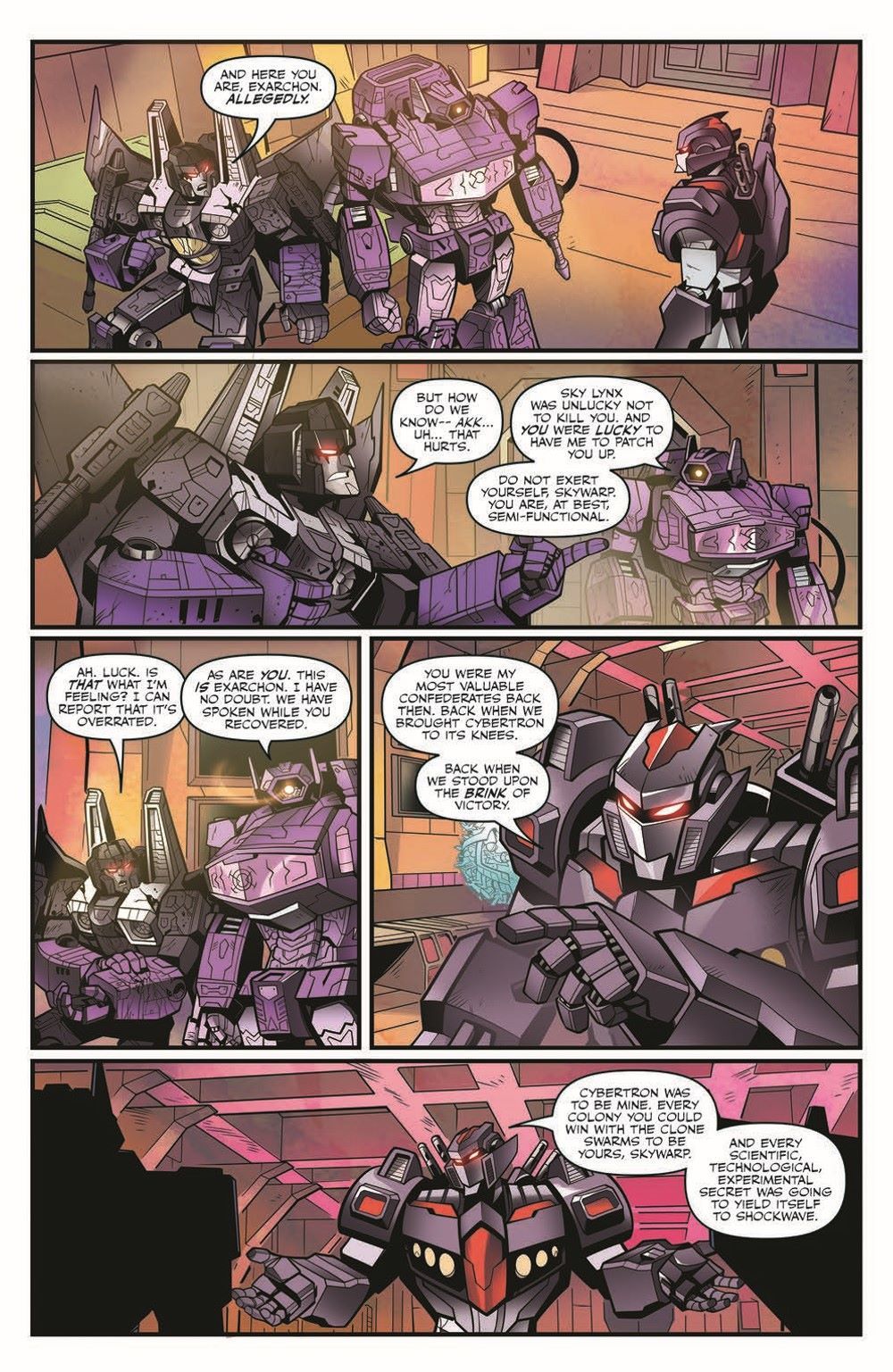 The Three-fold Spark has returned and nowhere on Cybertron is safe! Exarchon, who single-handedly started Cybertron's last war, walks among the living again. Reunited with his former generals, Shockwave and Skywarp, he seeks once more to conquer Cybertron! But there may be hope... if Cyclonus can convince Megatron to work with the Autobots! The can't miss companion to the Transformers ongoing!