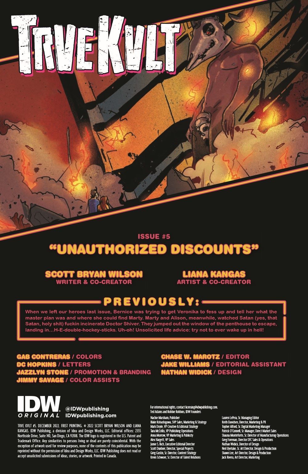 Bernice is in Hell (figuratively) as she and an unusually introspective Veronika search for Marty and Alison, who are in Hell (literally), which isn't fun but is still better than being elbow deep in a broken milkshake machine with angry customers screaming at you. Satan and his demons walk the Earth, the age of endless pain is nigh, and two fan favorites from issue one finally make their triumphant return! It's going to be a hell of a time in the super special final issue of TRVE KVLT from SCOTT BRYAN WILSON (Batman: Gotham Nights, Altered Carbon, Pennyworth) and LIANA KANGAS (Star Wars Adventures, She Said Destroy).