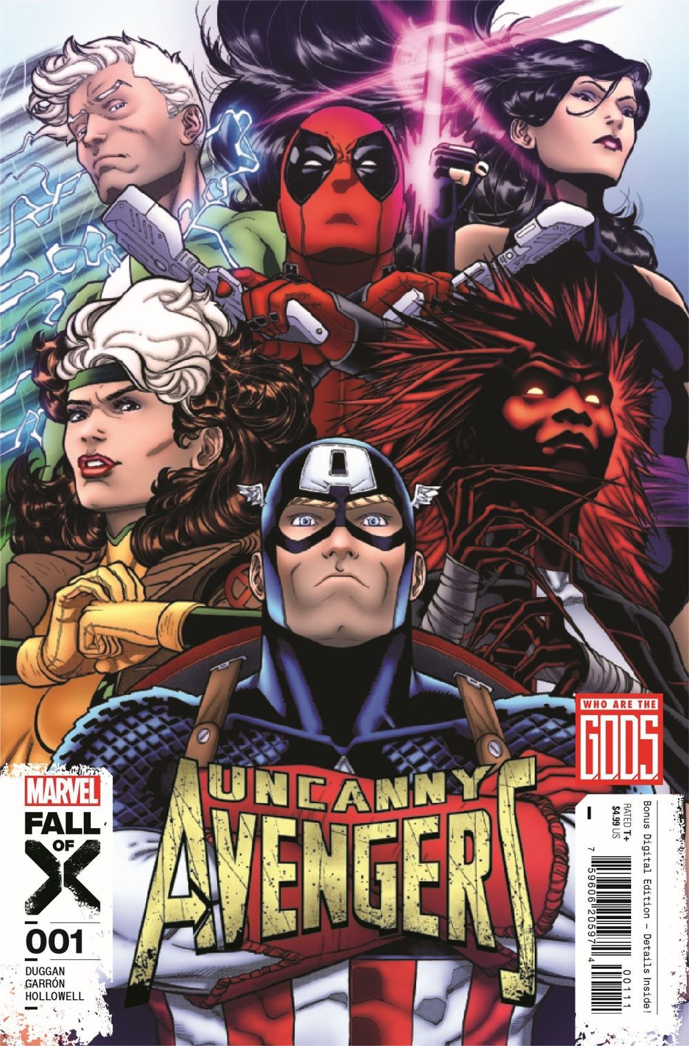 The FALL OF X calls for the return of the Avengers' Unity Squad! Innocent people and world leaders are dead after simultaneous attacks on the U.S. and Krakoan governments, and that means one thing: It's time for a new squad of Avengers. False-flag attacks meant to whip up anti-mutant hysteria are unfolding, and hey, some of Steve Rogers' best friends are mutants. Your new unity squad is: Captain America, Rogue, Deadpool, Quicksilver, Psylocke and Monet. They must solve the mystery of who the new, murderous Captain Krakoa is - and stop his team of killers from igniting the fires of a new world war. PLUS: A bonus page written by Jonathan Hickman - WHO ARE THE G.O.D.S.?