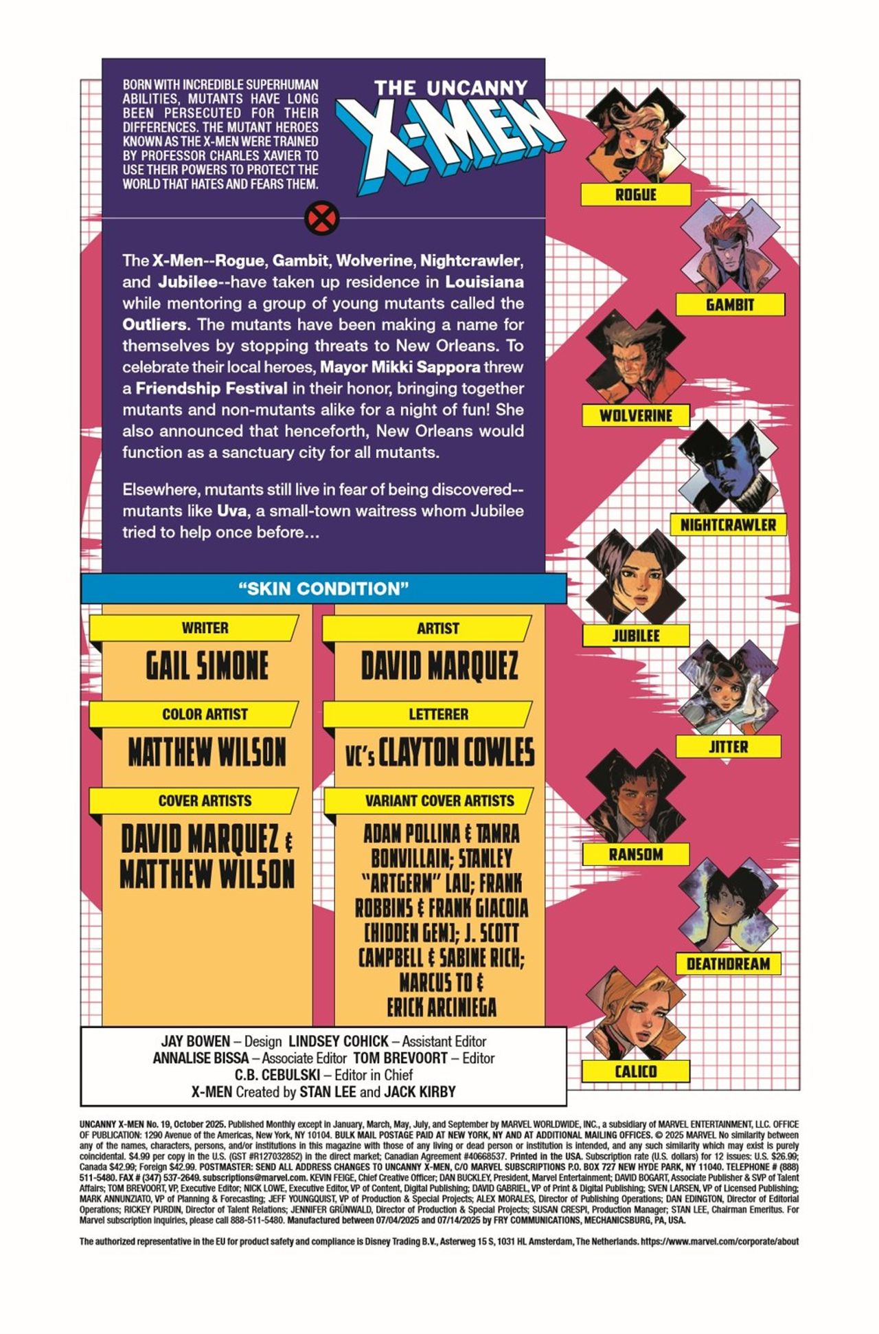 During the changing relations between mutants and the city of New Orleans, two of the best guns for hire come to town with a mission in mind, and their target for that mission is an X-MAN! DEADPOOL and OUTLAW guest-star in this dangerous tale of MAYHEM vs. MUTANT! Also, an Outlier gets ARRESTED? Nightcrawler gets the wrong BEER? All this and more in our wildest issue yet!