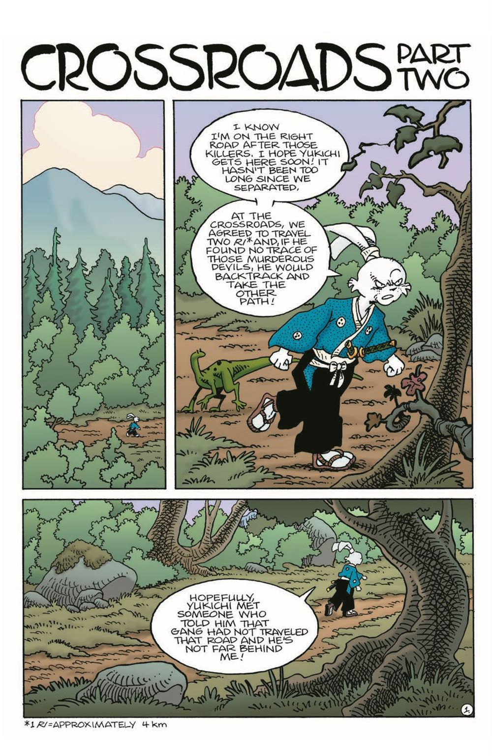 Crossroads, part 2 (of 2). Usagi and Yukichi are on the trail of a murdering samurai band but have to split up when they reach a crossroad. Usagi catches up to the samurai but even he cannot stand up to six accomplished swordsmen by himself. Meanwhile, Yukichi meets up with an even greater danger!