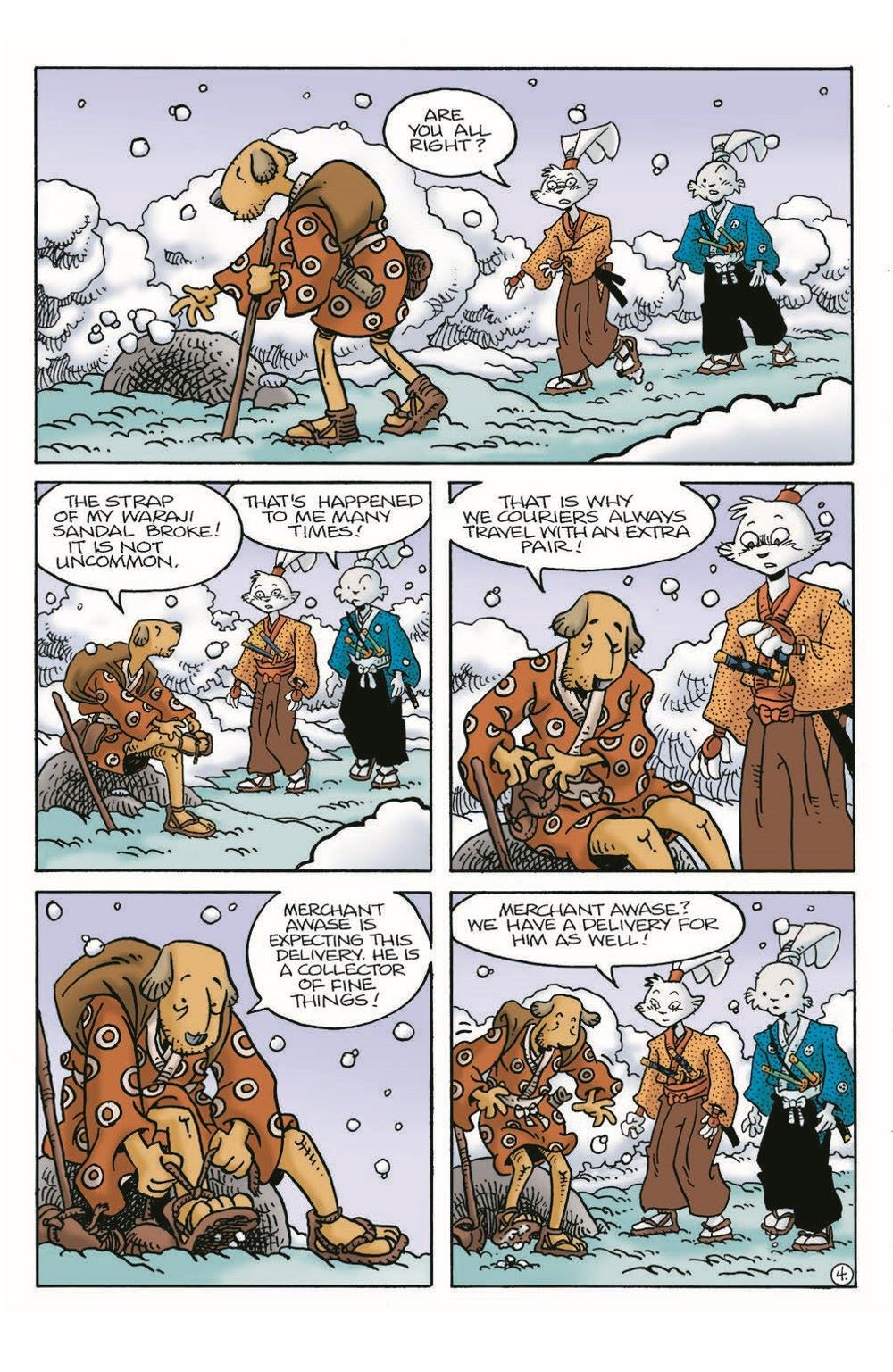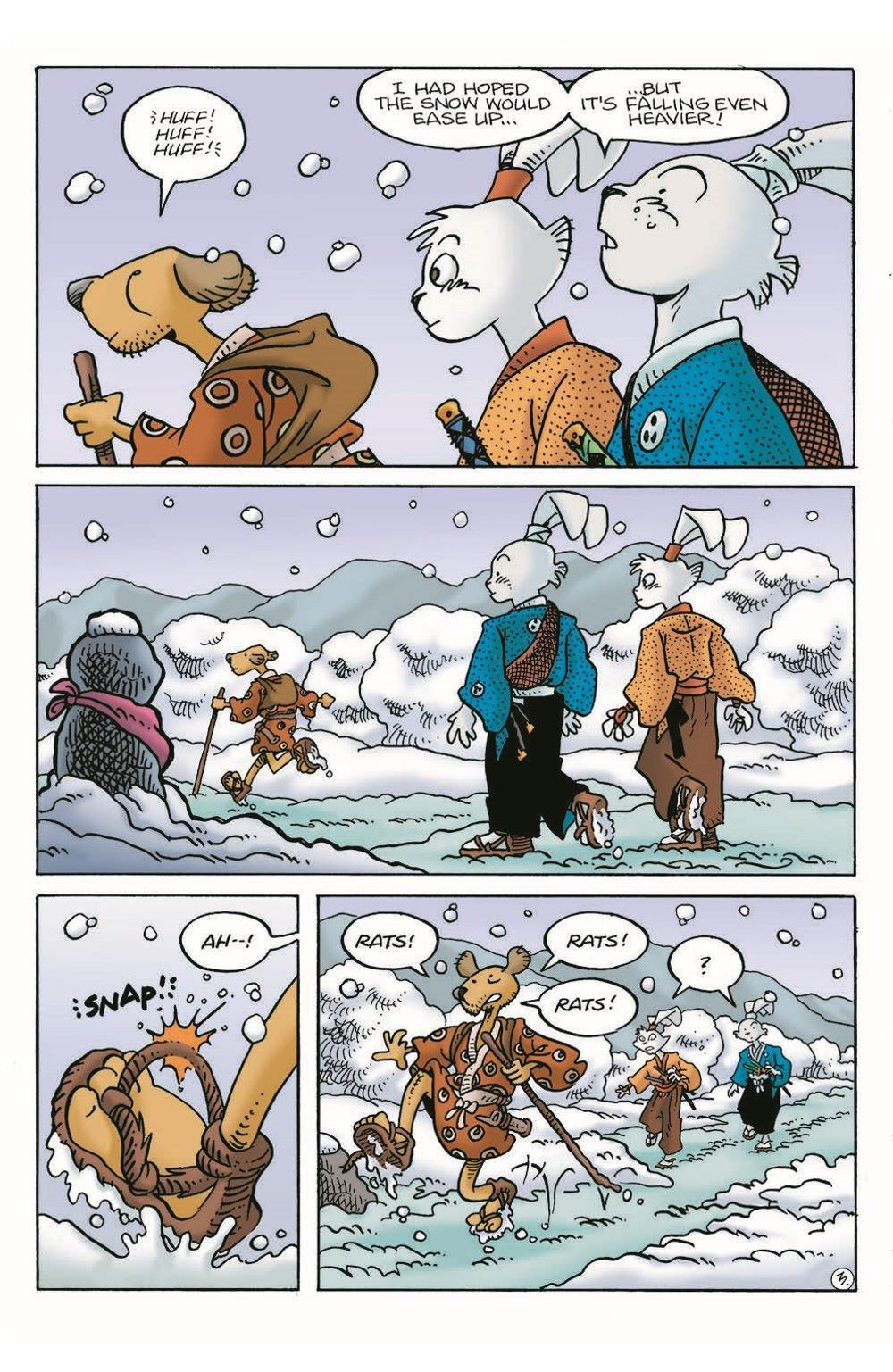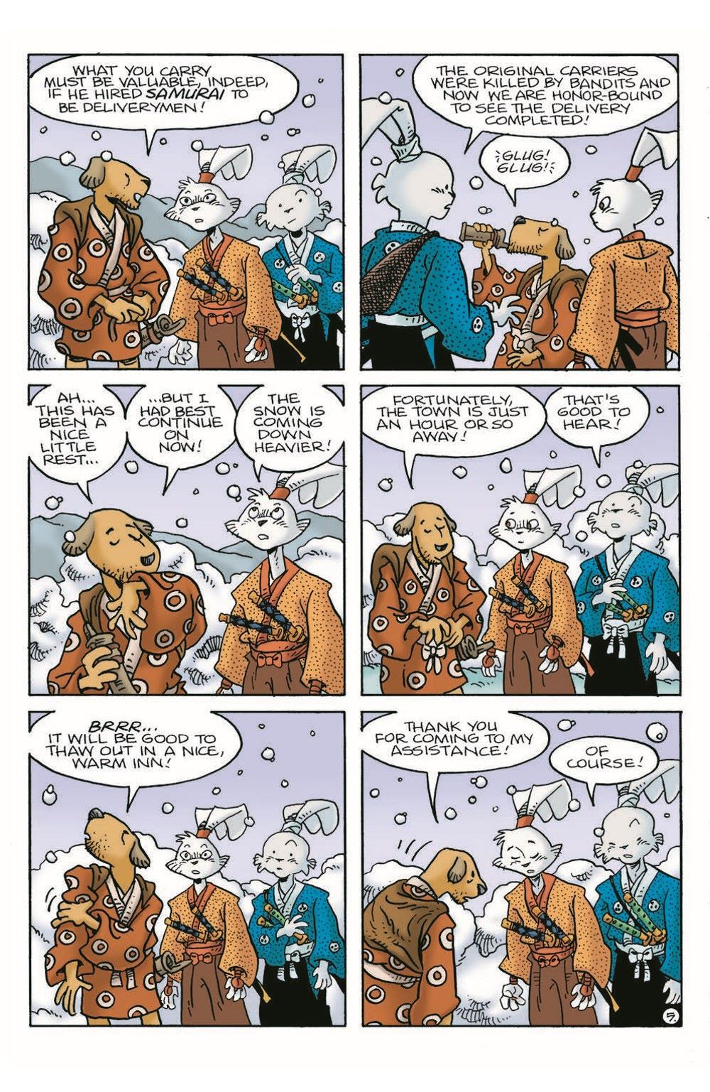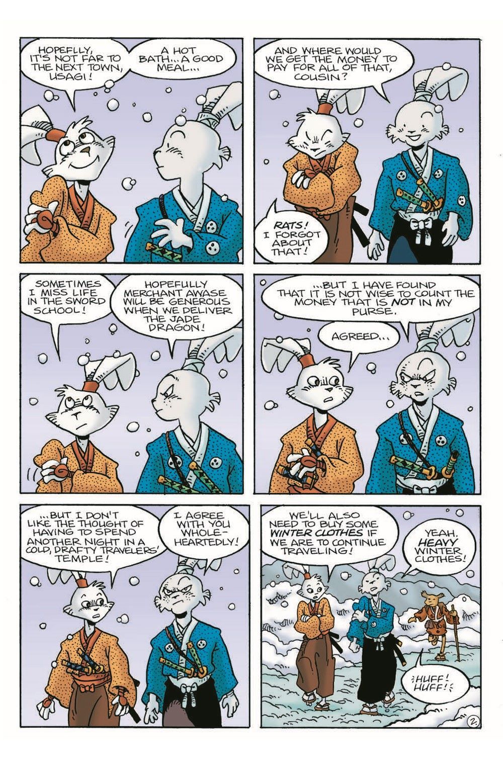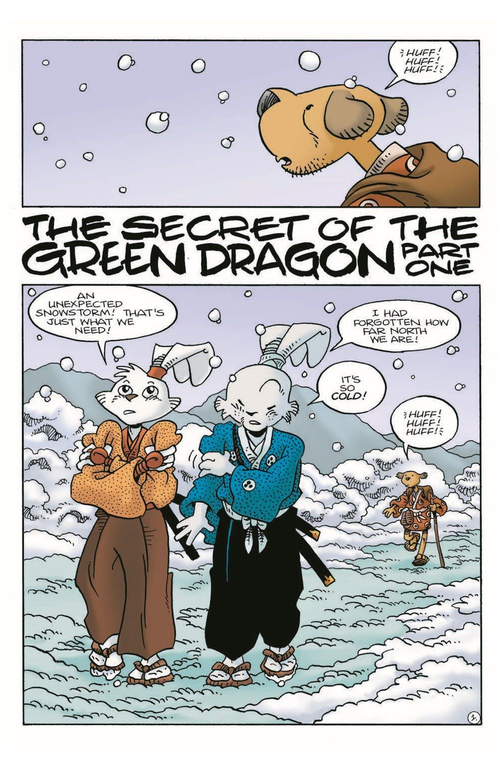 The Secret of the Green Dragon, Part 1 (of 3). Usagi and Yukichi are obligated to deliver a priceless jade dragon to Merchant Awase. They witness a runner delivering a parcel of jewels to the same merchant killed on the road ahead. However, the killers left the jewels and escaped with the container. They come to the realization that the box they carry may be even more valuable than the jade within.