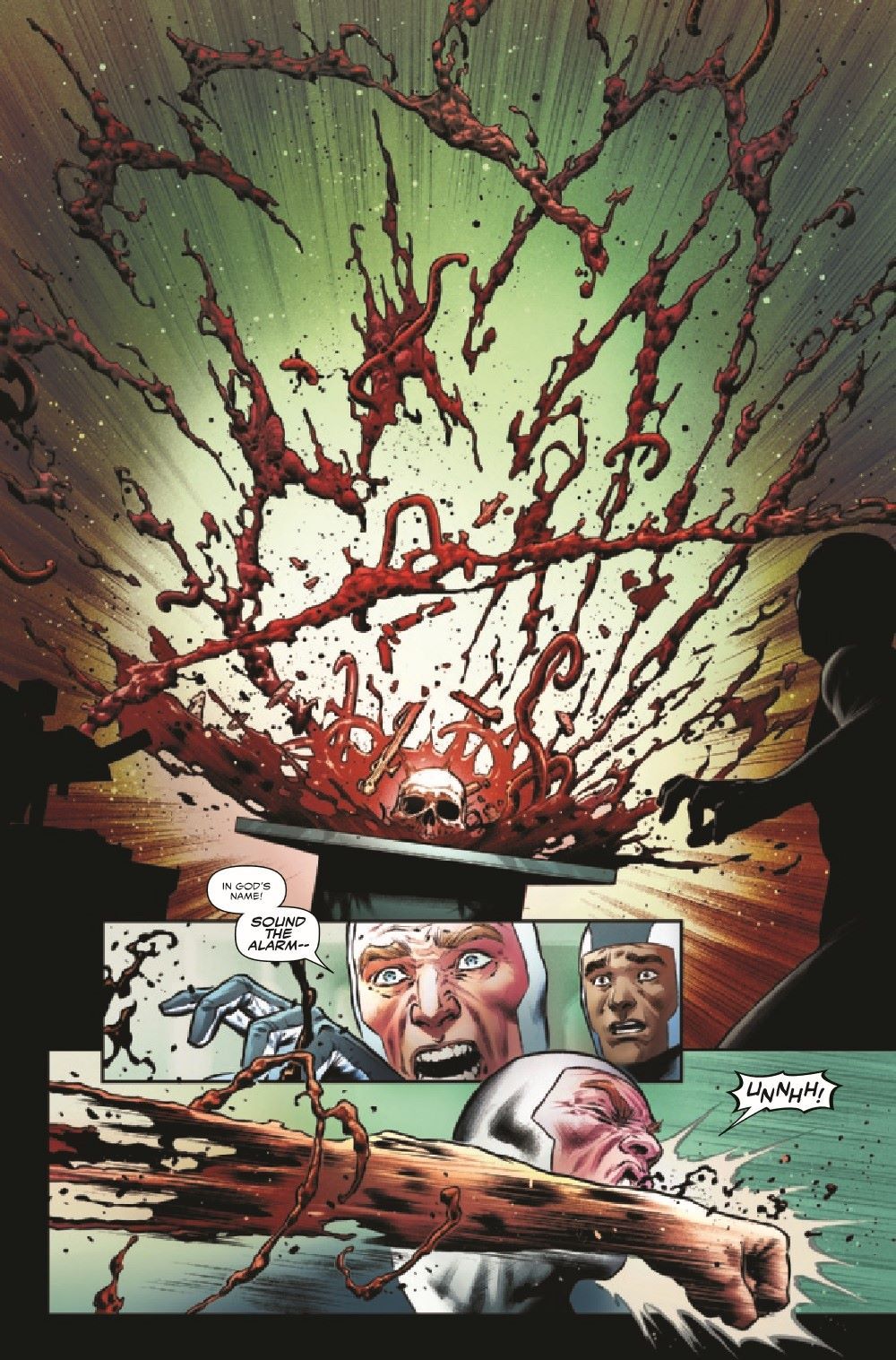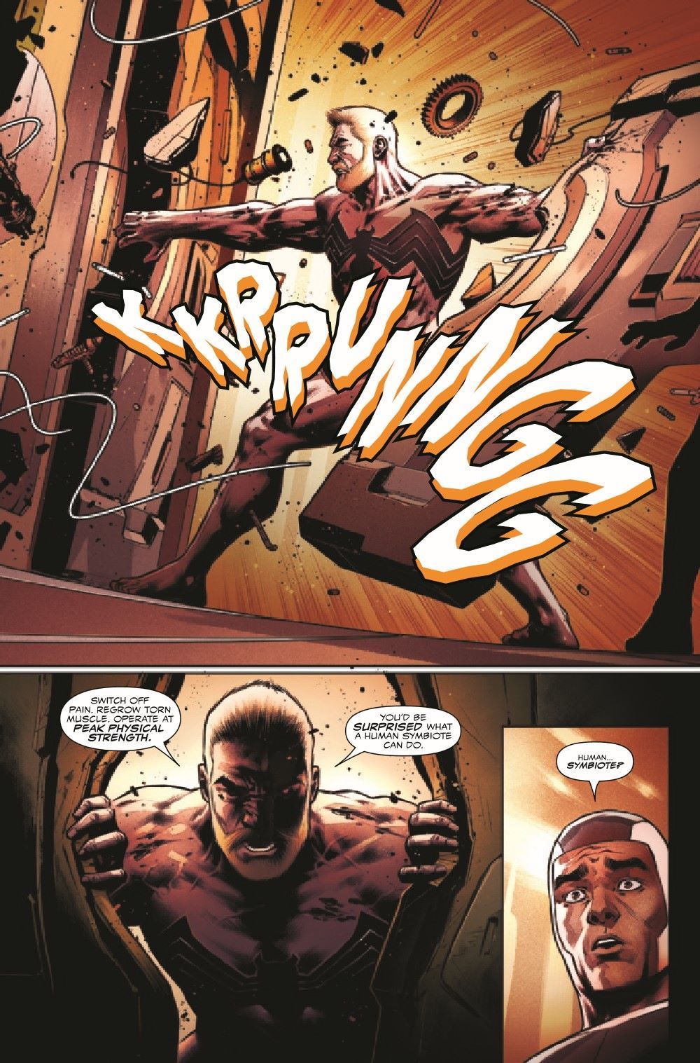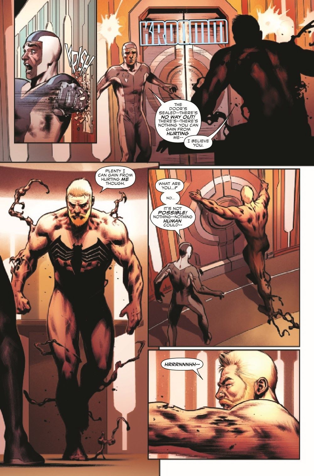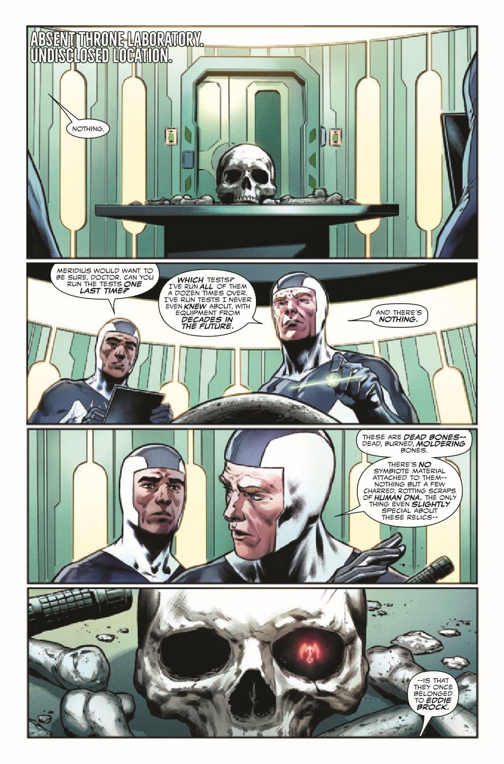 THERE AND BROCK AGAIN! Eddie Brock has fought and fought and fought some more to get back to the Marvel Universe and fight by his son's side. IN THIS ISSUE - HE SUCCEEDS! And the charred skeletal remains of Eddie's physical body are REANIMATED by the King in Black incarnate! Wielding the very marrow in his broken bones, Eddie makes his presence in the present known in explosive fashion! Not that you'd expect anything less!