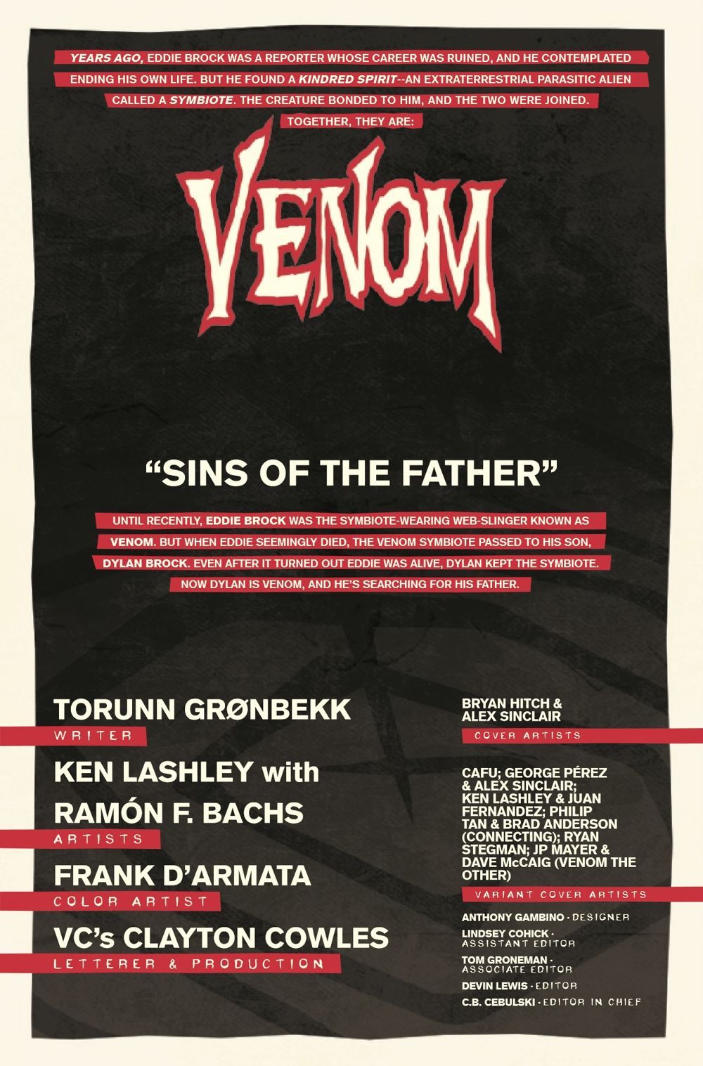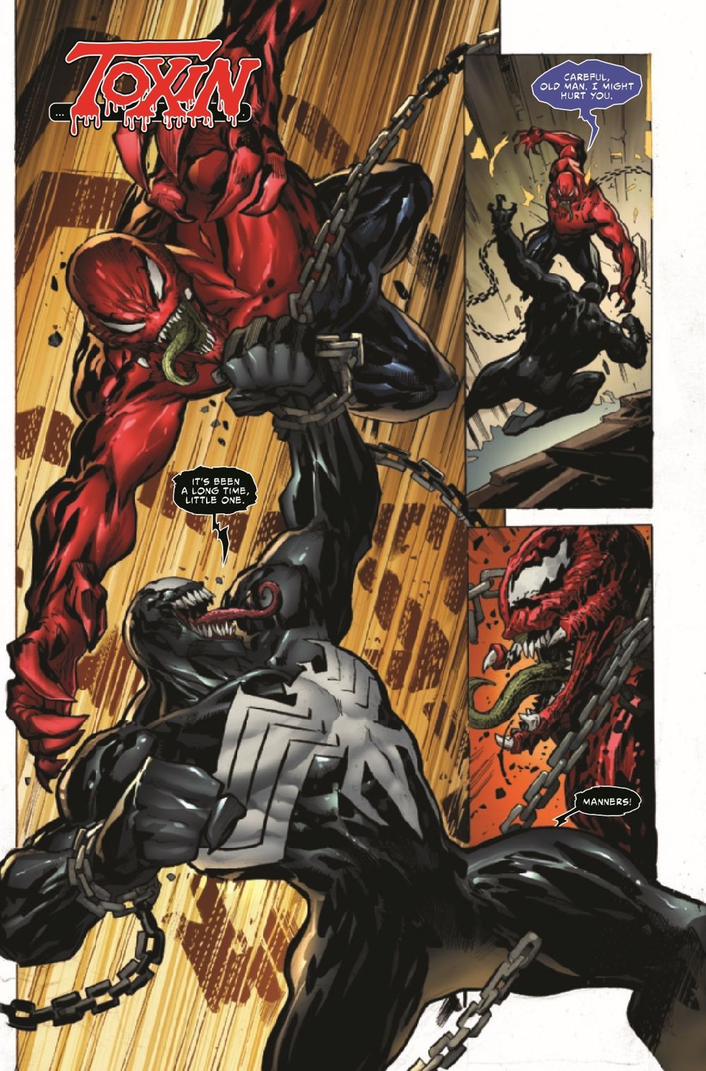 A NEW VISION OF TOXIN! Toxin is the offspring of the most dangerous symbiote in the history of the Marvel Universe: CARNAGE. But while Carnage and Cletus Kasady are separated and both devising machinations and plans of cosmic bloodshed and conquest, what has its progeny been doing? And will Dylan Brock or the Venom symbiote survive when they come face to face with this latest terrifying Toxin?! PLUS: Toxin isn't the only symbiote in this story who's unlike anything you've ever seen! The symbiote family is about to grow a little larger… and what's coming will change the continuing saga of the symbiotes FOREVER!
