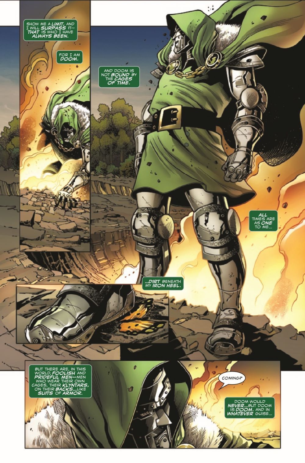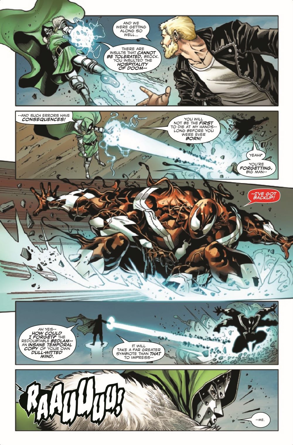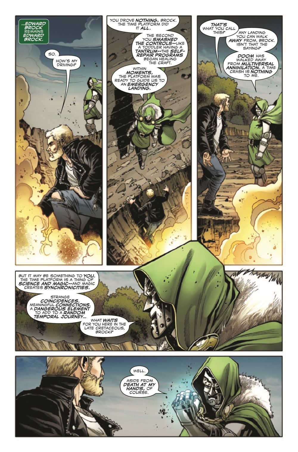 A TIME OF DOOM! SPECIAL OVER-SIZED ANNIVERSARY ISSUE! Eddie Brock needed access to Doctor Doom's time platform - and in getting to it, got more than he ever bargained for, battling the most notorious super villain in the Marvel Universe through time itself! Luckily, Eddie's well versed in navigating the timestream thanks to his recent adventures. He's poised to take his conflict with Meridius to its frenetic and fist-filled finish - if he survives DOOM! PLUS! Eddie's battle with Doom will land him, briefly, in a very unexpected place…MIDTOWN HIGH SCHOOL! But what, or who, could he find there?