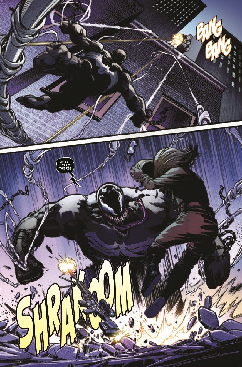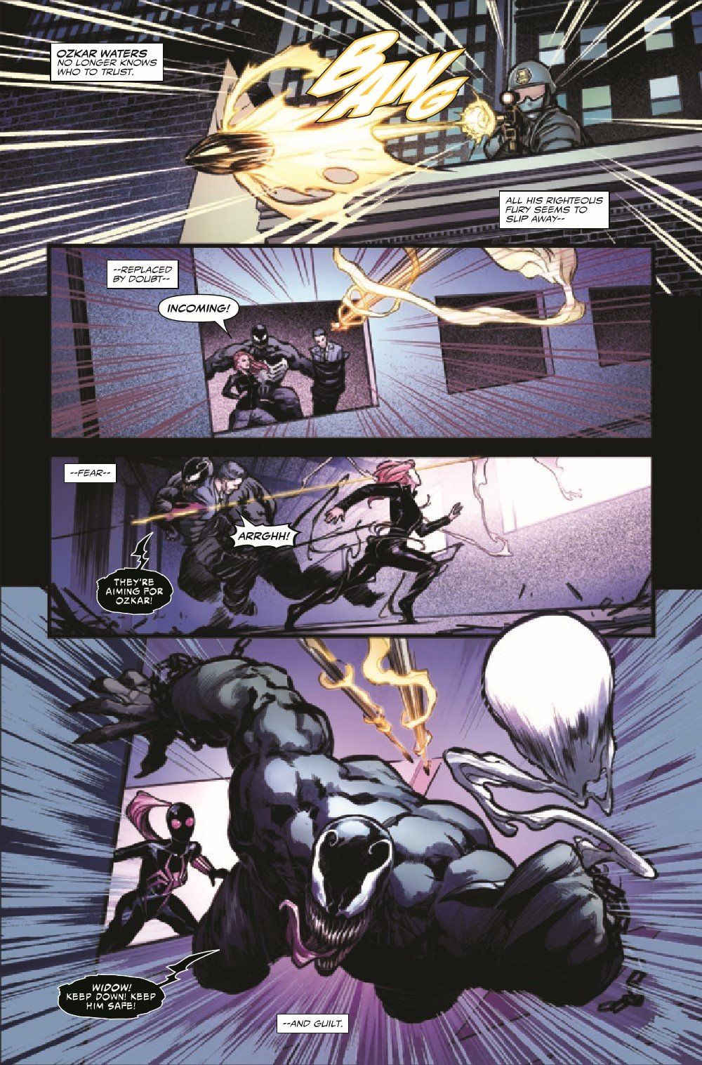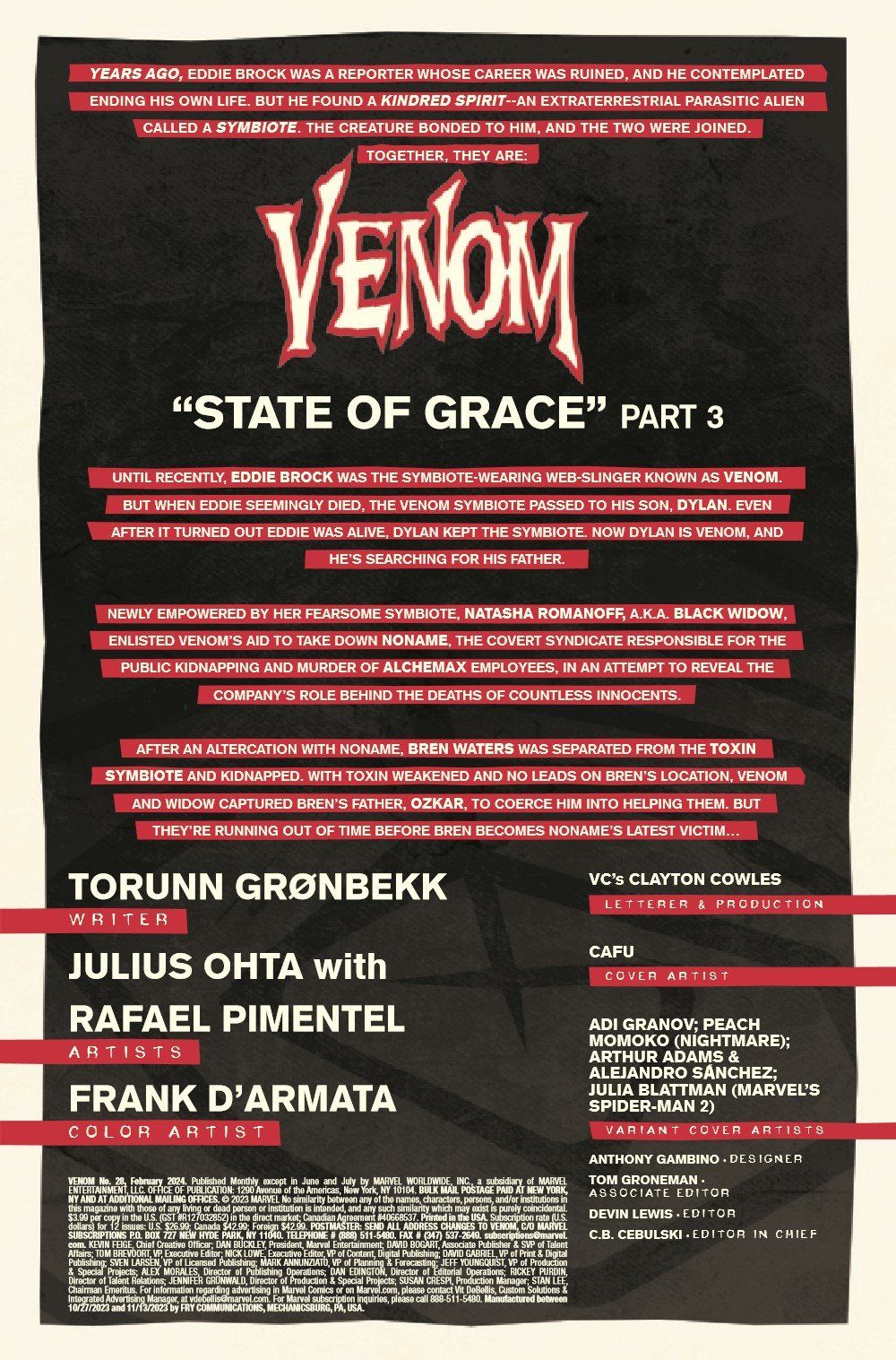 A SYMBIOTIC FREE-FOR-ALL! Freshly united and teamed up, VENOM and TOXIN fight like hell to save one of the Marvel Universe's greatest heroes from the darkness within her, unleashed by an all-new, all-horrifying symbiote! Remember how VENOM used to eat brains but then got over that as it tried to become a hero? Well, THIS symbiote doesn't share that kind nature!