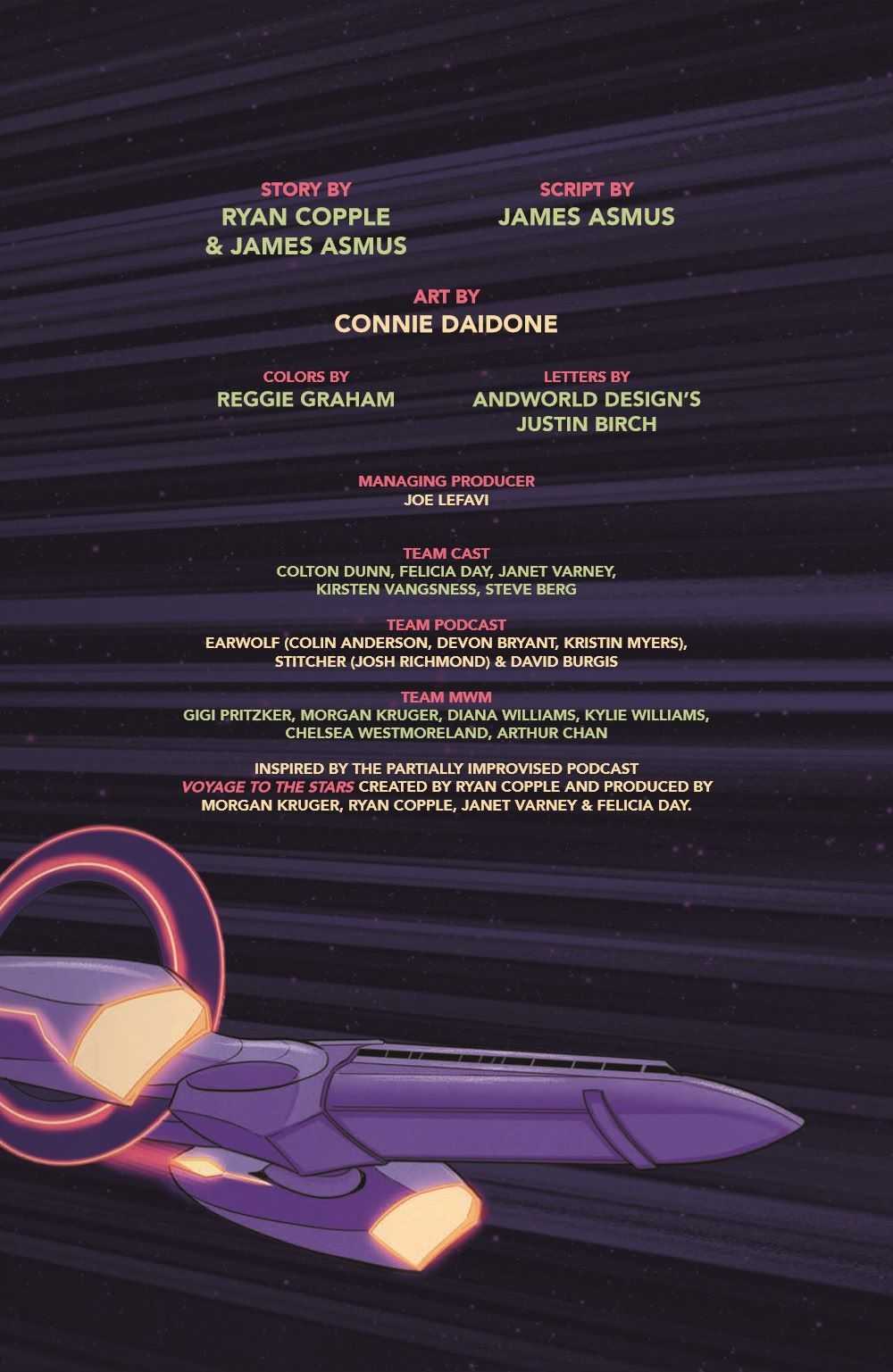 The hit sci-fi comedy podcast blasts into comics with this all-new graphic novel adventure! Voyage to the Stars is a bonafide podcast phenomenon starring Colton Dunn (Superstore), Felicia Day (Supernatural), Janet Varney (Legend of Korra), Kirsten Vangsness (Criminal Minds), and Steve Berg (Drunk History)! With 2.5 million downloads in its debut year and over 100,000 viewers on Twitch, the wild sci-fi podcast that's consistently ranked in the Top 100 for comedy is now on its way to conquer the comics world.