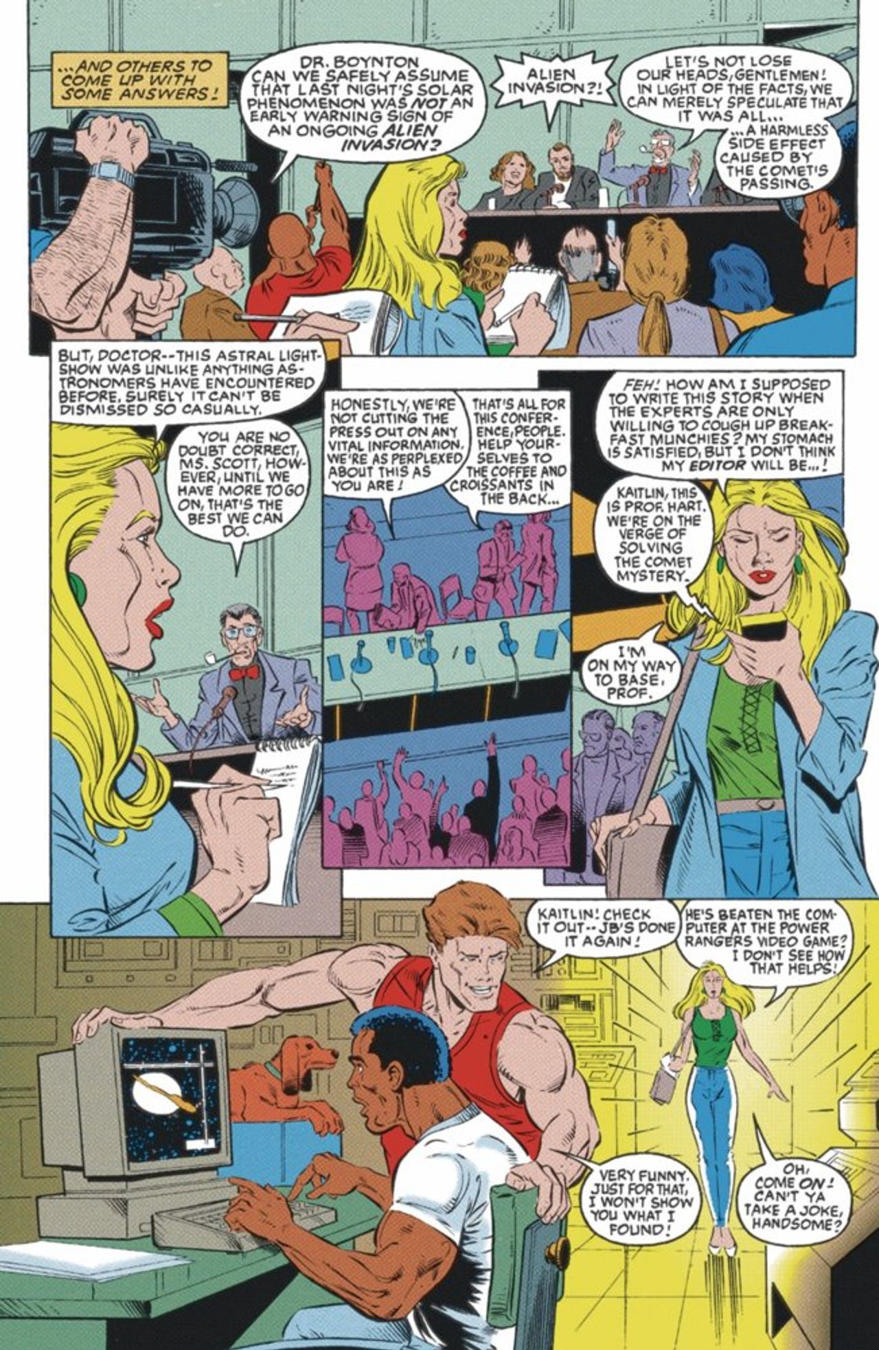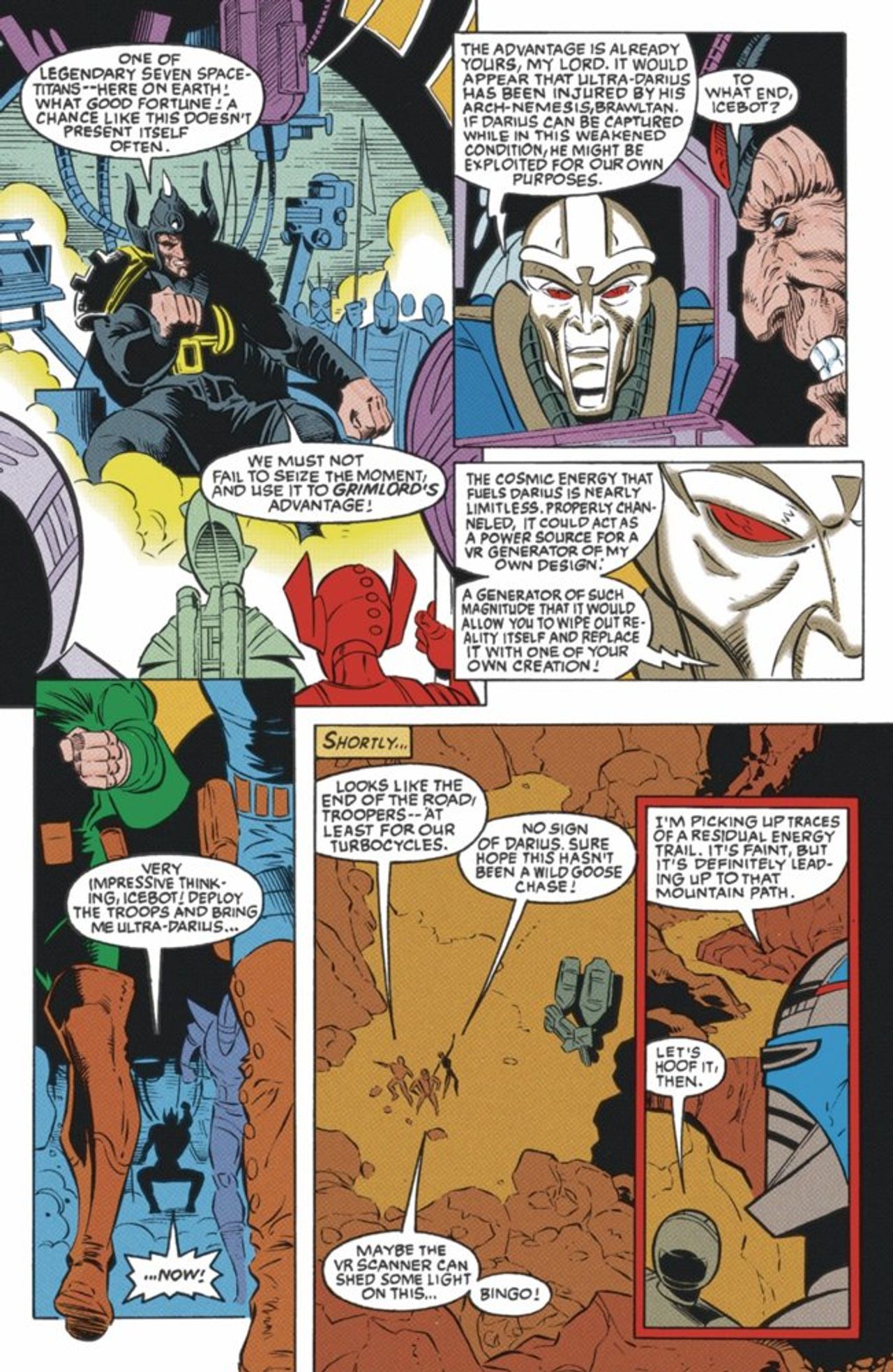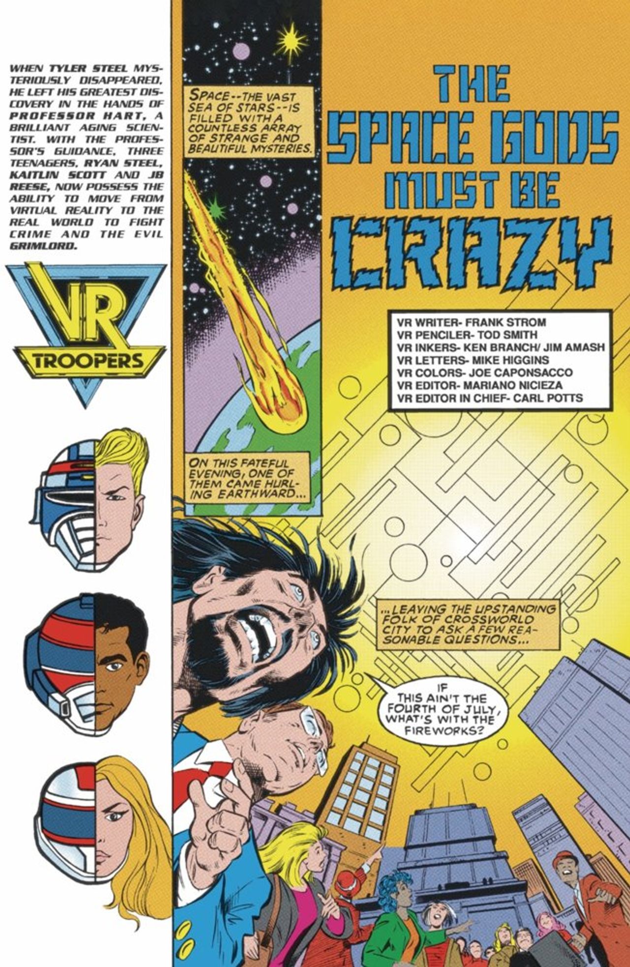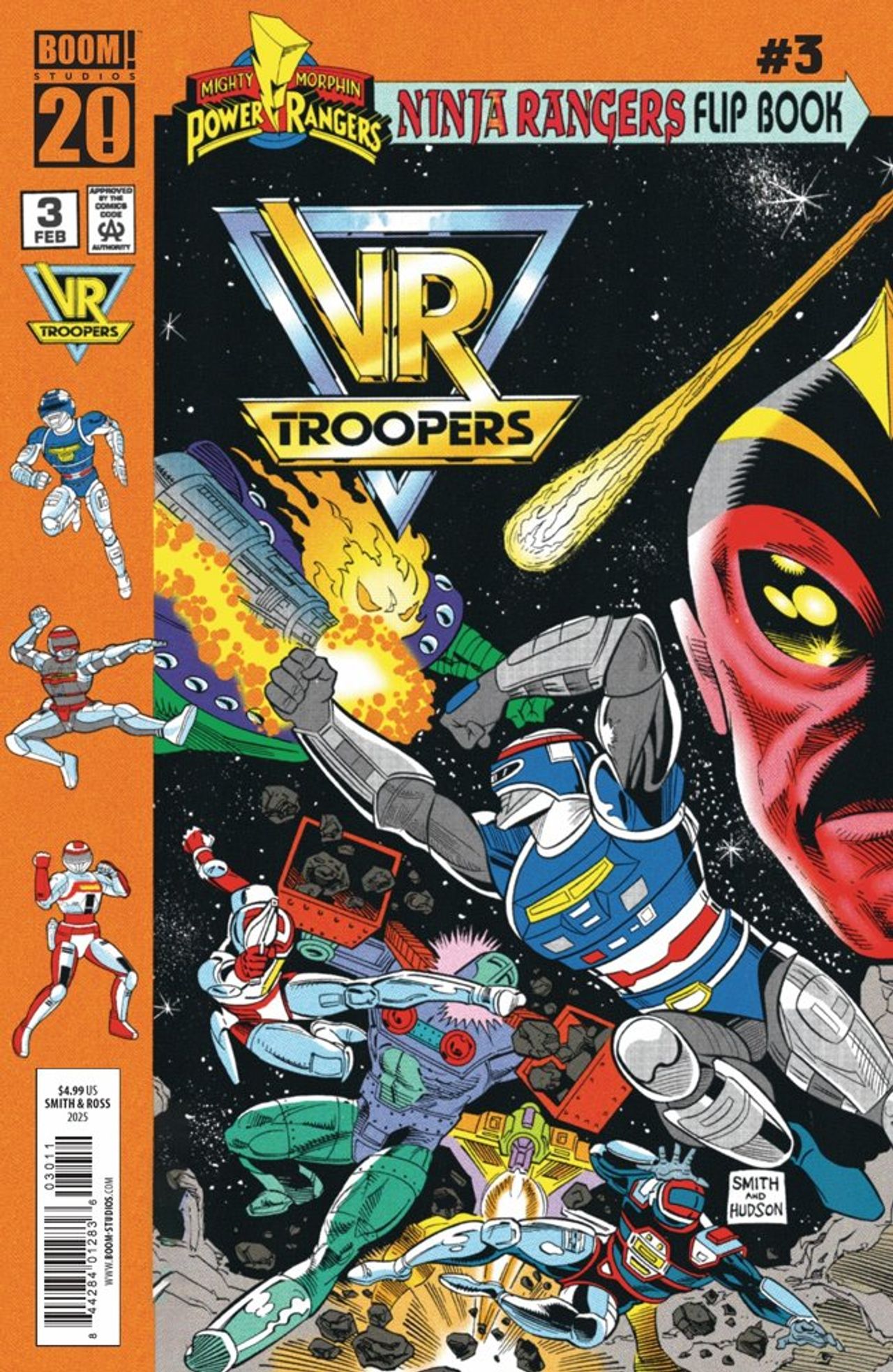The battle for Earth—and virtual reality—continues! It's another classic flipbook showdown as the Mighty Morphin Power Rangers and VR Troopers battle across two explosive adventures! In "Dark Thunder," Lord Zedd assembles a fearsome new Dark Ranger team to rebuild a long forgotten Zord and eliminate the Ninja Rangers once and for all.On the flip side, the VR Troopers spring into action in "The Space Gods Must Be Crazy" when a powerful alien crash-lands on Earth and becomes trapped behind the virtual reality barrier.