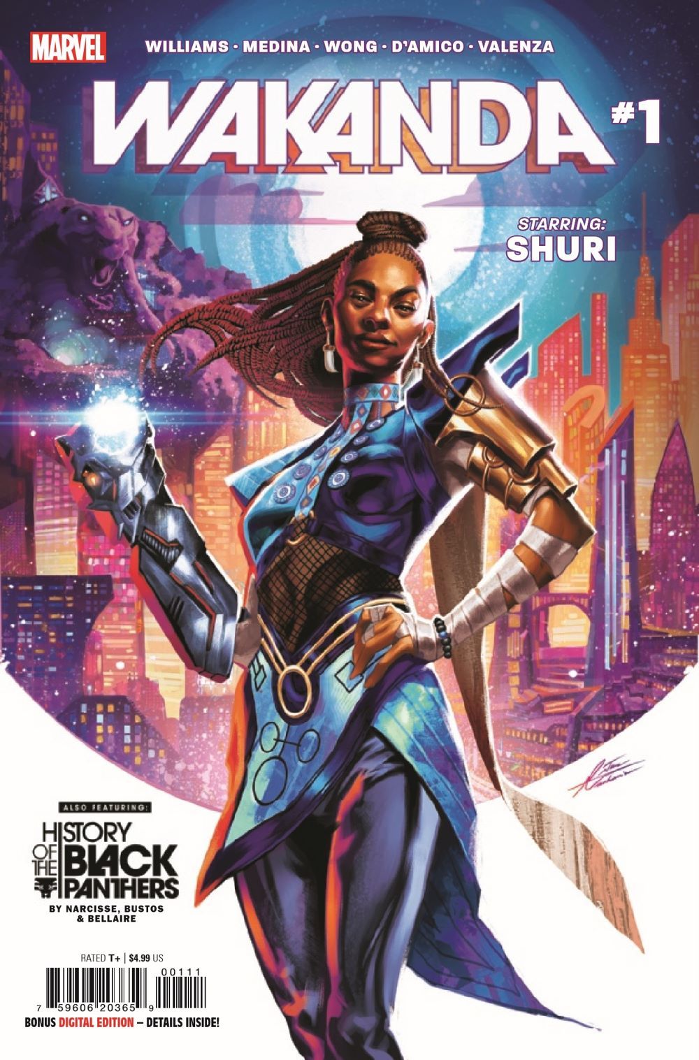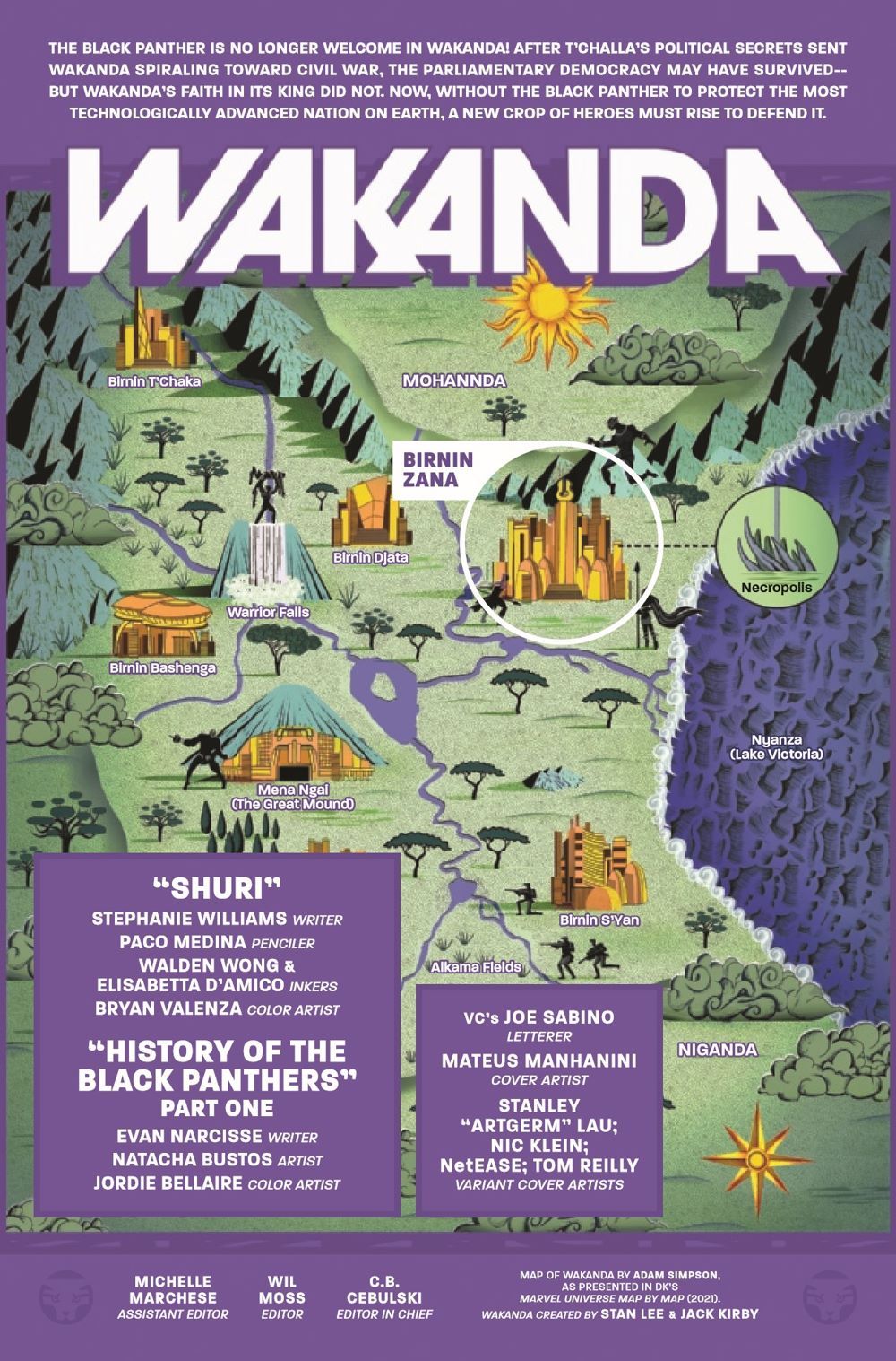 THE BLACK PANTHER IS NO LONGER WELCOME IN WAKANDA! Who is this proud nation without its king? This exciting new miniseries answers that question as each issue spotlights a different fan-favorite Wakandan character. First up: Shuri proves that being without the Black Panther doesn't mean Wakanda is without heroes to protect it - and that there is a reason she too once wielded the power. Plus, part one of the "History of the Black Panthers" backup story, providing for the first time anywhere a definitive overview of every Wakandan who has ever held the mantle of the Black Panther!
