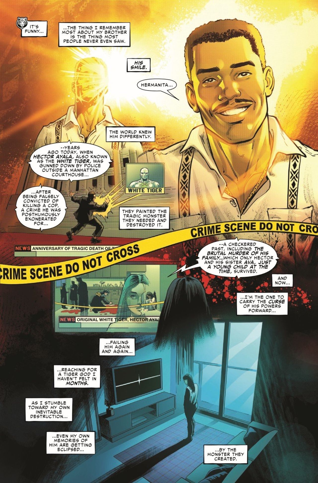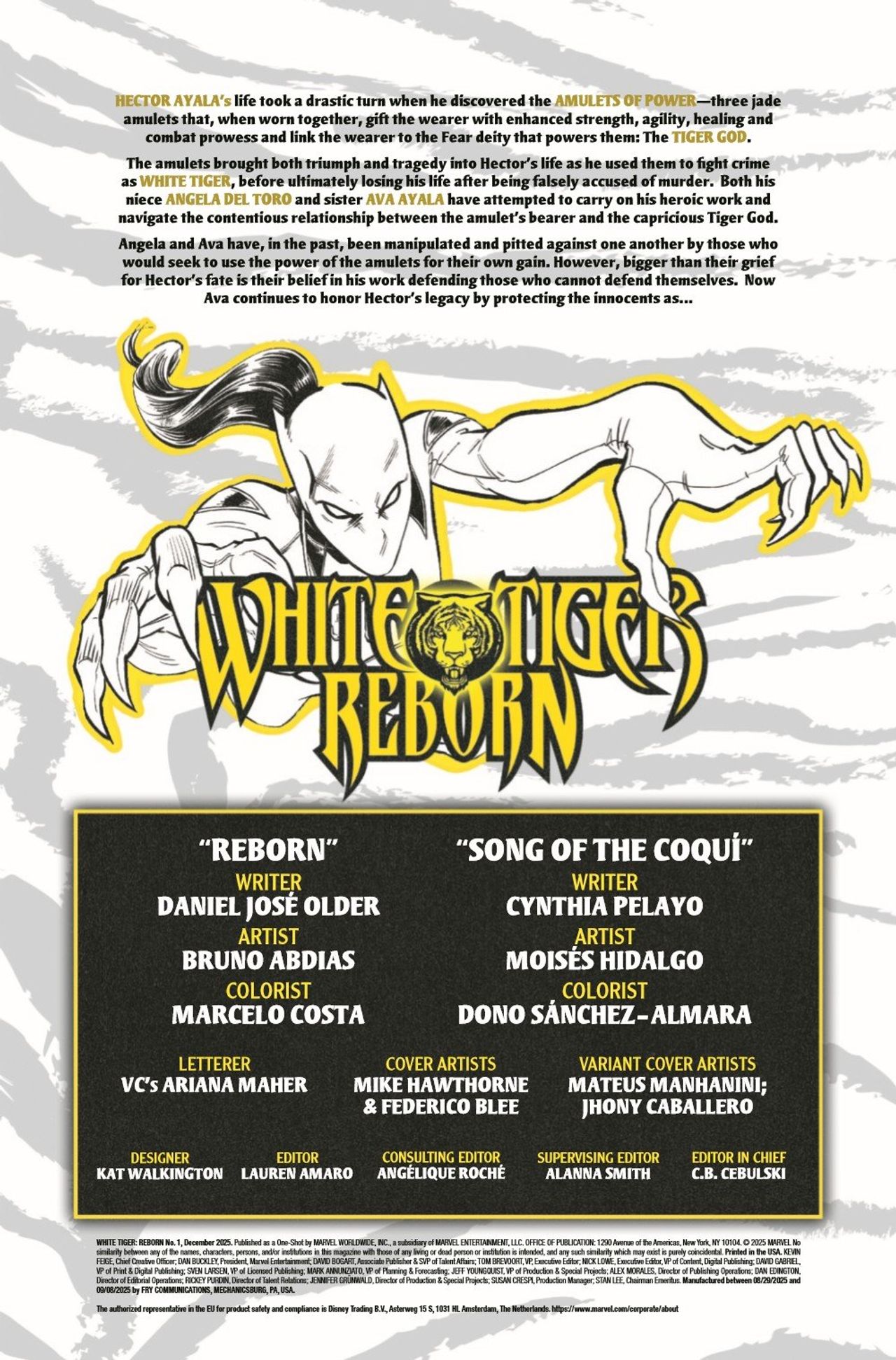 THE RETURN OF THE WHITE TIGER! Ava Ayala is the current wielder of the powers of the White Tiger, bearing the amulet of power that imbue its host with a connection to mystical power and martial arts prowess. As Ava returns to her old stomping grounds to protect the innocent, she becomes embroiled in a mystery that forces her to confront her family's murder and convoluted history linking them to the White Tiger mantle as Ava is brought face-to-face with - Hector Ayala, her dead brother and the original White Tiger?! In this special, celebrating Hispanic and Latin America Heritage Month, superstar writer Daniel José Older uncovers never-before-seen moments of the White Tiger's history and propels Ava into a new era as she reforges her link to the Tiger God and makes the mantle her own in this gripping tale! Plus, don't miss out the Marvel debut of Bram Stroker award winner, Cynthia Pelayo, in this action-packed special celebrating the legacy of American Comic's first Latin Hero!
