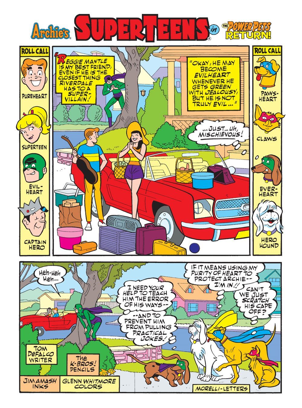 Then, in "The Power Pets Return!" Archie's dog Vader has noticed that while the Superteens often work together, Evilheart (Reggie) enjoys playing practical jokes on Pureheart (Archie). Trying to steer Reggie in the right direction, Vader enlists the other Power Pets to help him prevent these practical jokes once and for all!