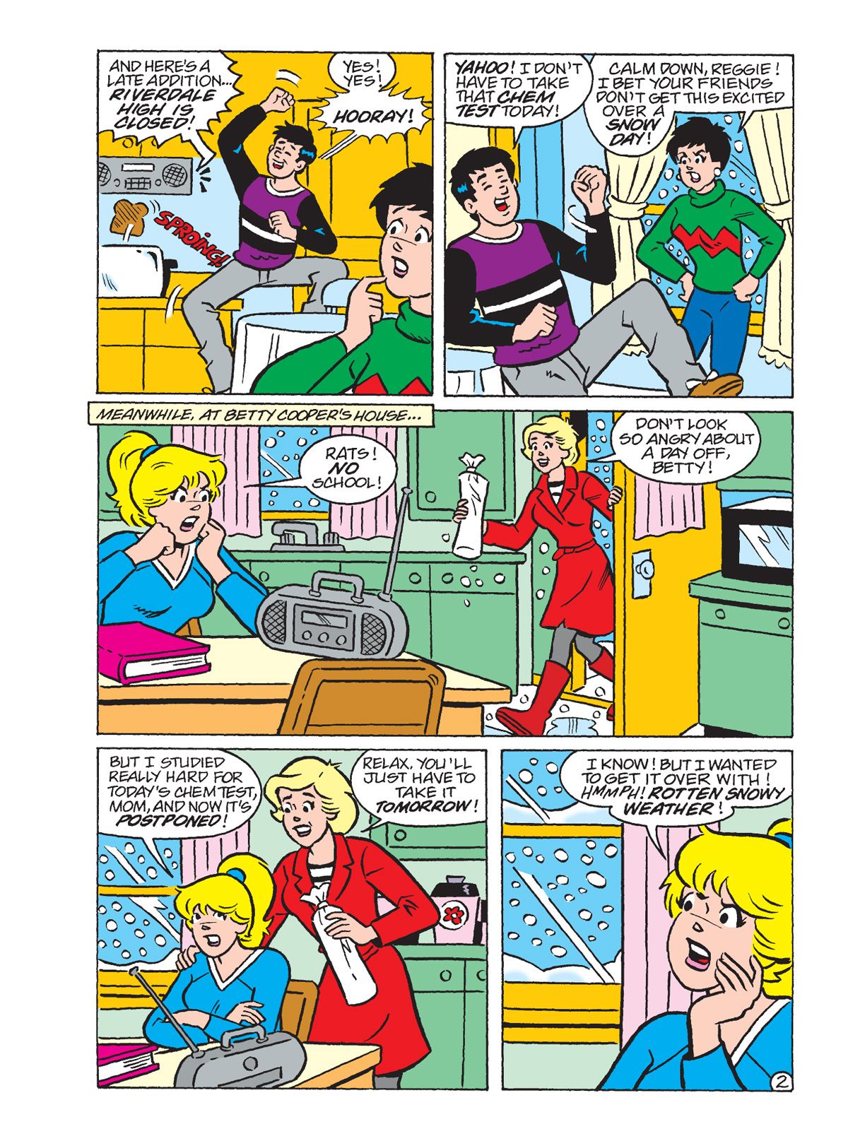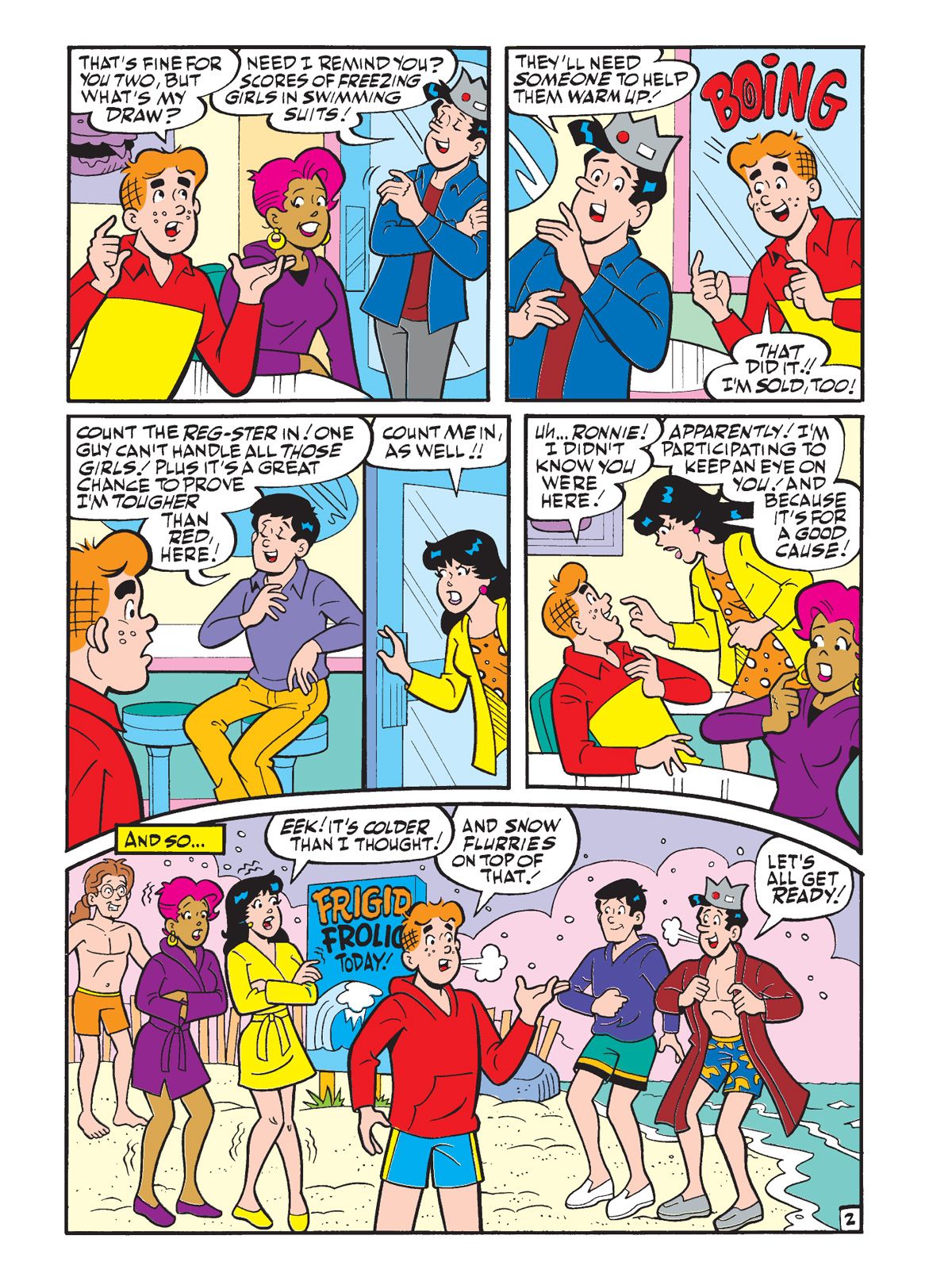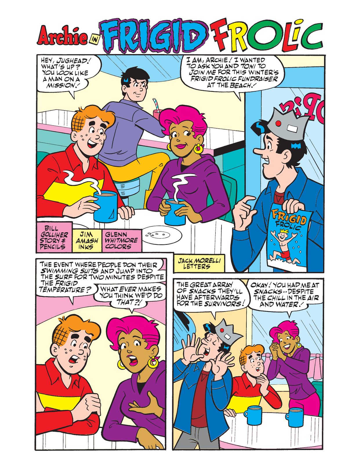 THREE BRAND NEW STORIES! First, in "Frigid Frolic," Jughead convinces Archie and Toni to join in a Frigid Frolic Fundraiser activity at the beach, (that's an ocean swim in the dead of winter!) mainly because he hears there's going to be great snacks afterwards. This gets Toni's attention and Archie's draw is the chance to meet some new girls. Reggie and Veronica overhear and plan to join in as well to show how tough they can be. Who will be able to withstand the cold and come out the chilly champion?