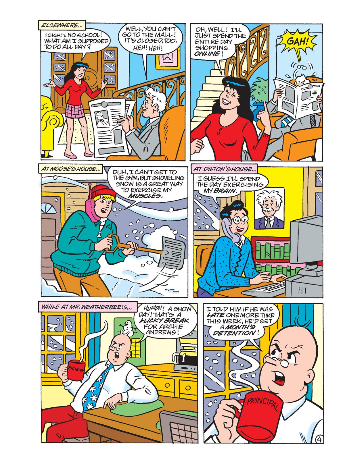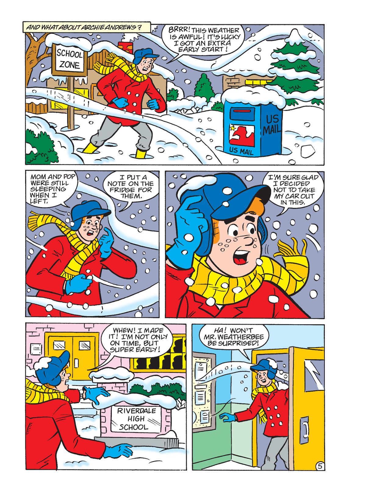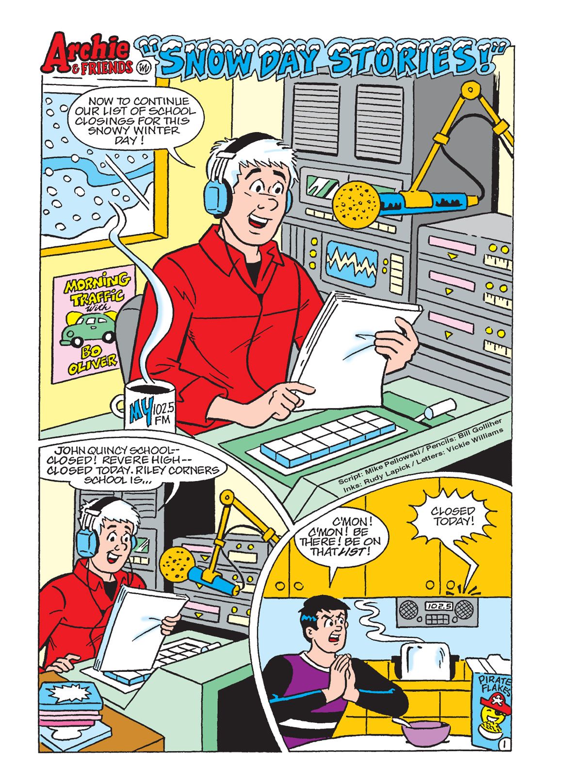 THREE BRAND NEW STORIES! First, in "Frigid Frolic," Jughead convinces Archie and Toni to join in a Frigid Frolic Fundraiser activity at the beach, (that's an ocean swim in the dead of winter!) mainly because he hears there's going to be great snacks afterwards. This gets Toni's attention and Archie's draw is the chance to meet some new girls. Reggie and Veronica overhear and plan to join in as well to show how tough they can be. Who will be able to withstand the cold and come out the chilly champion?