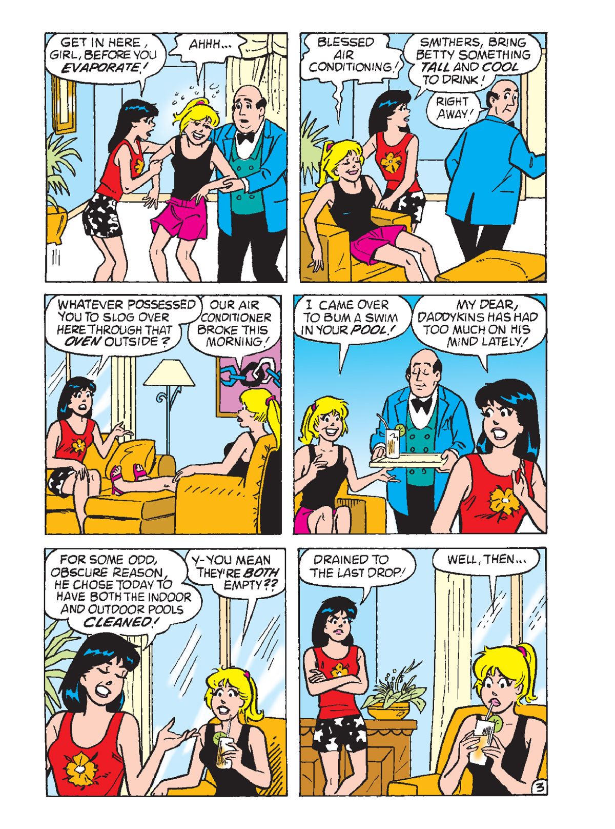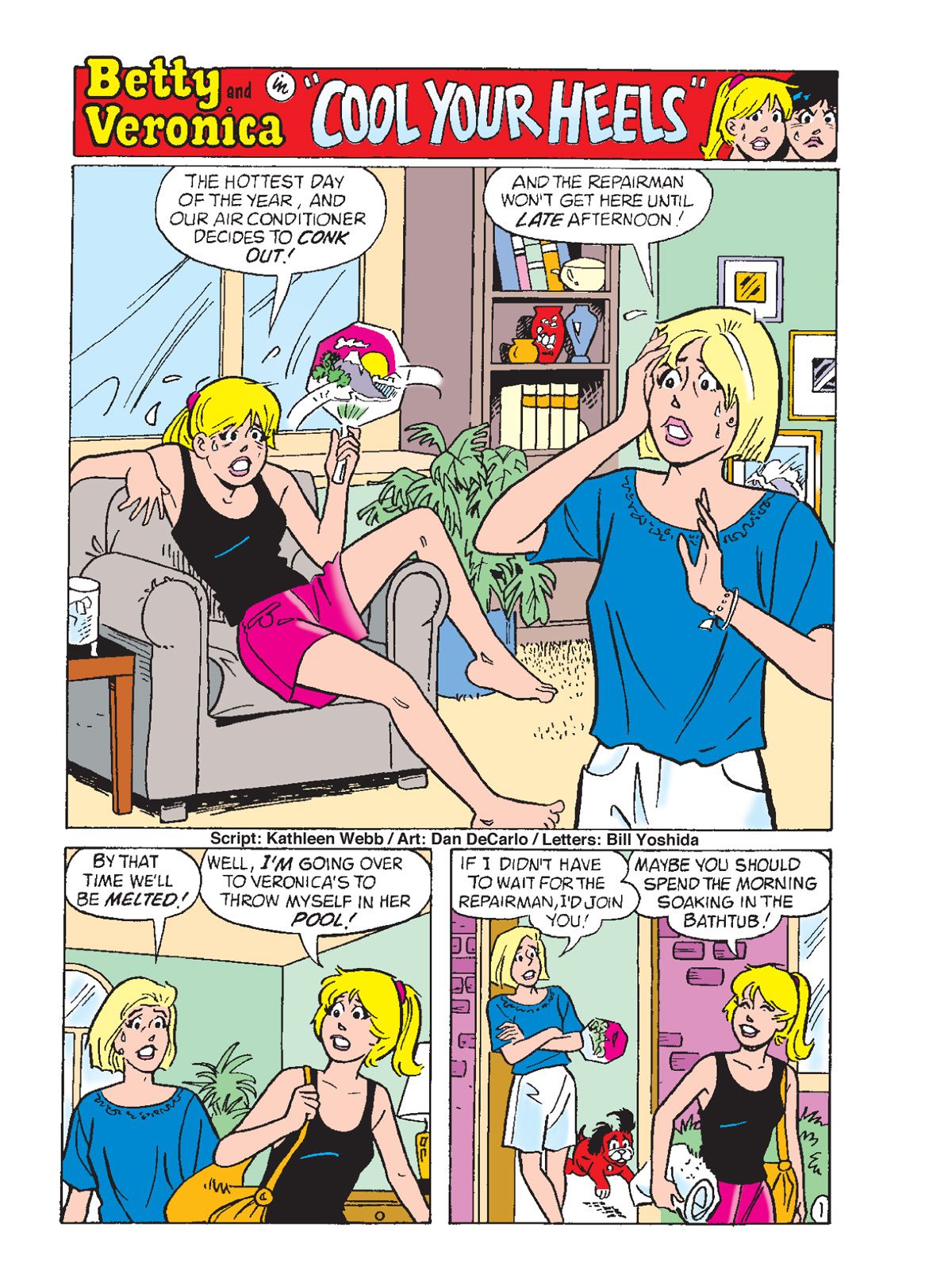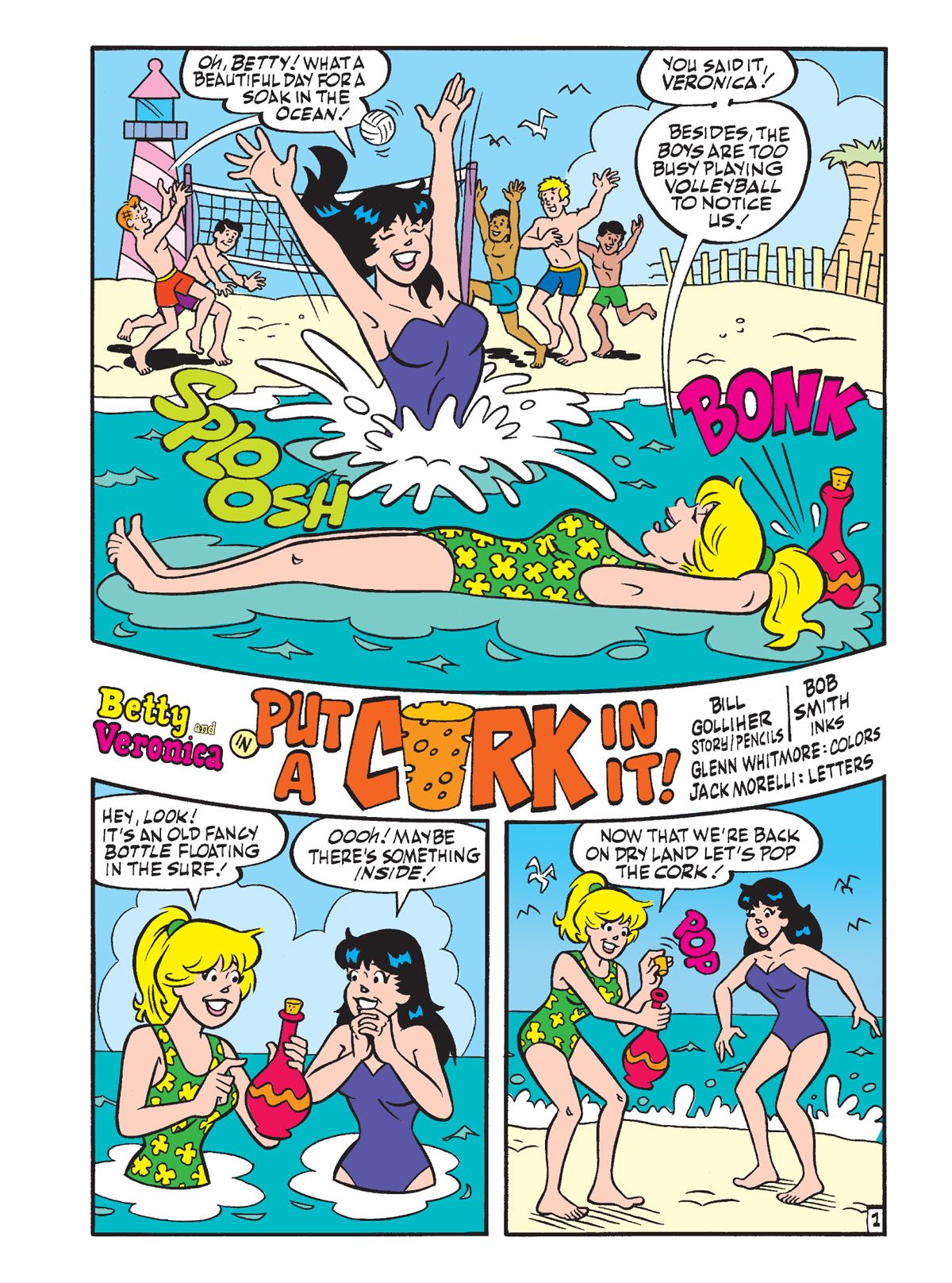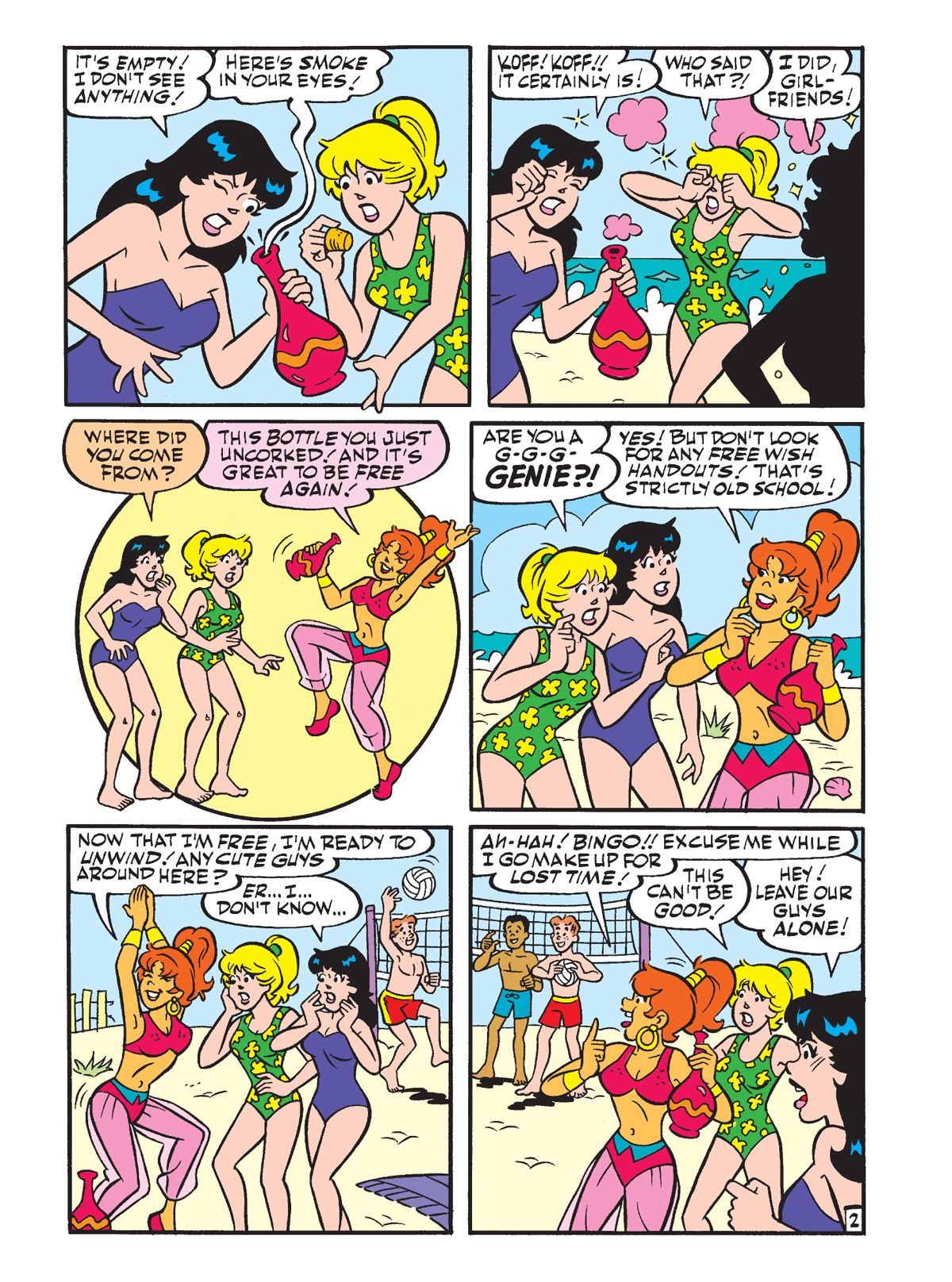TWO BRAND NEW STORIES: First, in "Put a Cork in it!" Betty and Veronica discover a bottle that washes up on the beach. Thinking there may a note inside, they open it… and a beautiful genie emerges! She doesn't offer to grant them any wishes but just wants to have a good time after being bottled up for ages. It would be a lot of fun… until she sets her sights on Archie! Can Betty & Veronica successfully get the genie BACK into her bottle?