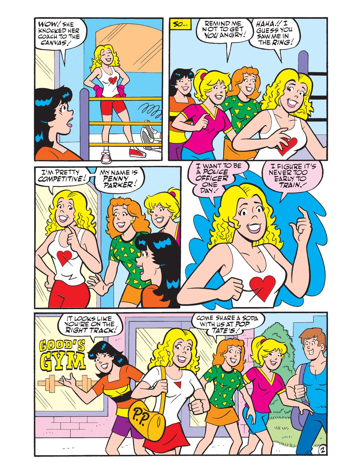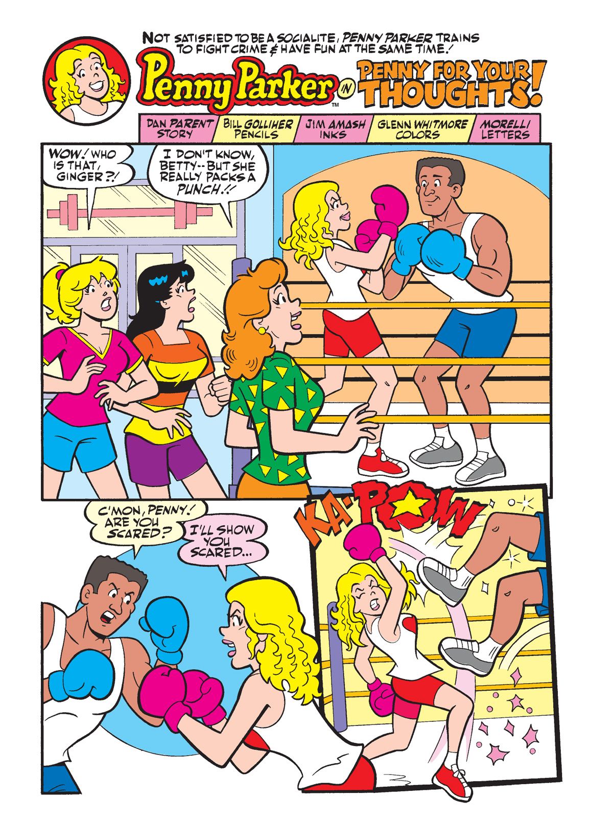 Then, in "Penny for your Thoughts," Betty, Veronica, and Ginger are amazed by Penny Parker's physical prowess at the gym. But Veronica's got other matters on her mind—like who could possibly be her replacement at this year's debutante ball! What kind of competition could the heiress be in for?